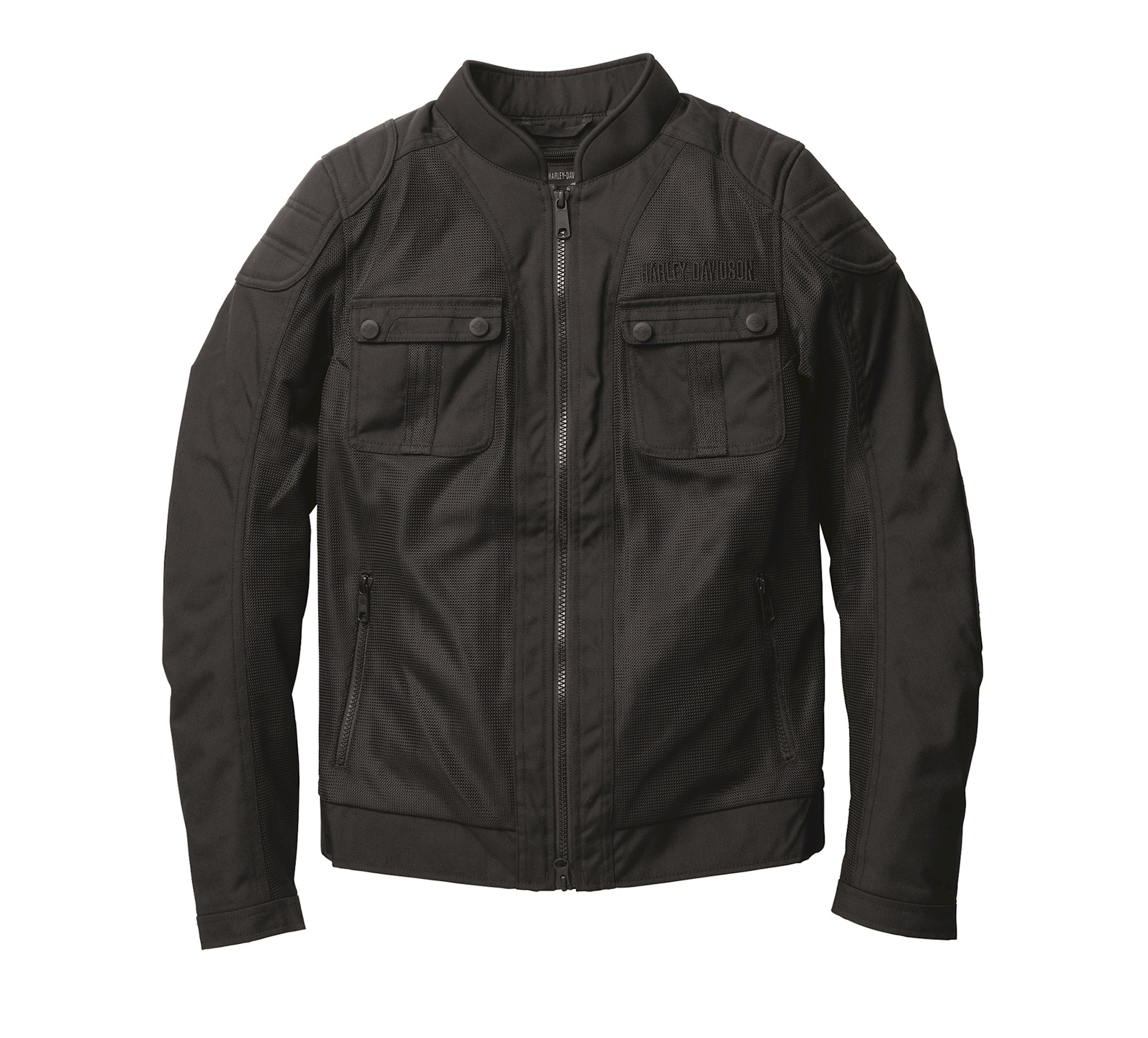 Harley-Davidson women's textile summer jacket - ref. 98180-22EW Hard knit 100% polyester. 100% polyester mesh lining. Detachable zipped windproof liner. Pre-curved sleeves. Stretch side panels. Officer collar. Adjustable zipped cuffs. Two-way zip closure. Two zippered handwarmer pockets. Cargo chest pockets. One inside pocket. Protections on elbows and shoulders. Slot for back protector (ref. 98105-22VR sold separately). 3M reflective piping. Embroidered Harley-Davidson® graphic on left chest and Bar & Shield® on upper reflective back.
