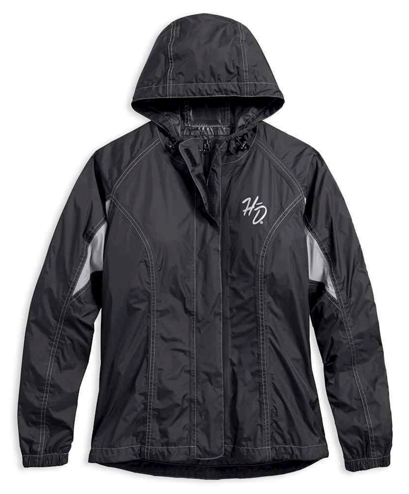 Harley-Davidson® Women's Reflective Rain Suit, 98204-17VW. Jacket features waterproof and breathable 100% nylon taffeta. Bungee cord and toggle hood can be folded down and secured when not in use. Zipper front with hook-and-loop storm flap. Bungee cord toggle and hem. Pants feature waterproof and breathable 100% nylon taffeta with heat-resistant shields on lower inner legs. Gusseted leg opening with hook-and-loop storm flap and stirrups. 3M™ Scotchlite™ Reflective Material piping and graphics. Storage bag included.
