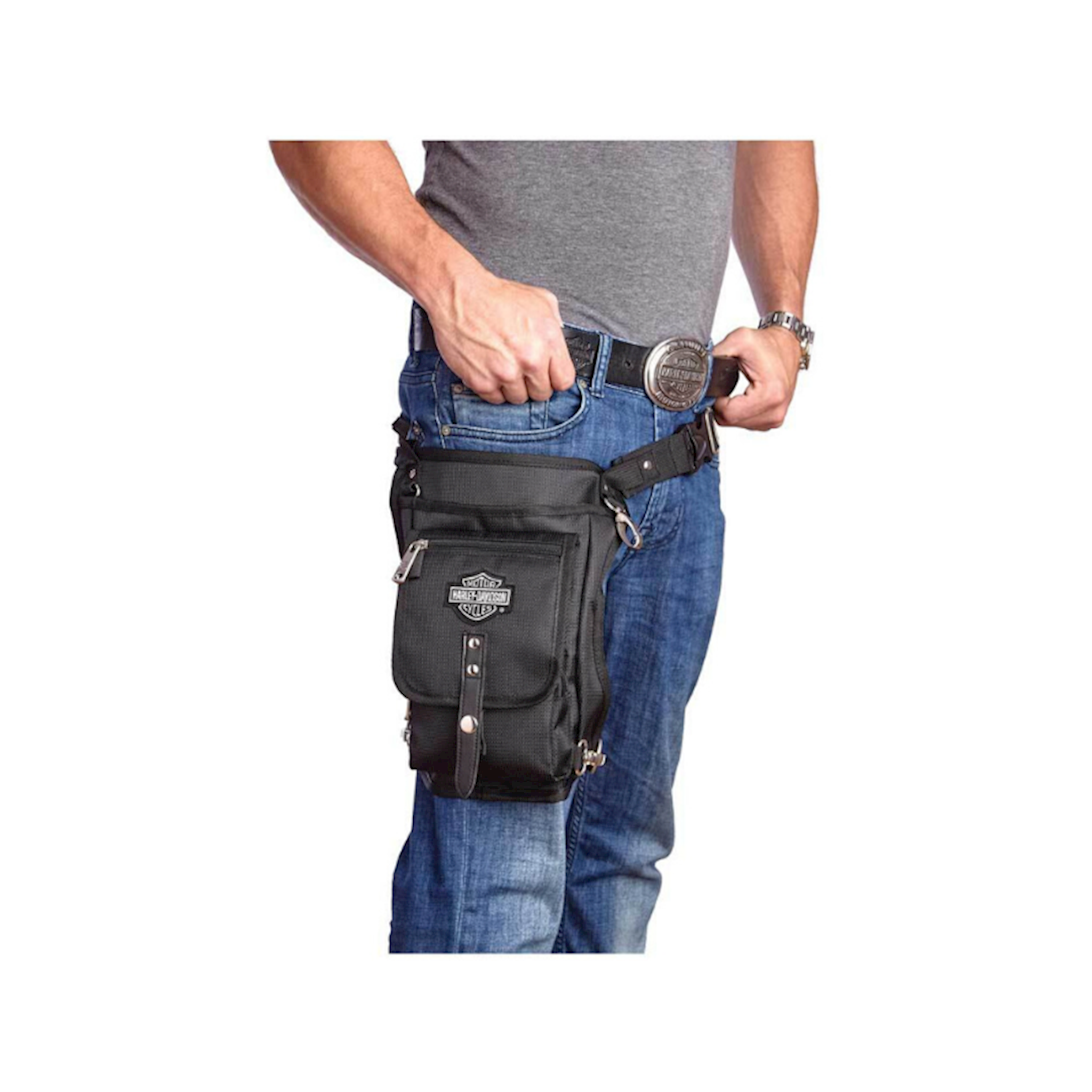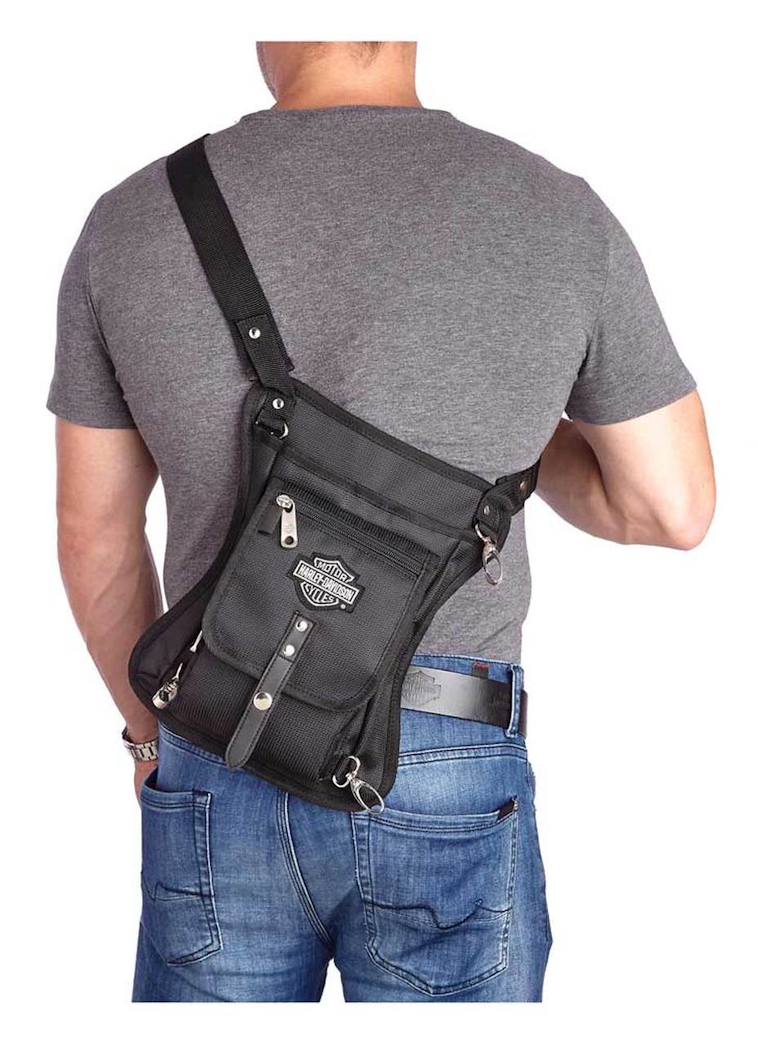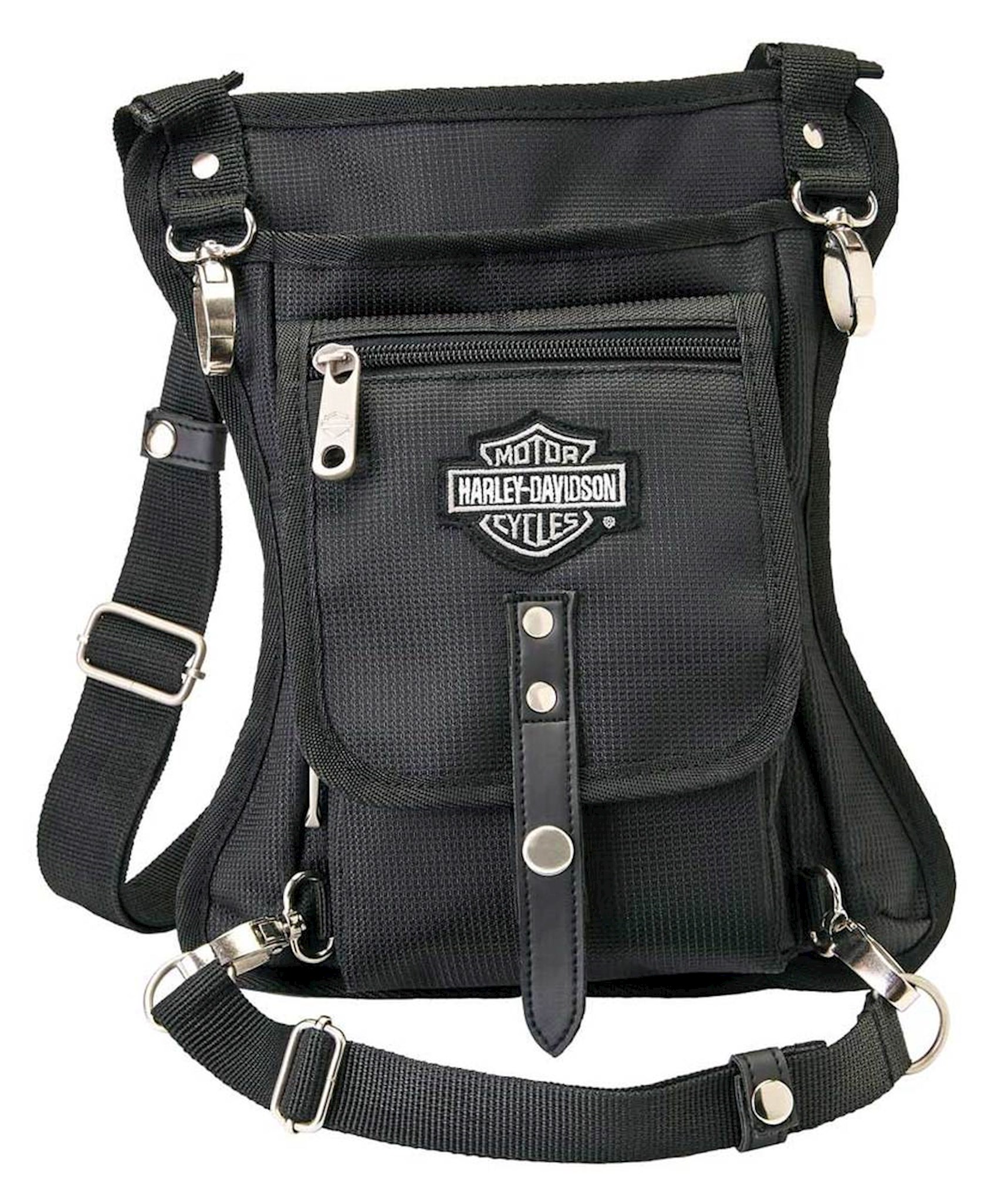 Harley-Davidson® Unisex “Side Slinger” 2-in-1 Bag. 2-IN-1 can be worn on your leg like a holster or over your shoulder as a sling bag. Versatile straps can be worn over leg, waist or shoulder. Numerous secured interior compartments. Made from light-weight, water-resistant box weave polyester. Size: 12″ x 10″.
