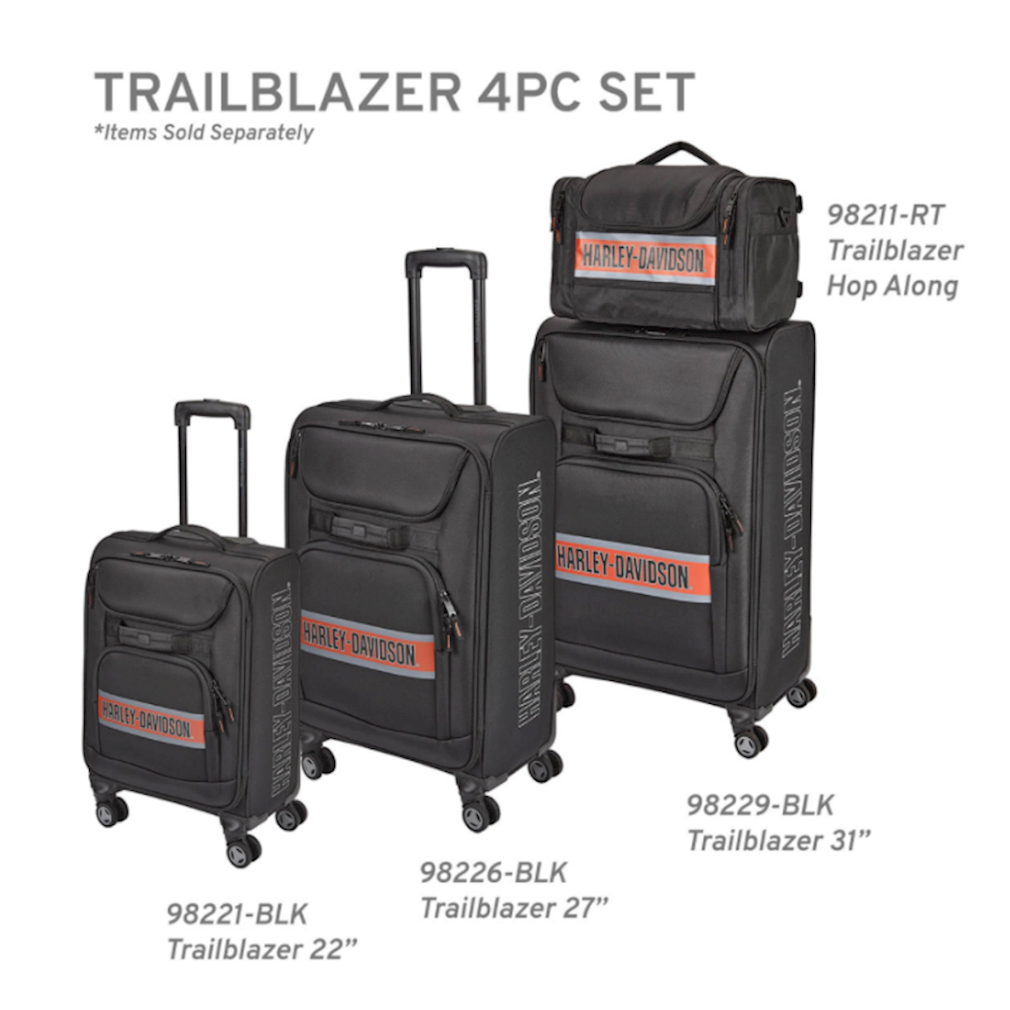 Harley-Davidson® Trailblazer Wheeled Luggage - Rust Vintage. Stylish multi-pocket luggage. Sleek, padded pockets and panels. Foam backed body fabric for a sleek shape. Features Signature Harley-Davidson® map interior lining. Ultra lightweight and super strong. Top, side and front handles for easy lifting. Hidden telescoping coordinating black pull handles. Coordinating silver double spinner wheels. Comes in three different sizes: Large Pullman 31" - Size: 31" x 19.5" x 10.5"