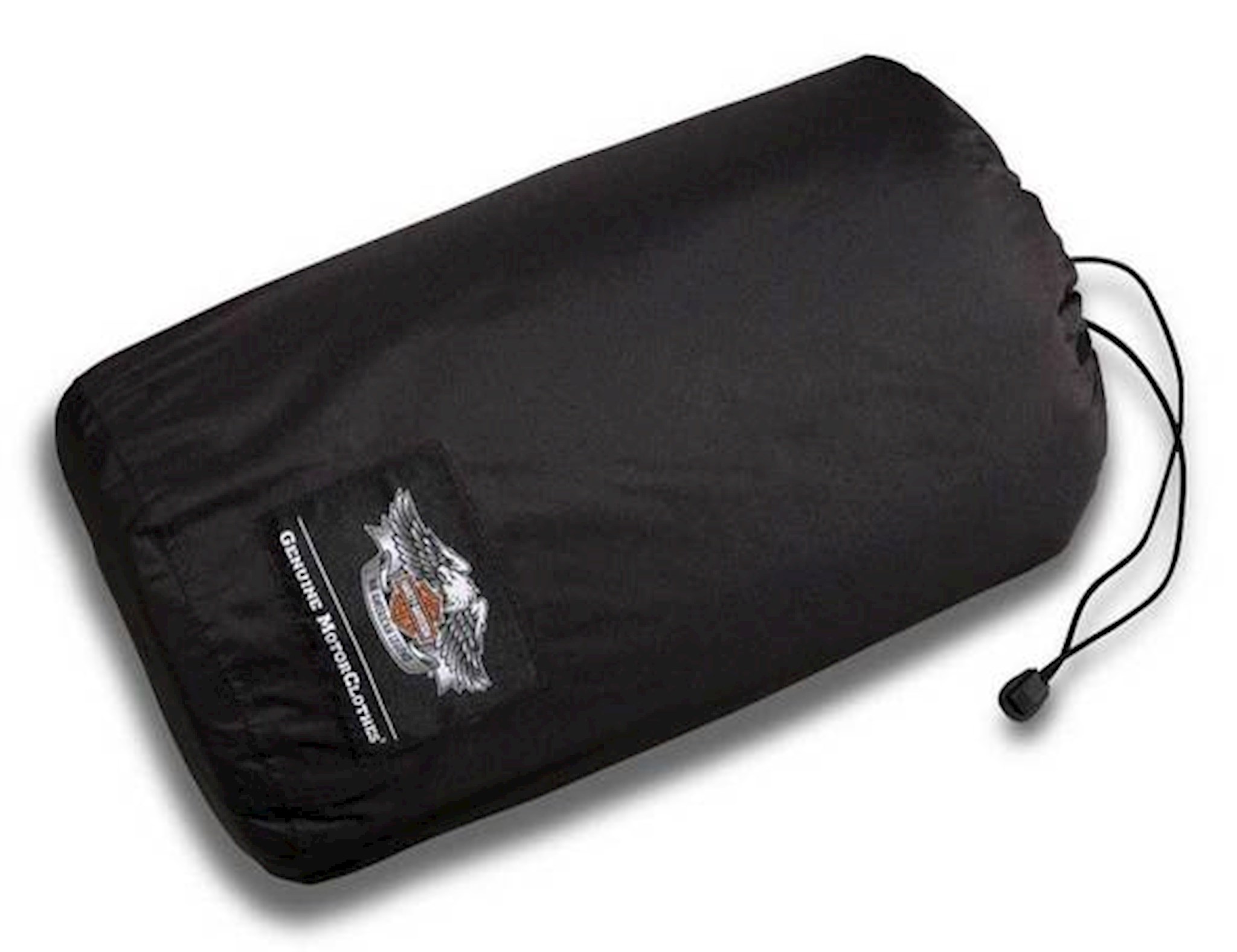 Harley-Davidson® Men's Full Speed Reflective Rainsuit, Black/Gray. 98336-15VM. Be prepared for any change in the forecast with the Full Speed Reflective Rainsuit. Besides waterproofness, one of the key features in a quality suit is reflective material. We also incorporate essential features like pockets and a fold-under hood. More important callouts are listed in the bullets. Jacket features waterproof 100% nylon ripstop with polyester mesh lining. Bungee cord and toggle hood folds under the mock neck collar. Two-way zipper front with hook-and-loop storm flap. Elastic cuffs with adjustable tabs with bungee cord and toggle hem. Two zipper hand-warmer pockets. and one zipper vertical interior pocket. 3M Scotchlite Reflective Material piping, stripes, and graphics. Pants feature waterproof 100% nylon ripstop, elastic waist, heat-resistant shields on lower inner legs, stirrups, leg side zipper to knee, and 3M Scotchlite Reflective Material piping. Storage bag included.