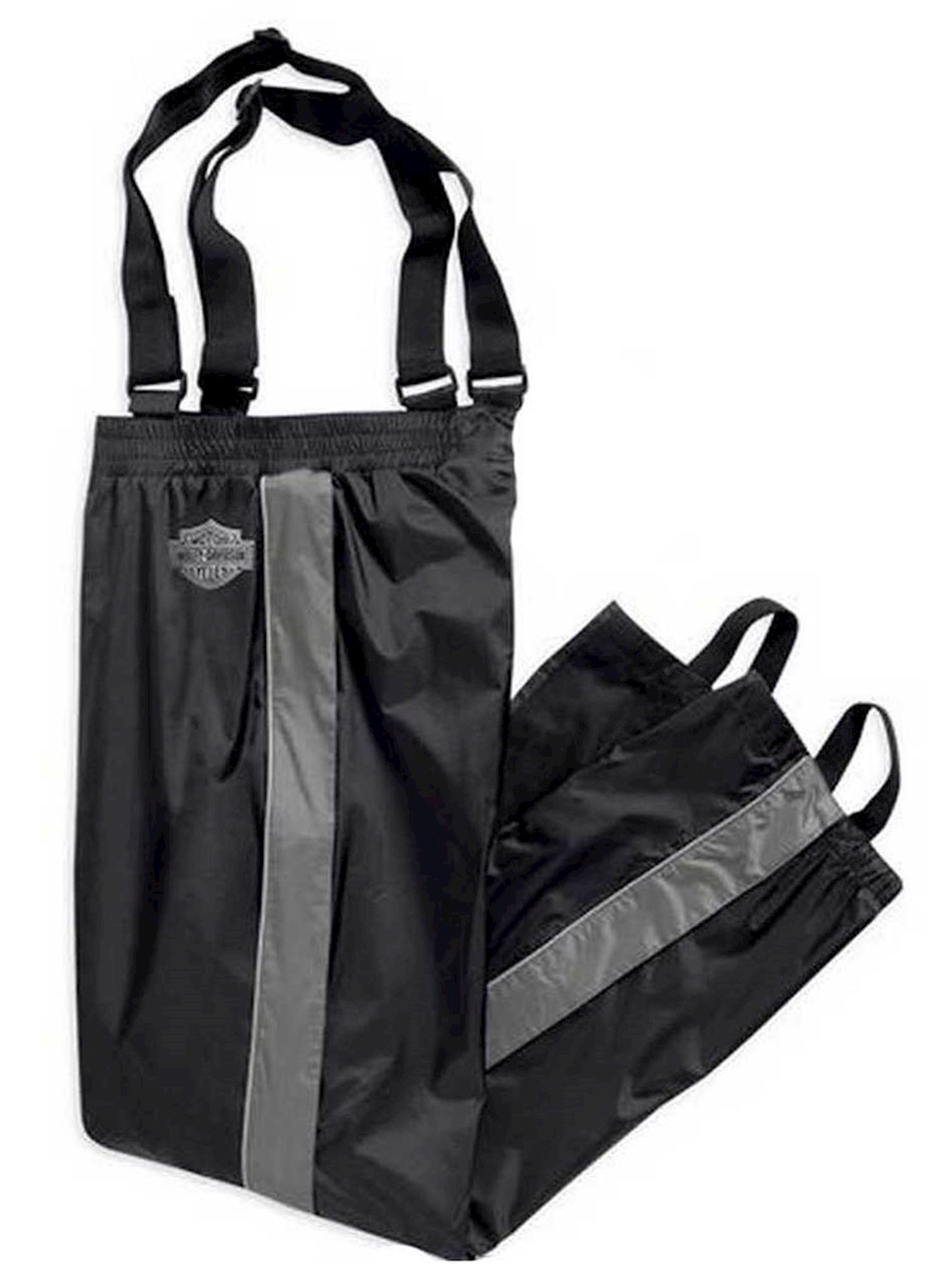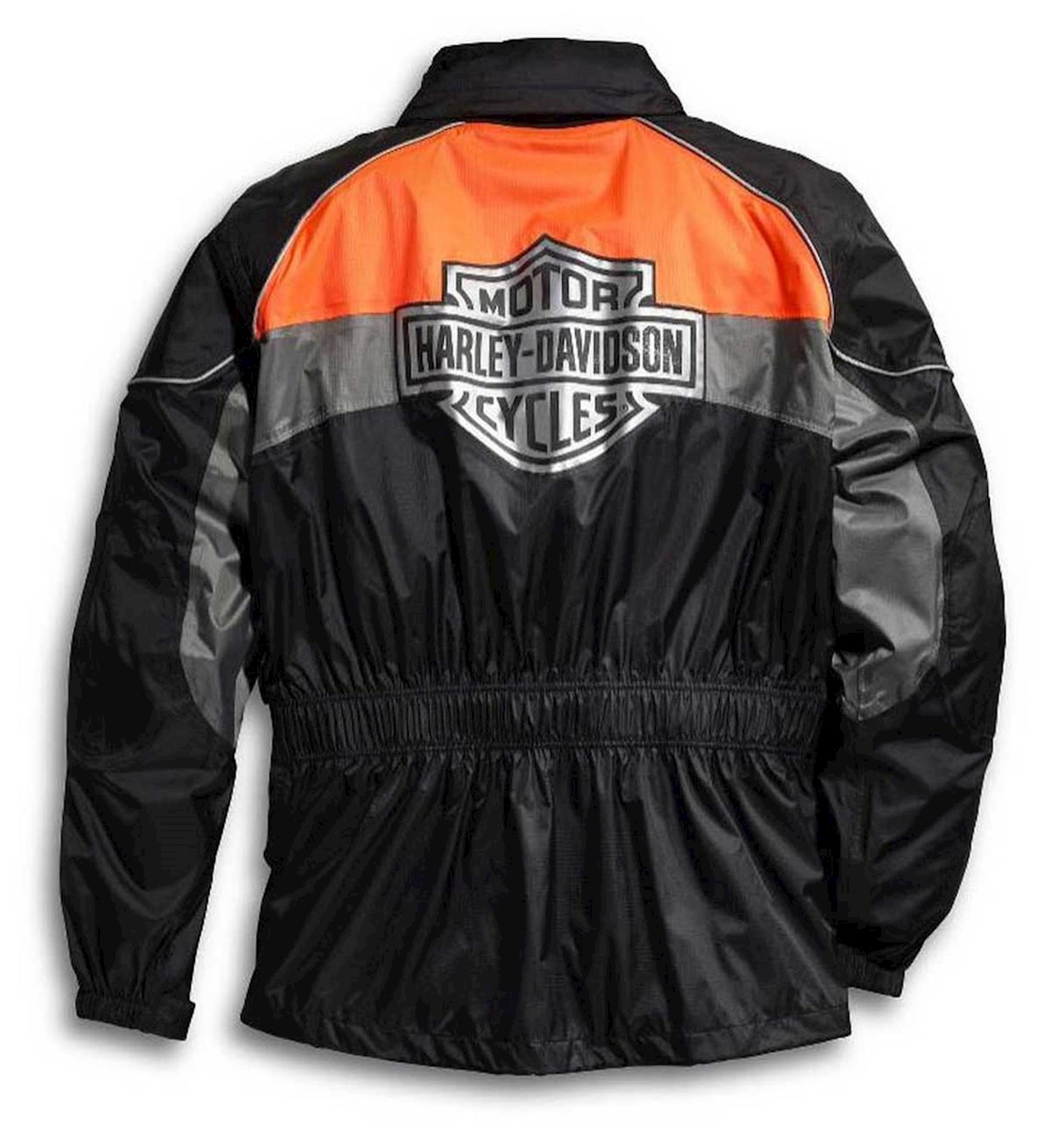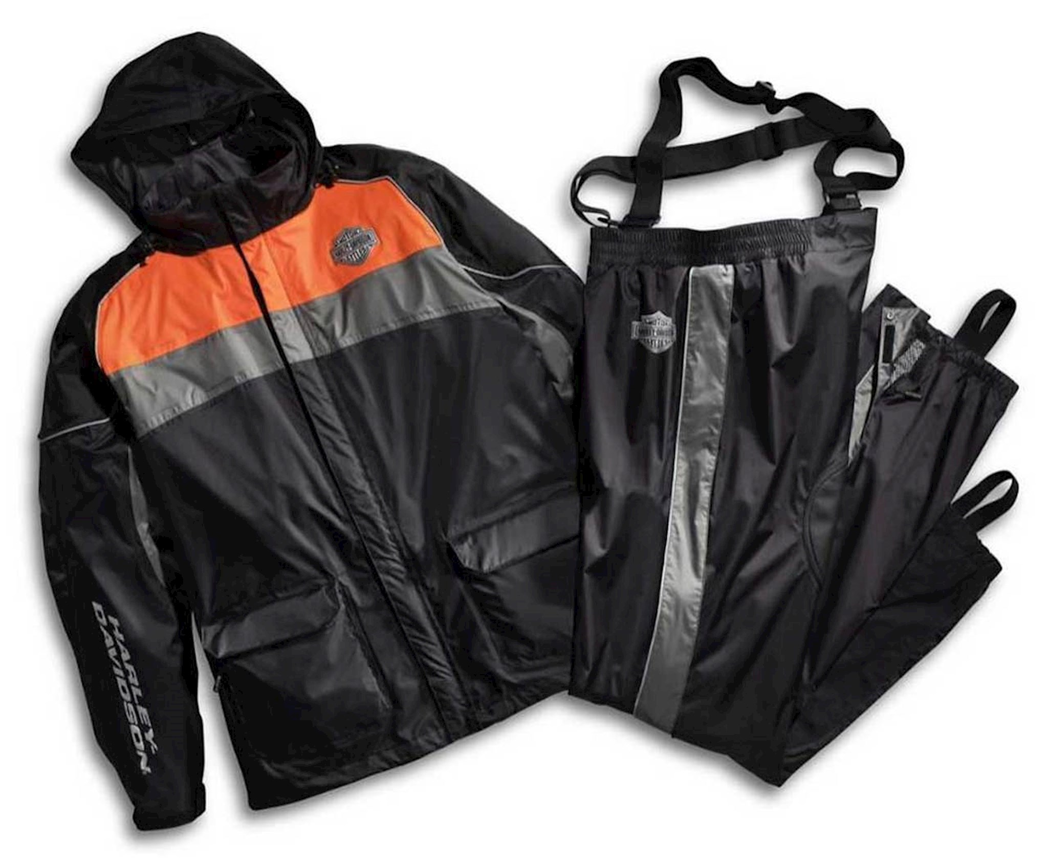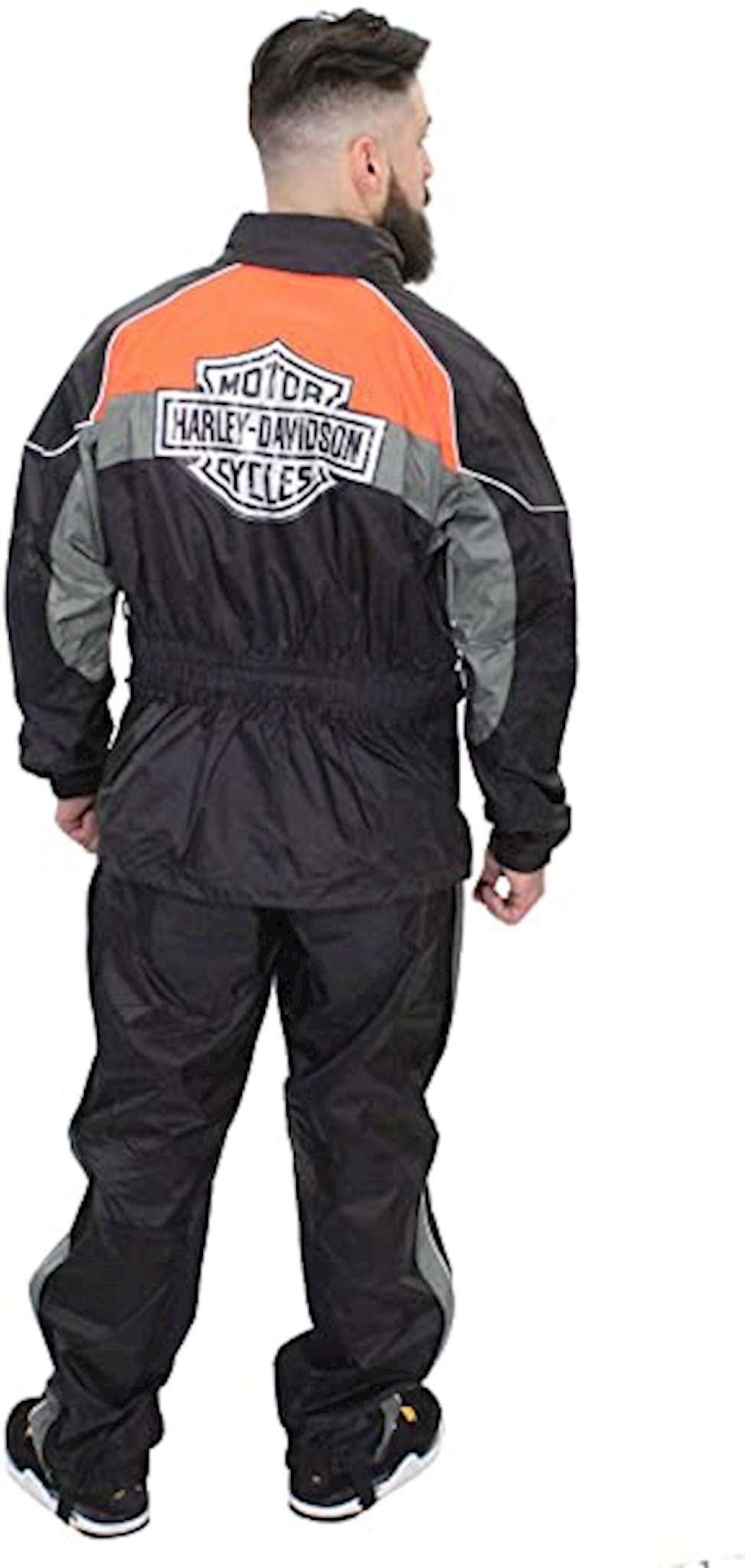 Harley-Davidson® Men's High Tail Colorblocked Hi-Vis Rainsuit, Black/Orange. 98337-15VM. Storm clouds may brew at the bend in the road or lurk on the other side of the mountain. So keep the High Tail Colorblocked Hi-Vis Rain Suit on your travel list as insurance. Blaze Orange plus reflective material aid in rider presence –– a top feature of any motorcycle rainsuit. Read more below. Jacket feature waterproof 100% nylon ripstop with polyester mesh lining. Hood folds into neck flap. Storm-flap zipper front with hook and loop tab closures. Elastic cuffs with adjustable tabs with bungee cord and toggle hem. Two zipper hand-warmer pockets. 3M Scotchlite Reflective Material piping for additional visibility. Pants feature waterproof 100% nylon ripstop, heat-resistant textile shields on lower inner legs, elastic waist, stirrups, removable suspenders, and leg side zipper to knee. Storage bag included.