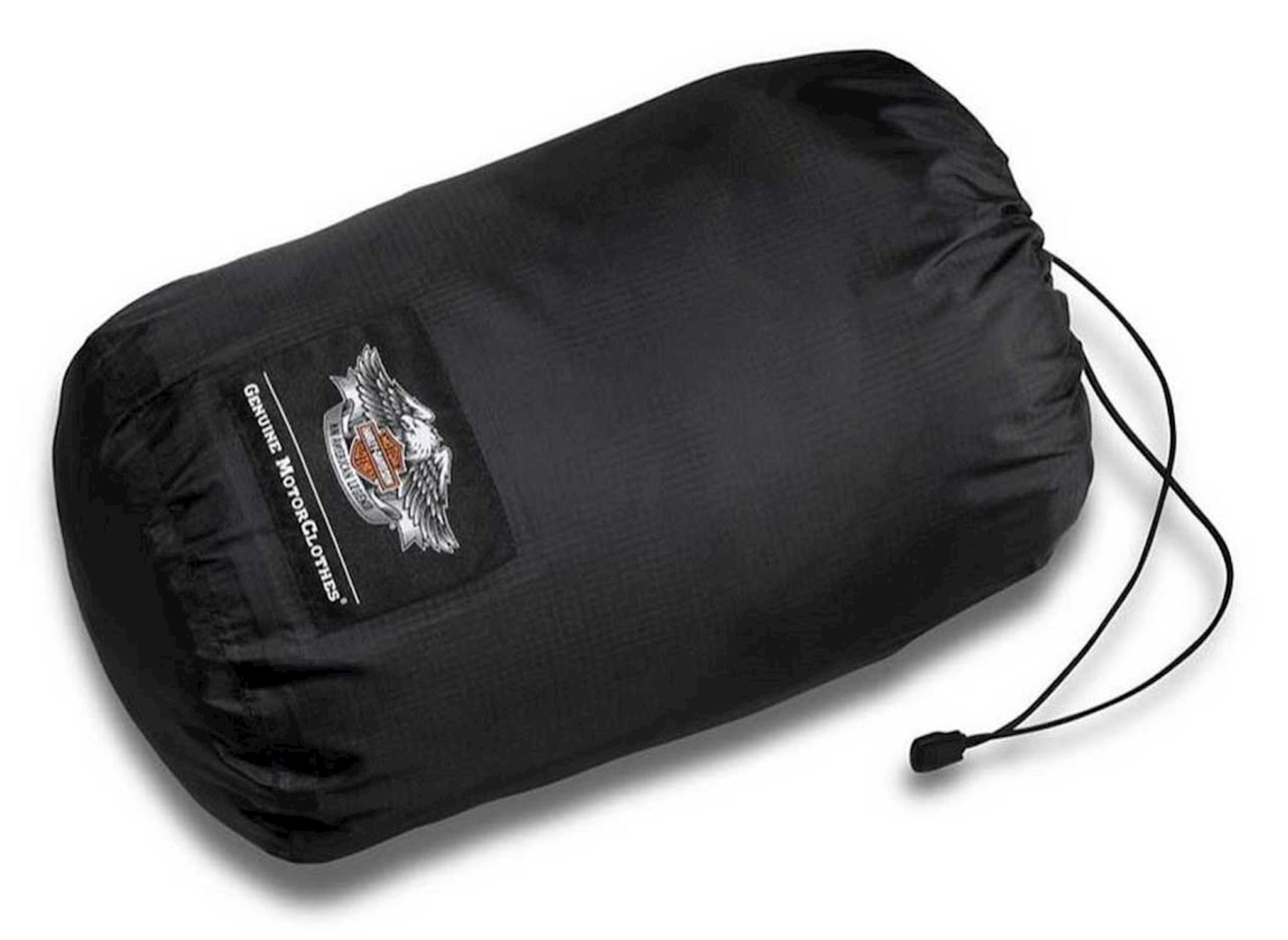 Harley-Davidson® Men's High Tail Colorblocked Hi-Vis Rainsuit, Black/Orange. 98337-15VM. Storm clouds may brew at the bend in the road or lurk on the other side of the mountain. So keep the High Tail Colorblocked Hi-Vis Rain Suit on your travel list as insurance. Blaze Orange plus reflective material aid in rider presence –– a top feature of any motorcycle rainsuit. Read more below. Jacket feature waterproof 100% nylon ripstop with polyester mesh lining. Hood folds into neck flap. Storm-flap zipper front with hook and loop tab closures. Elastic cuffs with adjustable tabs with bungee cord and toggle hem. Two zipper hand-warmer pockets. 3M Scotchlite Reflective Material piping for additional visibility. Pants feature waterproof 100% nylon ripstop, heat-resistant textile shields on lower inner legs, elastic waist, stirrups, removable suspenders, and leg side zipper to knee. Storage bag included.