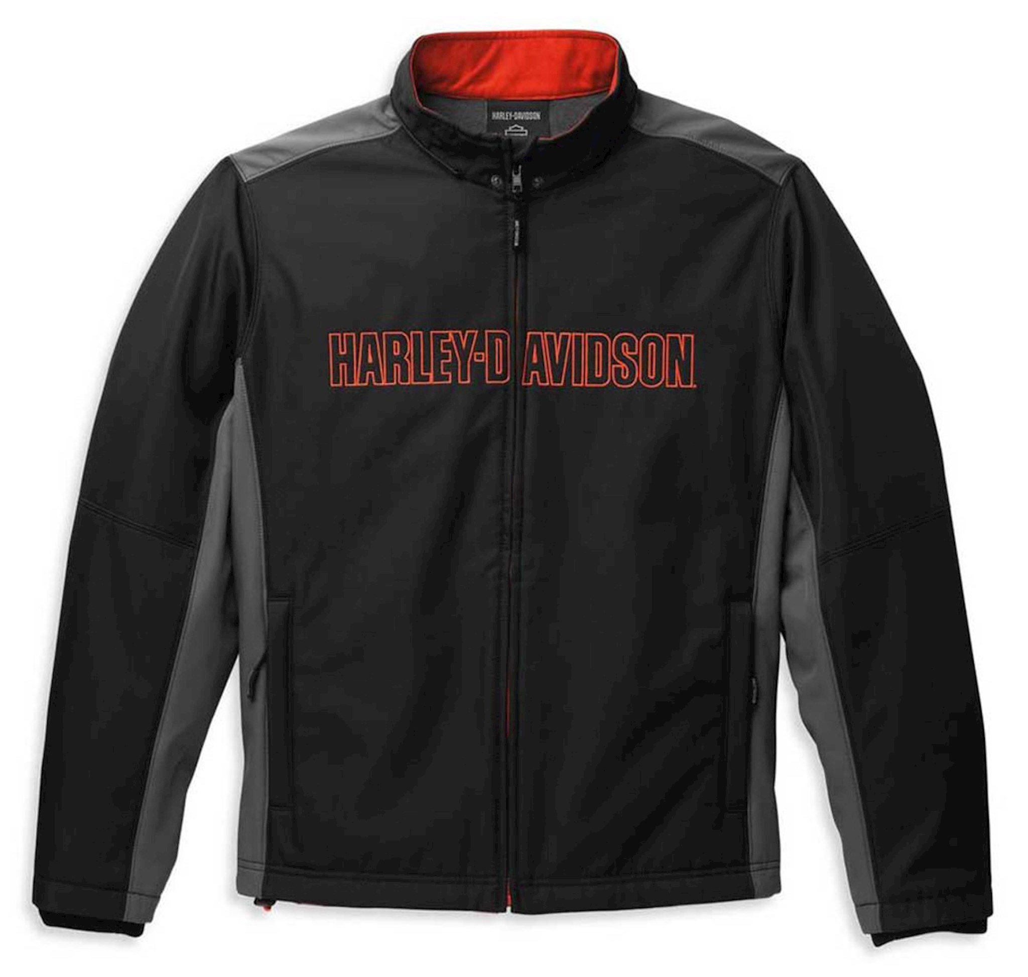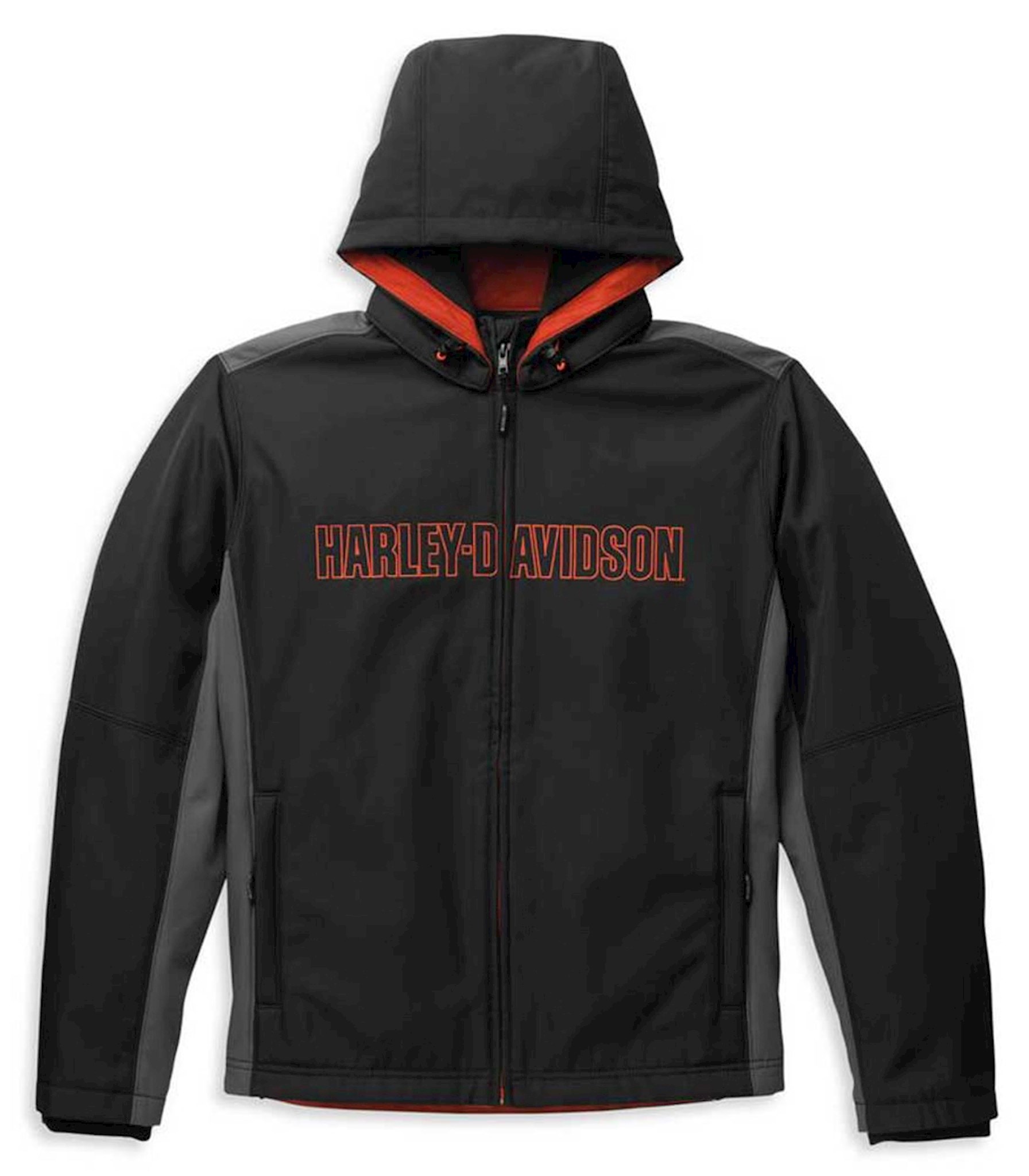 Harley-Davidson® Men's Bar & Shield Hooded Softshell Jacket - Black, 98403-22VM. Made from 100% woven polyester. Crafted from a windproof cut of woven polyester with a removable hood and toggle cord waistband. In addition to its wind-blocking features, this jacket is styled with a pop of contrast from its side panels, back yoke, and inside collar. Zippered front and zippered hand-warmer pockets. Embroidered graphic on front and back.
