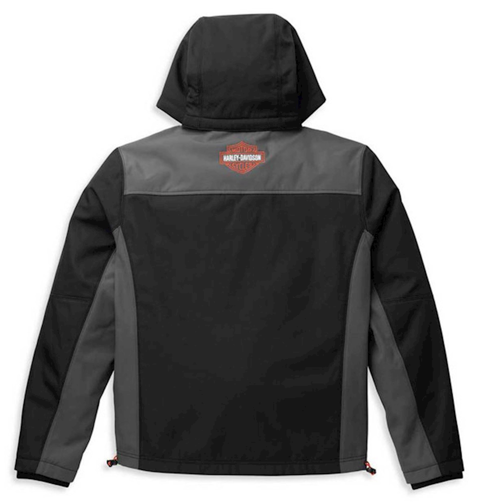 Harley-Davidson® Men's Bar & Shield Hooded Softshell Jacket - Black, 98403-22VM. Made from 100% woven polyester. Crafted from a windproof cut of woven polyester with a removable hood and toggle cord waistband. In addition to its wind-blocking features, this jacket is styled with a pop of contrast from its side panels, back yoke, and inside collar. Zippered front and zippered hand-warmer pockets. Embroidered graphic on front and back.