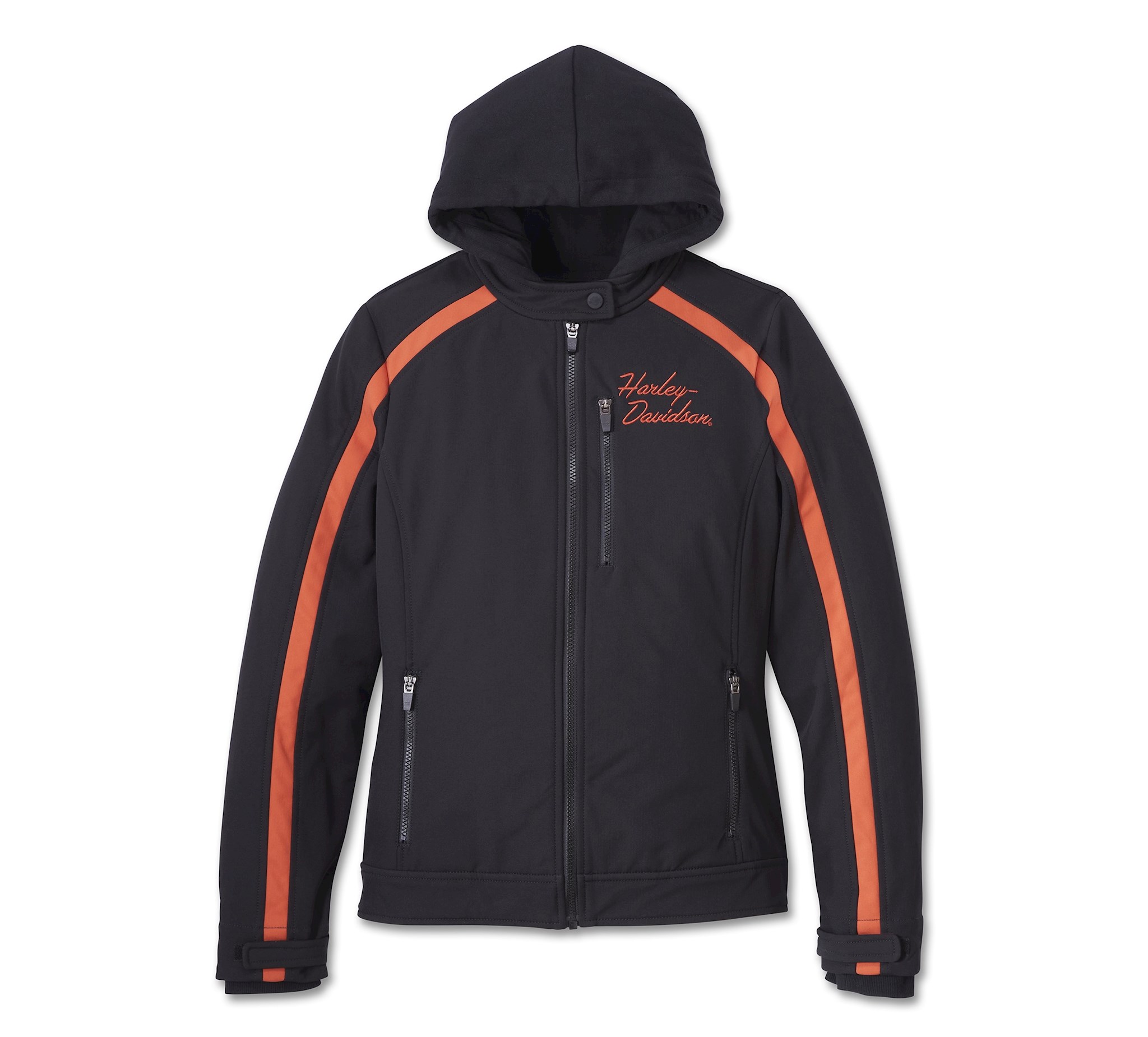 Triple your style, comfort, and versatility with our Miss Enthusiast 3-in-1 Soft Shell Jacket. Cut from a sturdy blend of polyester/spandex with a waffle-knit back for added texture, the outer jacket features a mandarin snap-tab collar, adjustable Velcro cuffs, flattering princess seams, and angled yokes with contrasting arm piecing. You’ll have a stay-warmer option with its removable cotton/poly fleece hoodie that sports a sturdy zip front, lined hood, and roomy kangaroo pockets. Wear the jacket alone, with the hoodie, or the hoodie by itself—it’s a must-have for road trips and rallies either way. It’s all finished with our most iconic branding and colors for a timeless Harley-Davidson look.