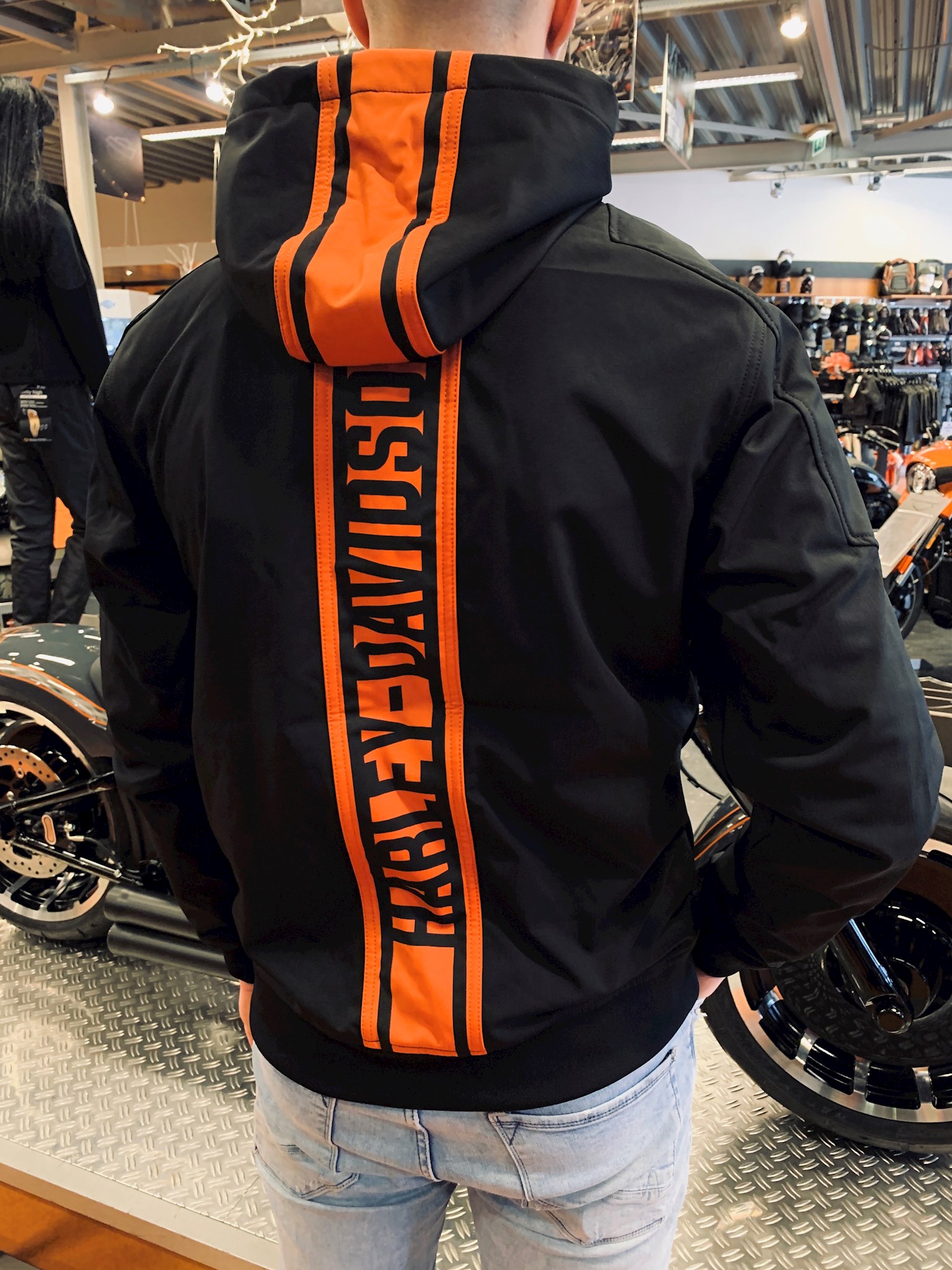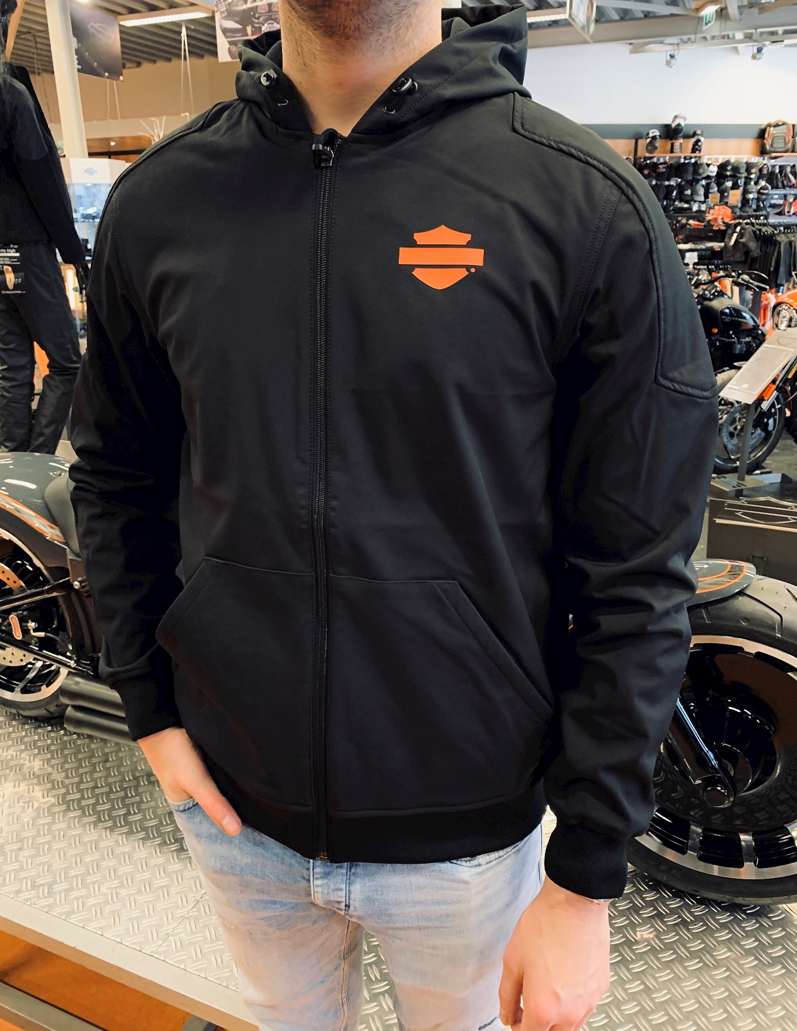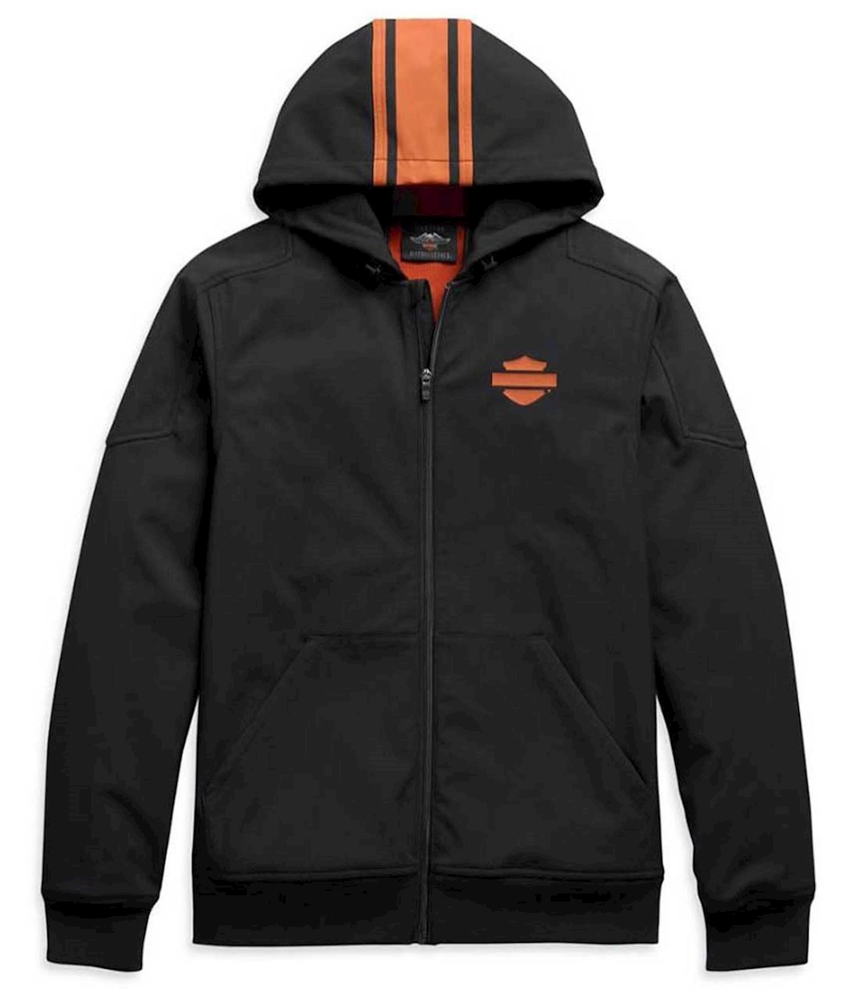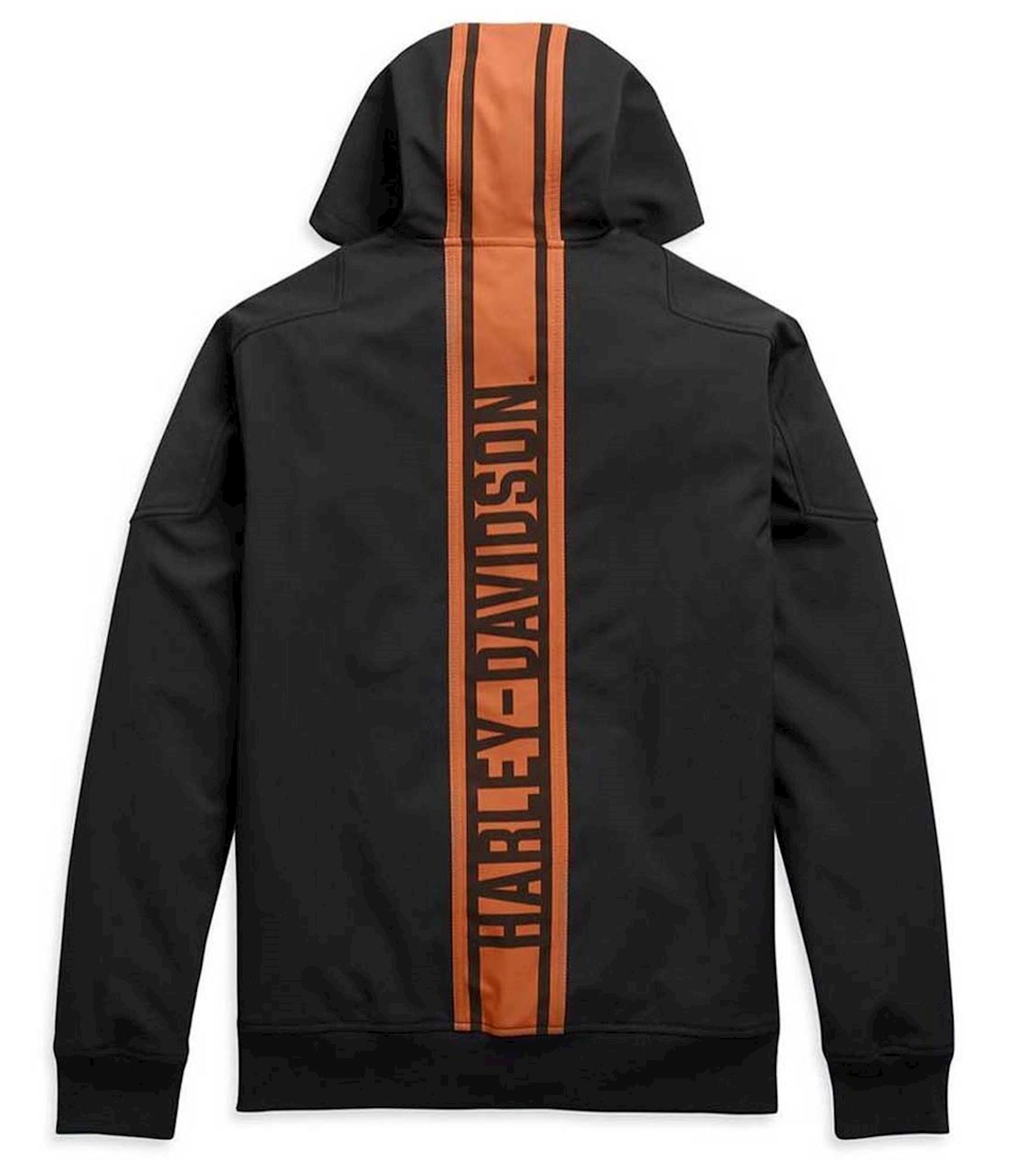Harley-Davidson® Men's Vertical Stripe Hooded Stretch Casual Jacket - Black. Four-way stretch, made from 91% polyester and 9% spandex soft shell with 100% polyester fleece backing. Zipper front. Kangaroo-style pockets. Rib-knit cuffs and waist. Three-panel hood with integrated bungee cord and toggle. High-density graphics. Printed graphics. 98408-20VM