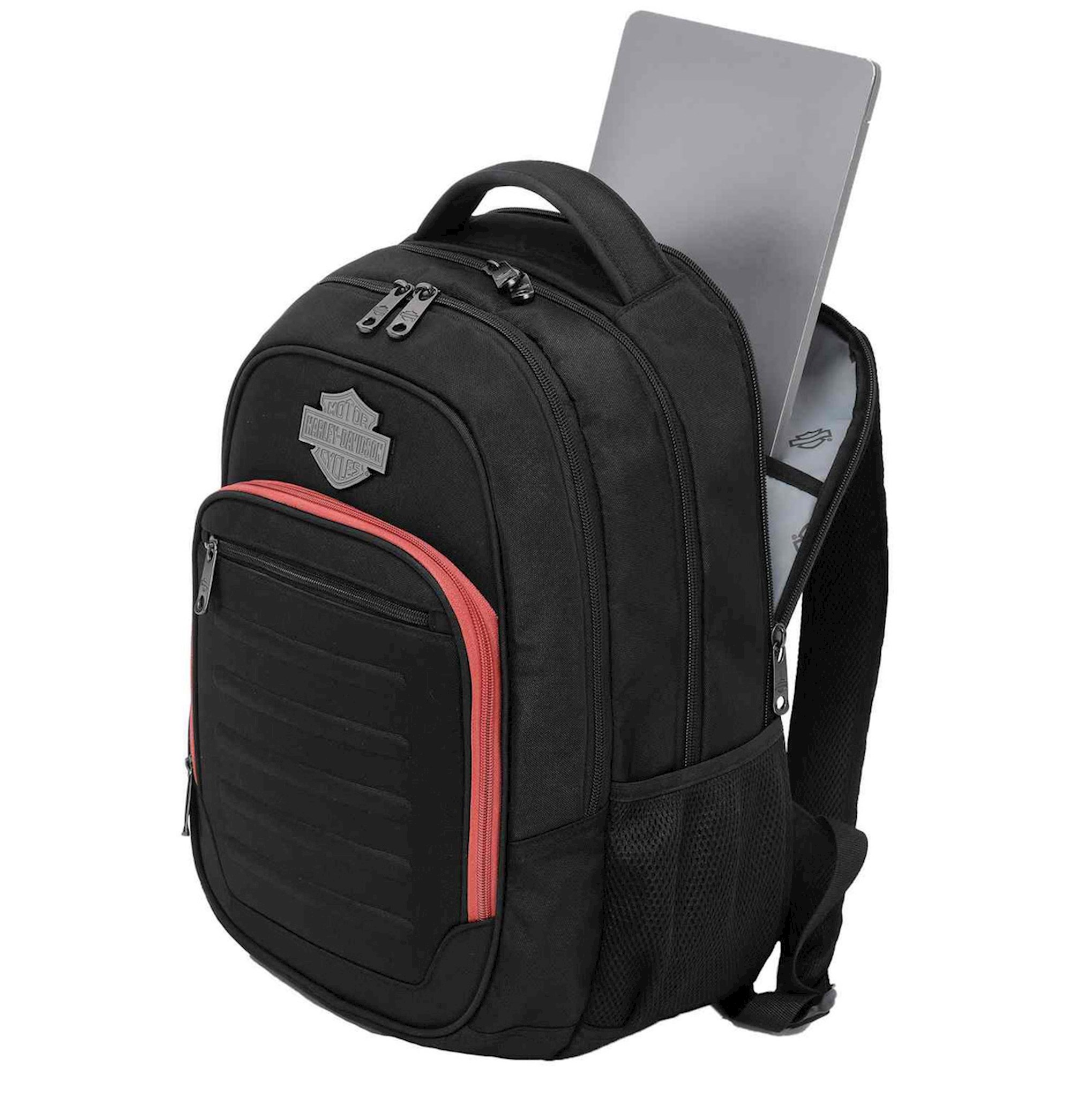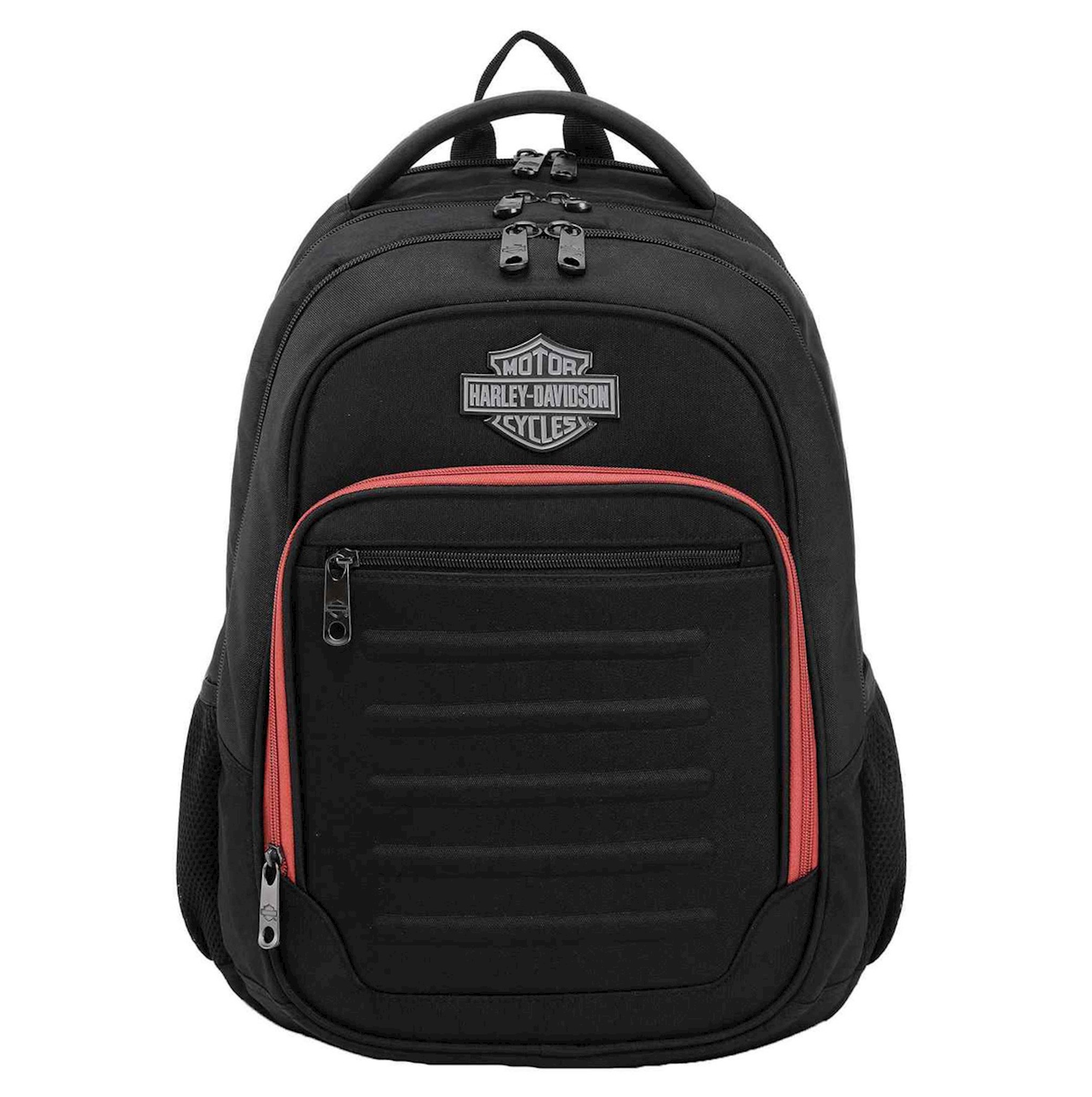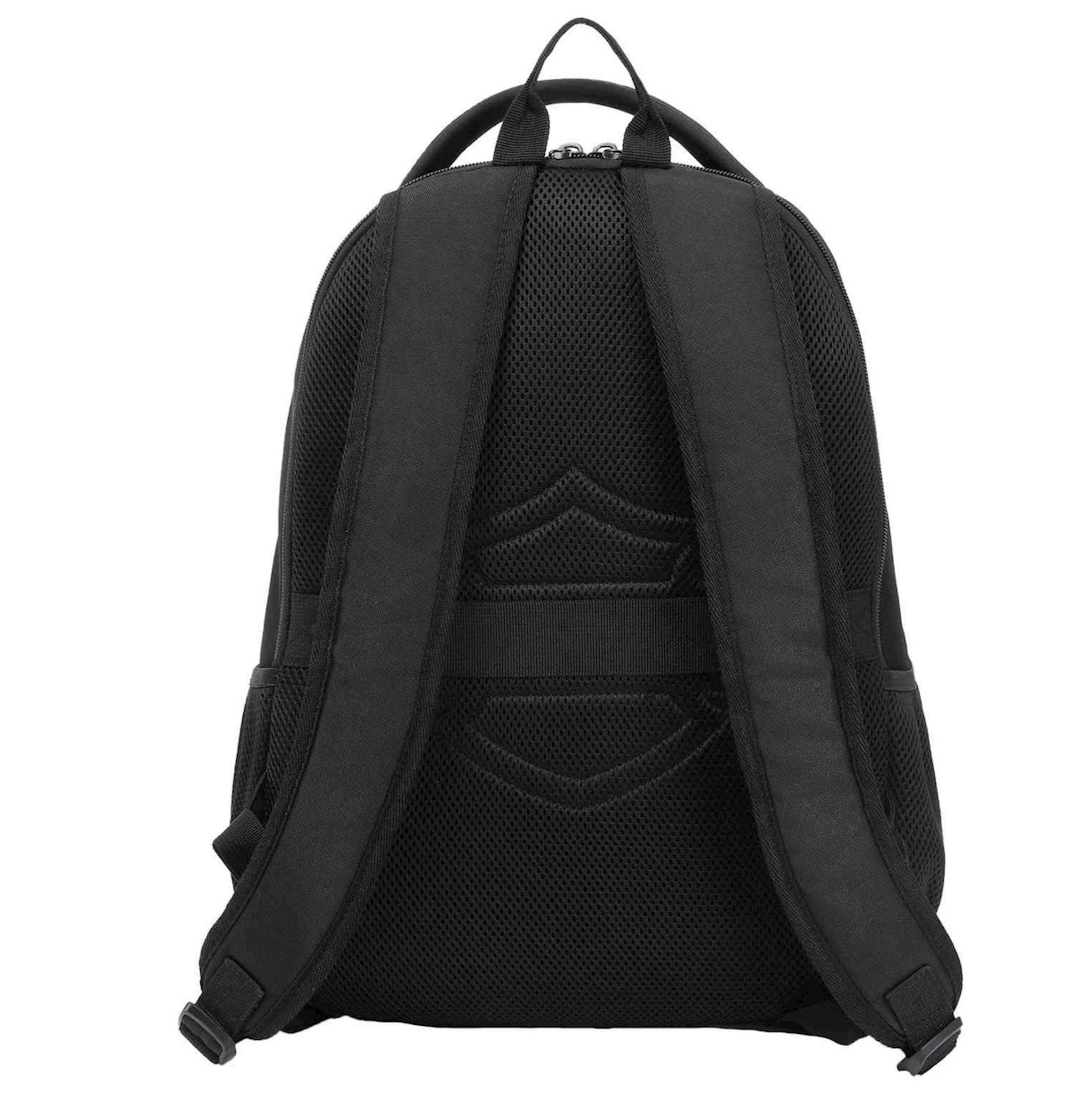 Rugged, high density polyester. Metal Bar & Shield logo. Two front zippered compartments. Padded backpack straps. Size: 18" x 13.5" x 6.5".