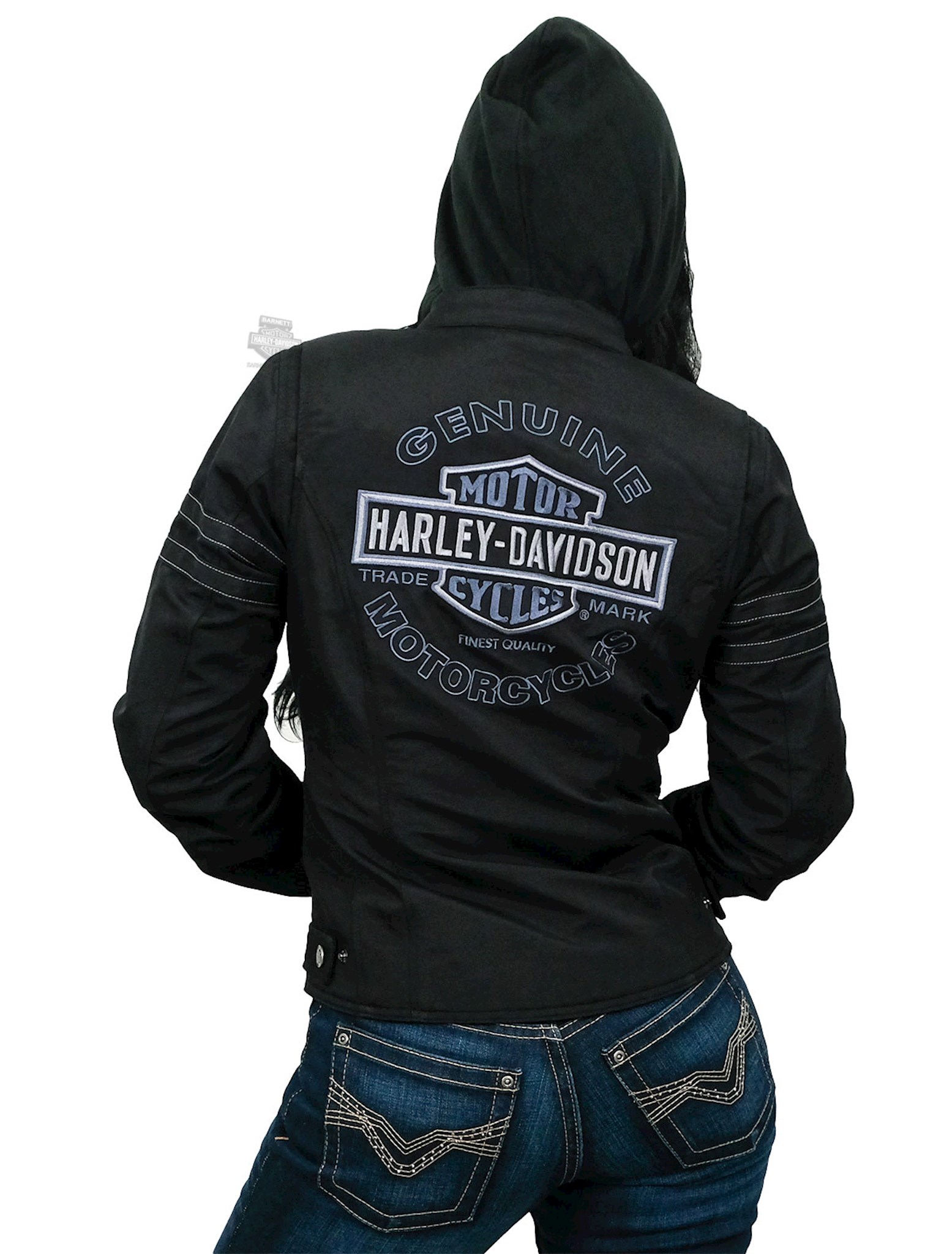Harley-Davidson® Women's Miss Enthusiast Outerwear Jacket, Black 98519-12VW. Our Miss Enthusiast 3-in1 casual jacket has a removable hooded vest that can be worn separately to increase temperature control and princess seams for a figure-flattering fit. Toned-down graphics lend a sophisticated touch to rebel styling. Cotton and nylon shell with removable, hooded vest can also be worn separately and features 2 hand-warmer pockets and embroidered graphics. Zippered front and cuffs and snap-tab waist. 2 zippered hand-warmer pockets and 1 interior pocket. Embroidered appliqué graphics on back, embroidered graphics on front.