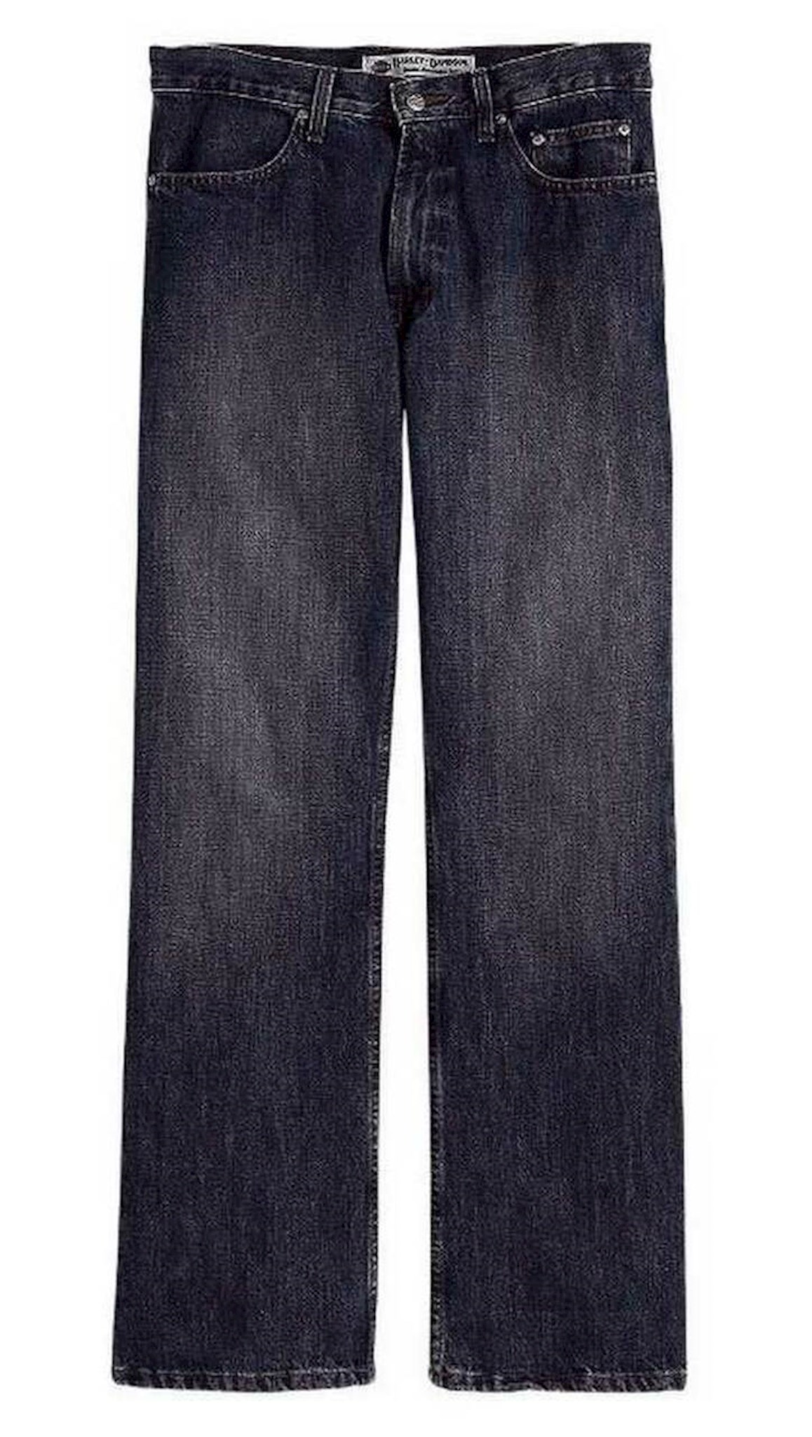 Harley-Davidson® Men's New Classic Boot Cut Jeans, 99027-09VM. Classic Bootcut Jeans are constructed with durable cotton denim and have traditional 5-pocket styling. The jeans are made with a modern finish that incorporates distressed detailing. The wide bootcut silhouette fits nicely over your riding boots. Distressed dark-wash denim is 100% cotton. Wider boot-cut leg opening. Slim-fit through seat and thighs. Sits just below the waist. Classic 5-pocket style with unique left side coin pocket for rider convenience. Harley-Davidson® embroidery on back pocket. Embossed Bar & Shield leather patch at back waist.