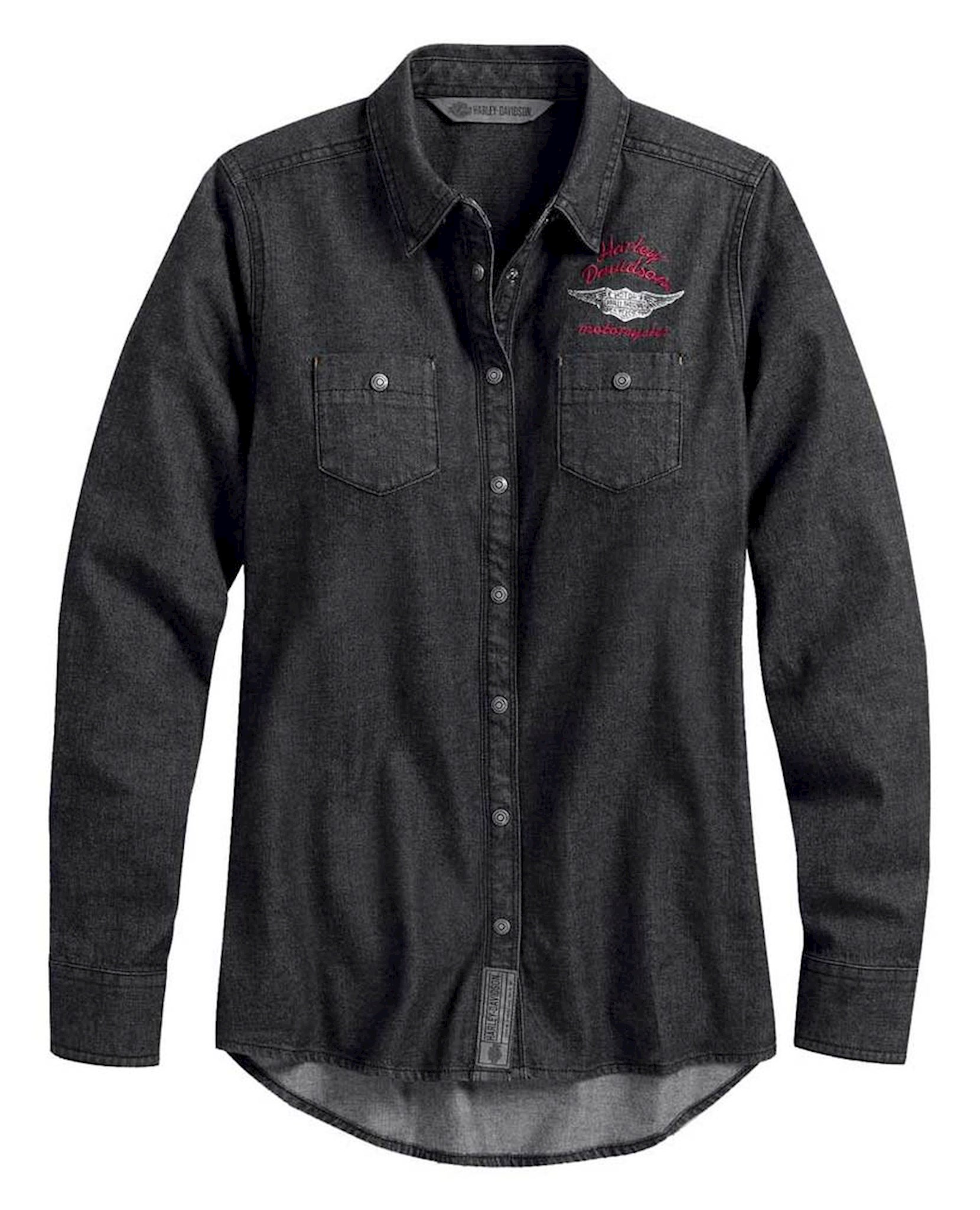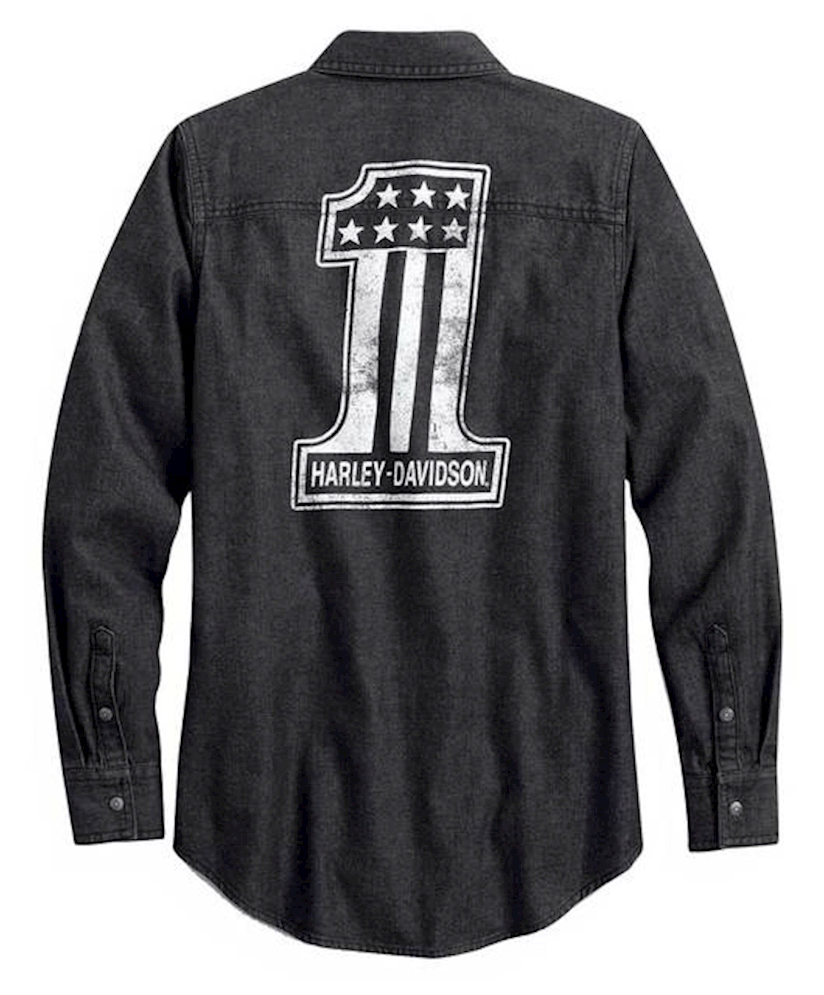 Harley-Davidson® Women's #1 Denim Long Sleeve Casual Shirt - Black, 99035-20VW. Cut from thicker denim and washed soft right off the hanger. Made from 100% cotton denim that is washed for softness. Worn distressed printed graphic on back that sends off a lived-in vibe. Embroidered graphic on front and woven label. Snap-down collar. Snap front and cuffs. Snap chest pockets. Perfect to layer over a tank or tee with the sleeves down or rolled up.
