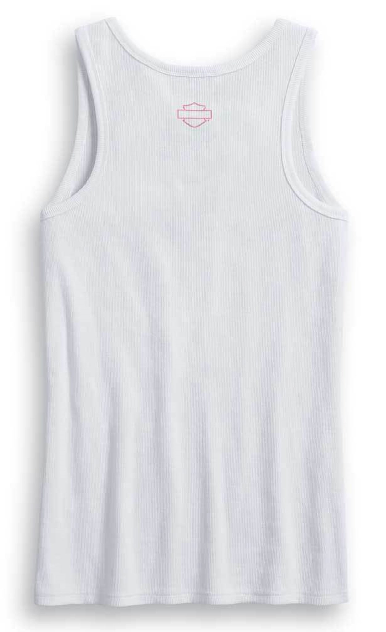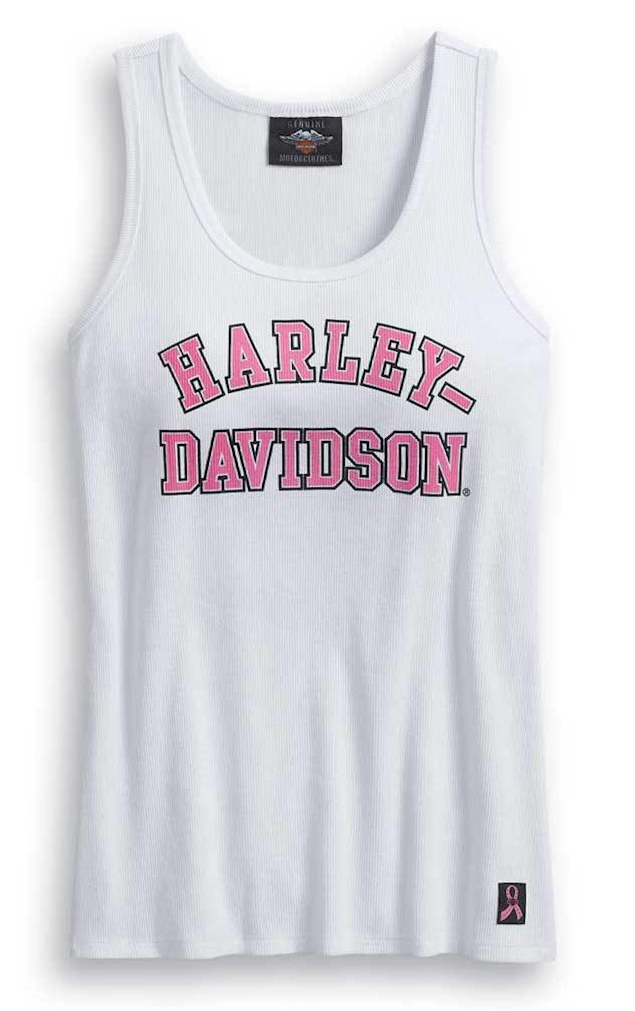 Harley-Davidson® Women's Pink Label Rib-Knit Sleeveless Tank Top - White, 99057-20VW. Stretch ribbed construction gives the Pink Label Rib-Knit Tank a lovely, flattering fit. Made from 93% cotton and 7% spandex. 2x2 rib. Woven label and printed graphics. This tank you can feel good about as it supports the brave souls impacted by breast cancer. The all new Pink Label styles capitalize on the athletic trends and popular performance technologies for styles that are great to wear at walks and rallies. Styles feature the original Pink Label pink, giving customers a new reason to refresh their Pink Label wardrobe.