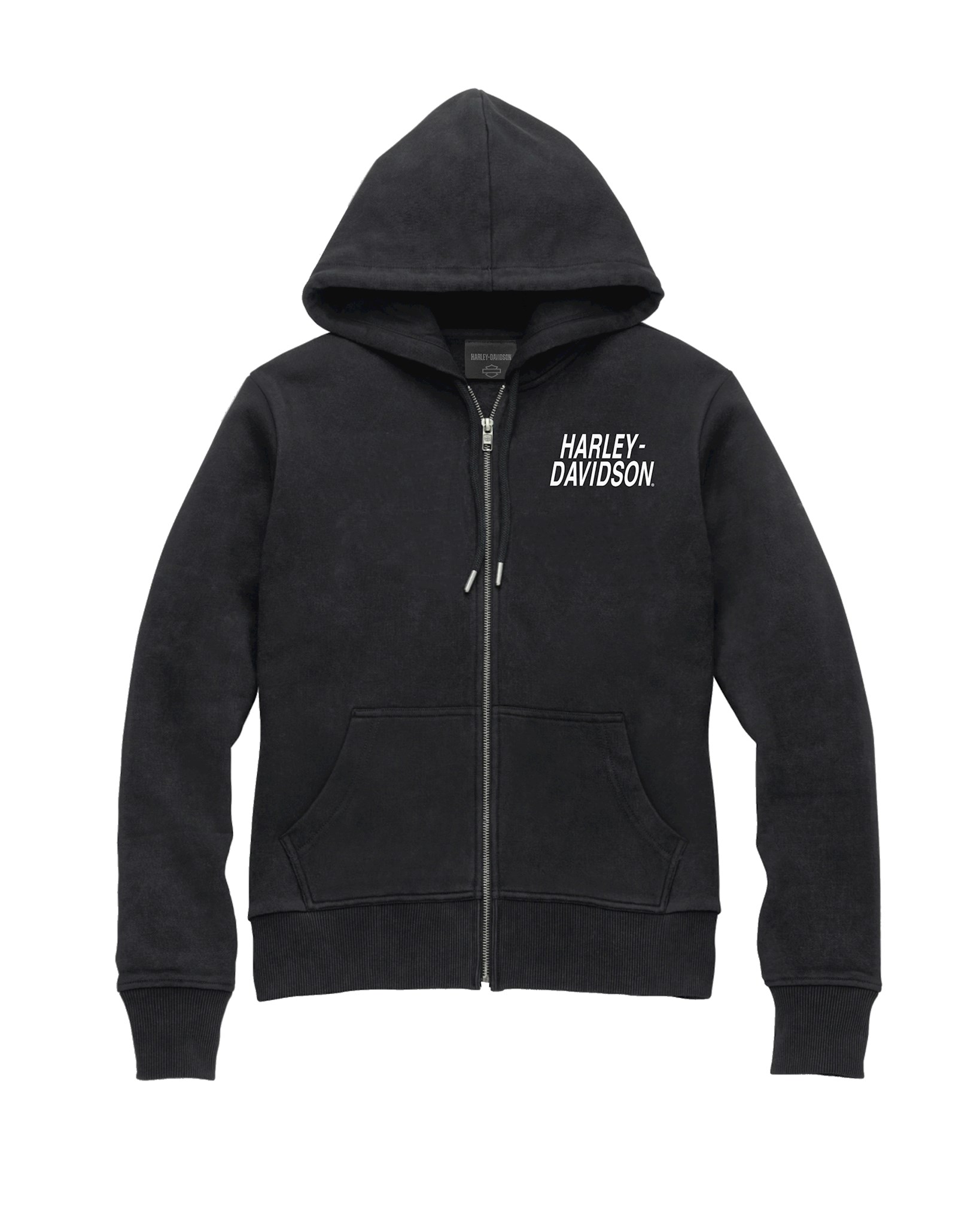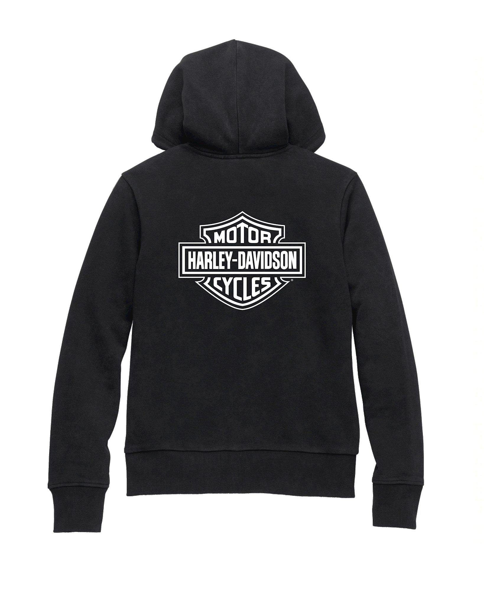 Harley-Davidson® Women's Special Bar & Shield Zip Front Hoodie - Black, 99098-22VW. Comfortable casual hoodie style and fit. Made from 60% cotton and 40% polyester fleece. Zipper front with kangaroo-style pockets. Jersey-lined hood. Rib-knit cuffs and hem. Soft-hand printed graphic on front and back.
