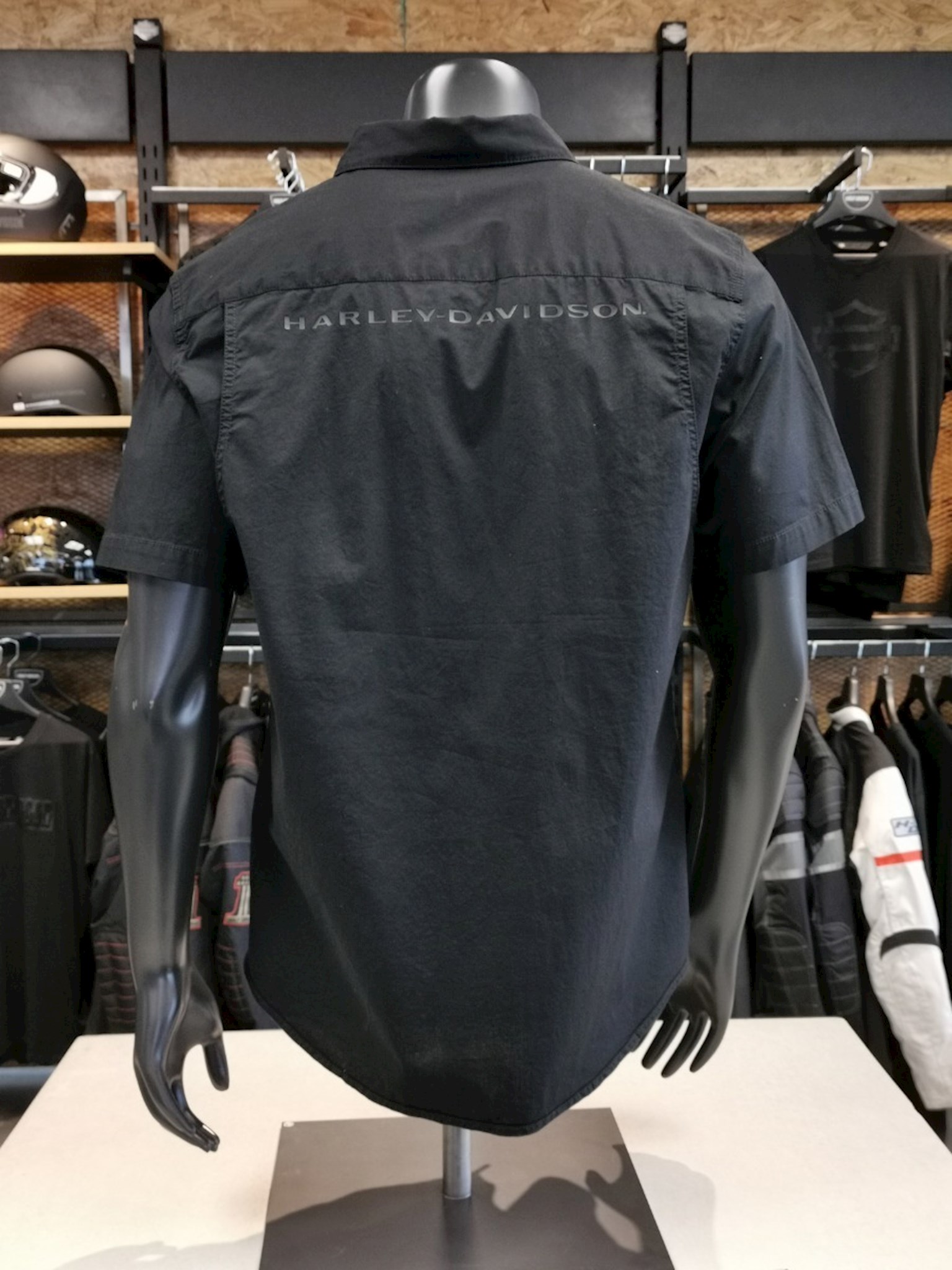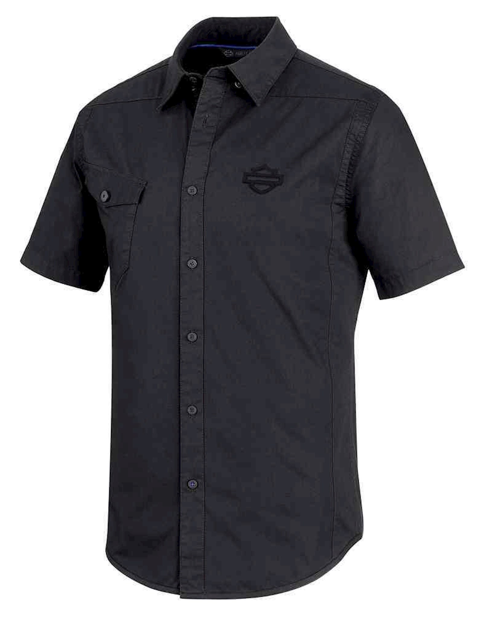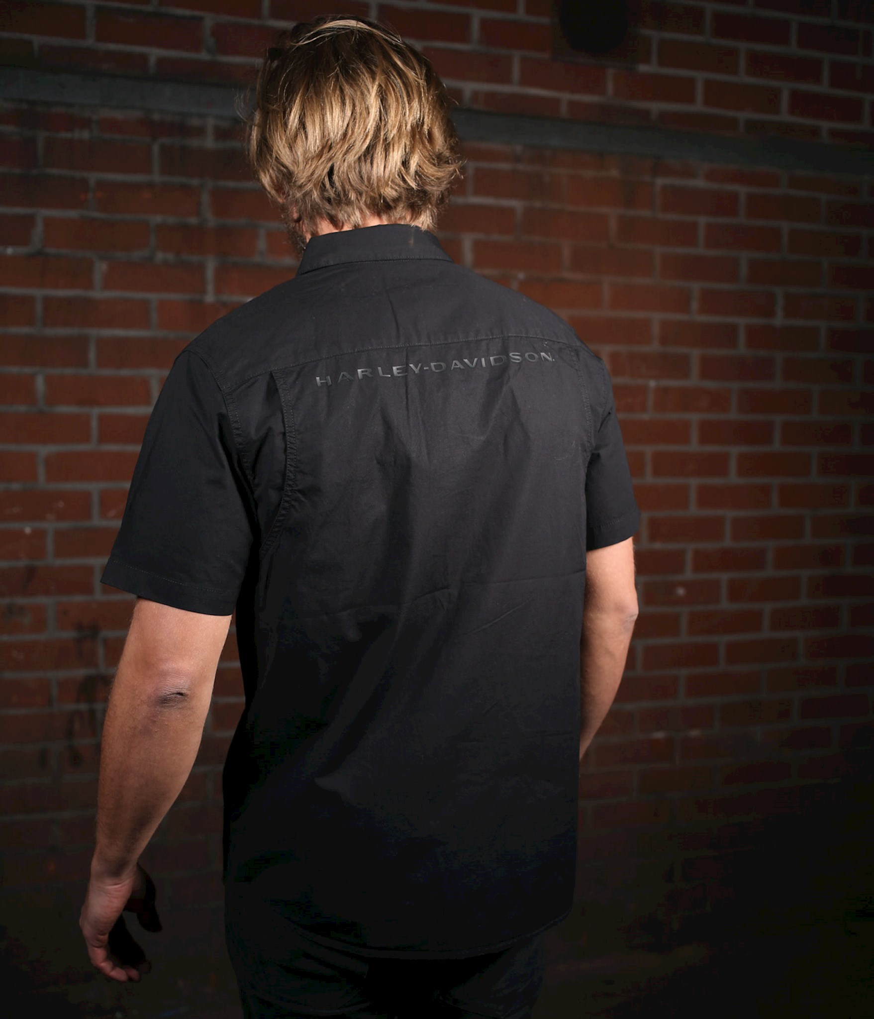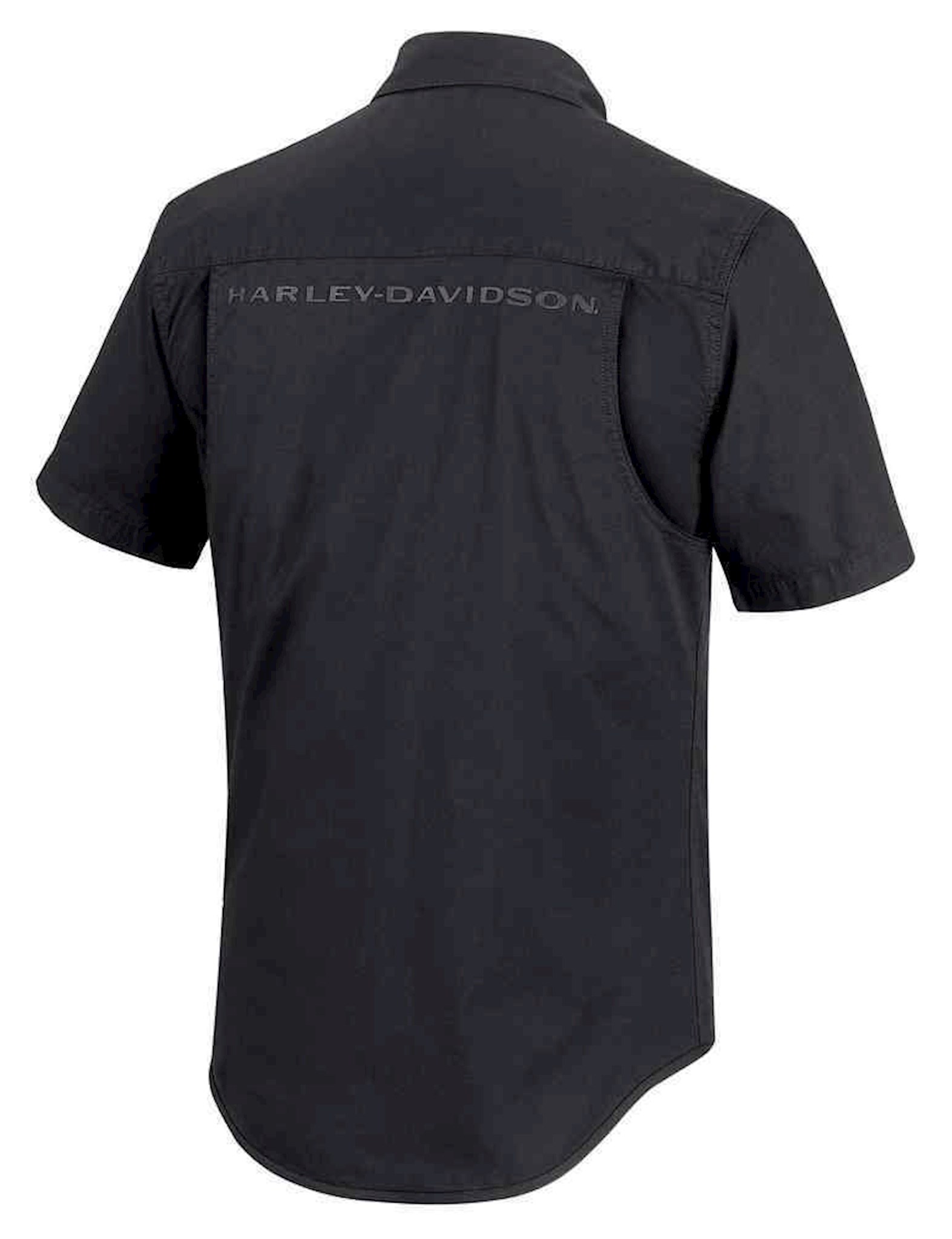 Harley-Davidson® Men's Performance Vented Stretch Slim Fit Shirt, 99193-19VM. Vented mesh action back for cooling airflow. Made from 98% cotton, 2% spandex is washed for softness. Snap-down collar. Button front. Snap flap chest pocket. High-density graphics. Slim Fit—fits closer to the body.