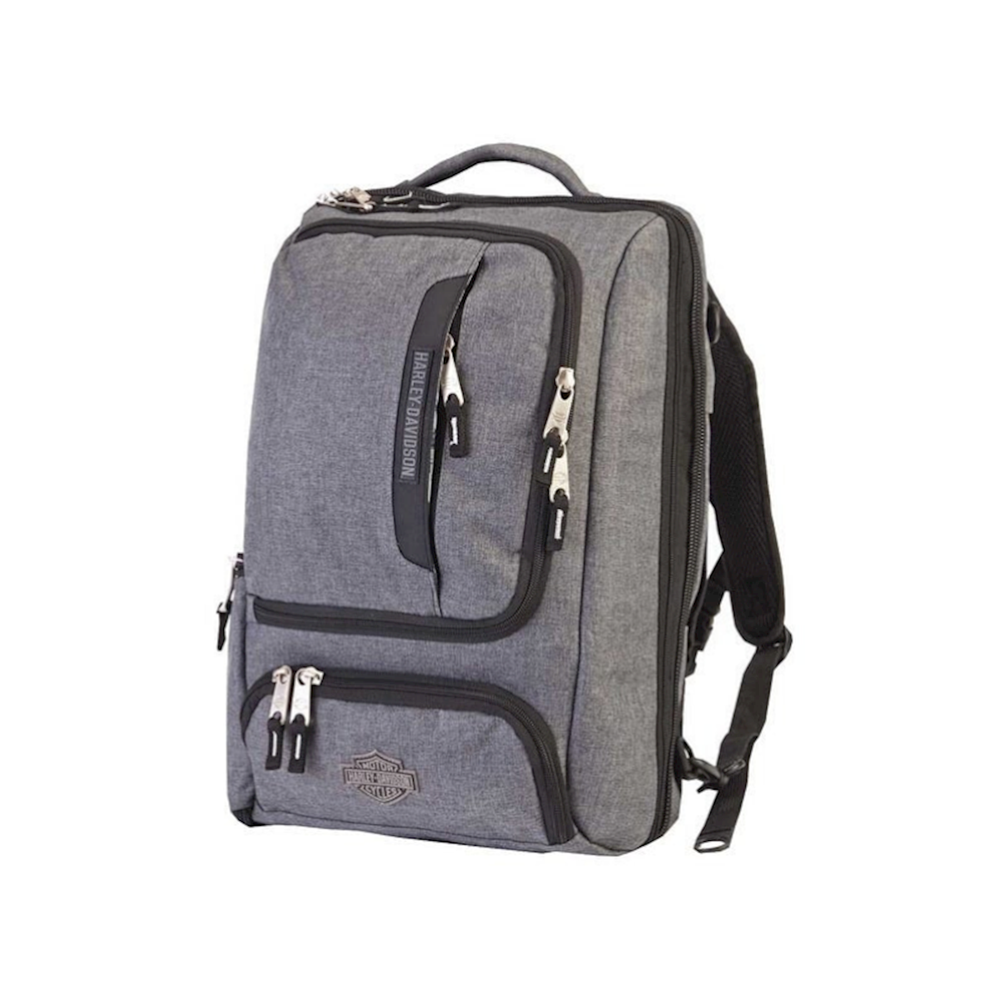 Harley-Davidson® Transport Backpack. Constructed from lightweight, strong water resistant polyester. Two front zippered pockets with numerous organizer and accessory pockets to keep all of your items organized and easy accessible. Comfortable and adjustable padded straps. Gray map lining. Padded interior lap top section, eye glass protective pocket and two main sections. Sternum strap and back foam padding. Size: 17.5" x 12" x 3".