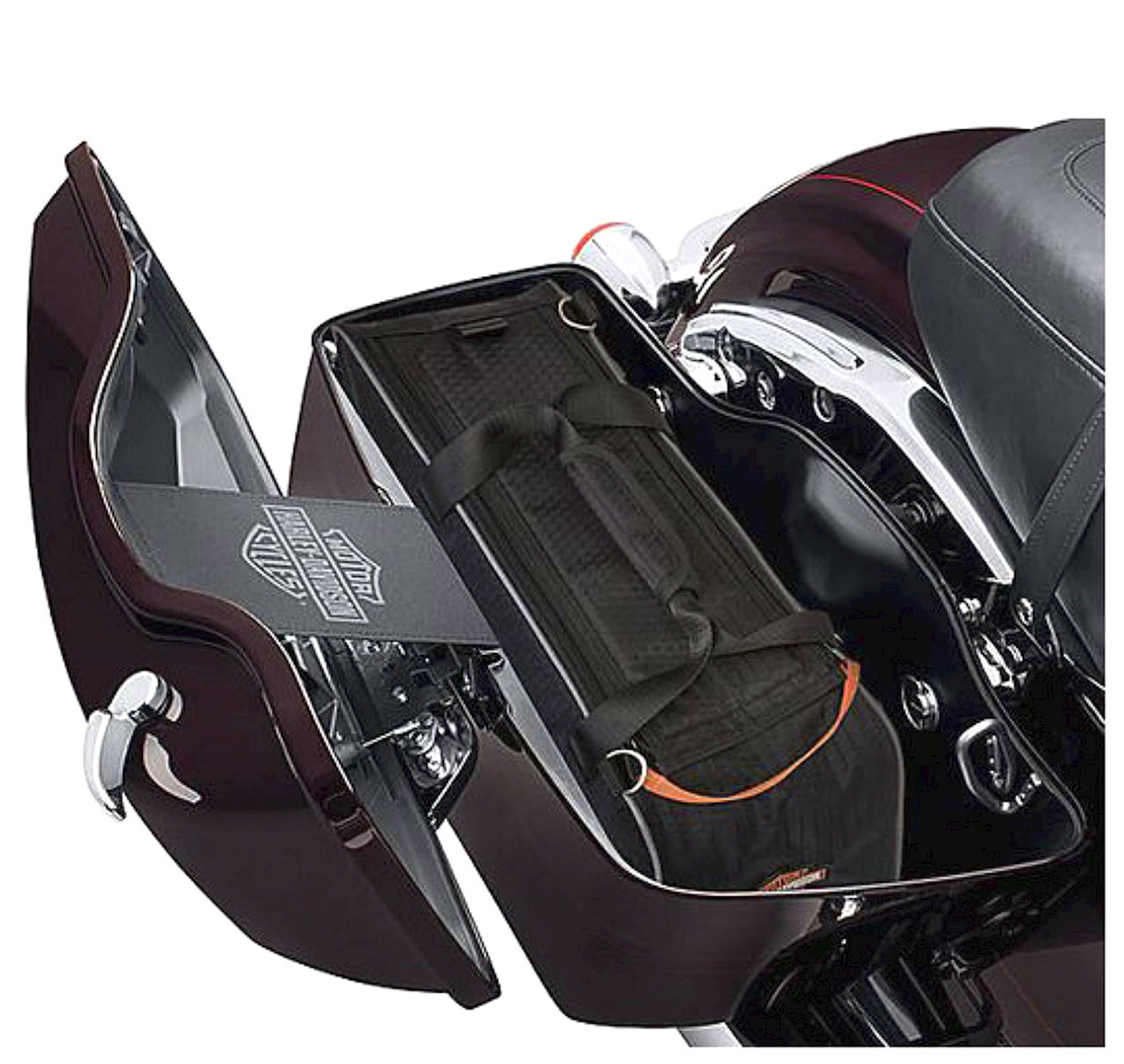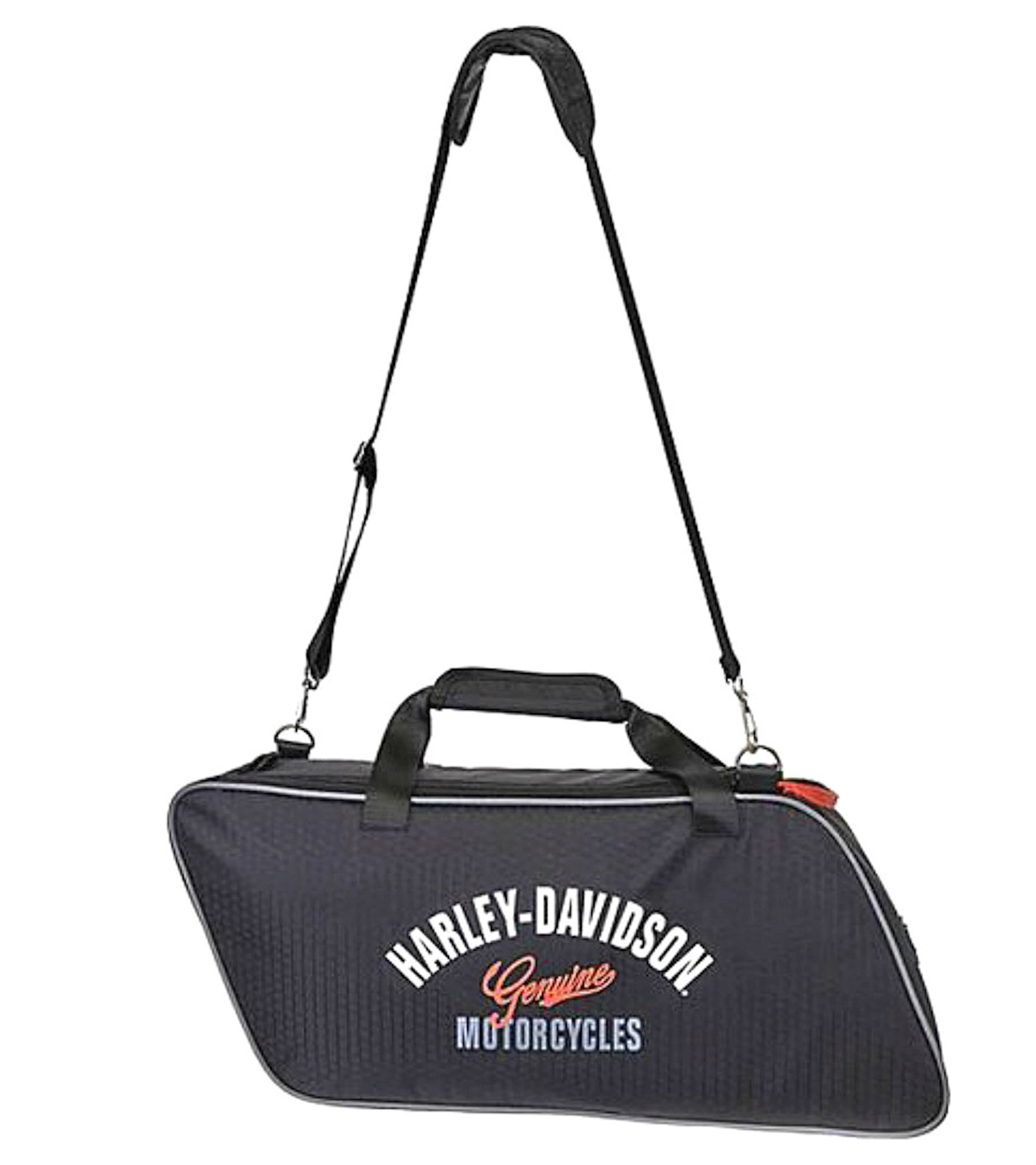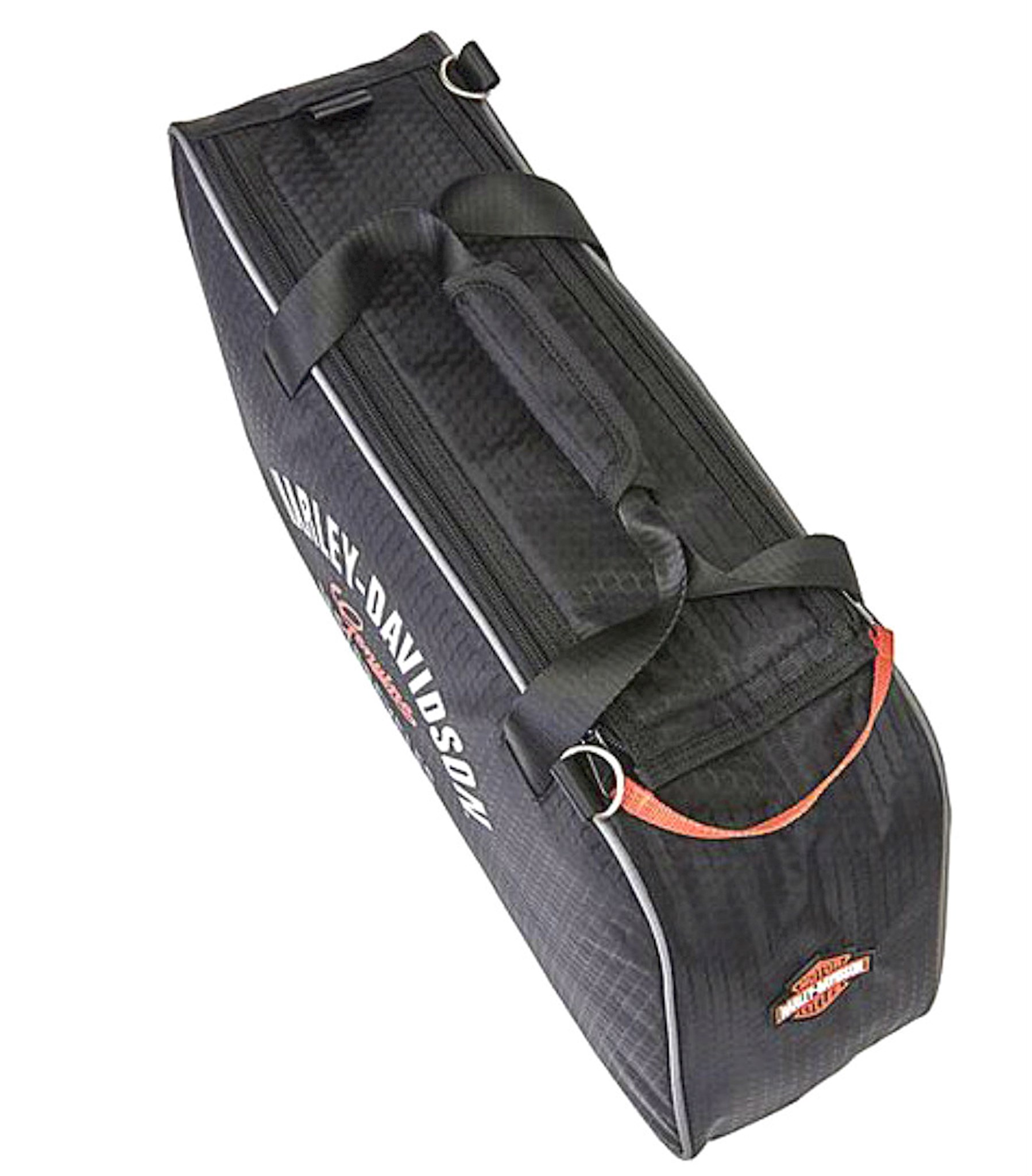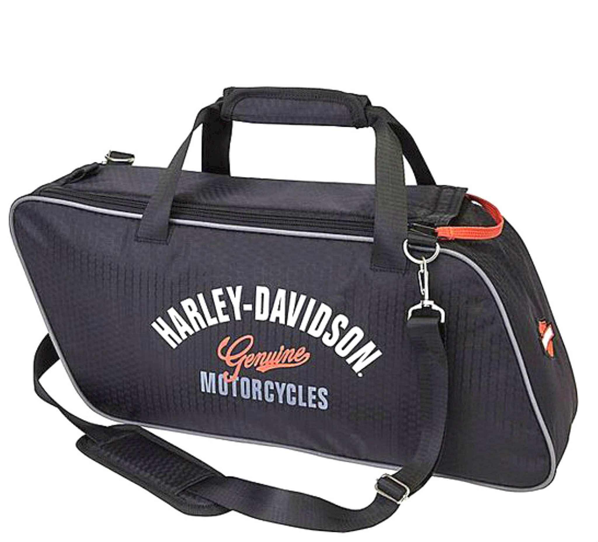 Water-resistant, light-weight, durable honeycomb polyester . Industrial-strength webbing double-carry top handles. and extended shoulder strap options. Easy-pull dual top zippers for wide open accessibility, foam-filled body padded to protect your contents. Printed H-D® signature script and Bar & Shield® logo graphics emphasize your brand loyalty. Designed to fit inside hard saddlebags on bikes equipped with this feature. Measures approximately 19"W x 9"H x 4.75".