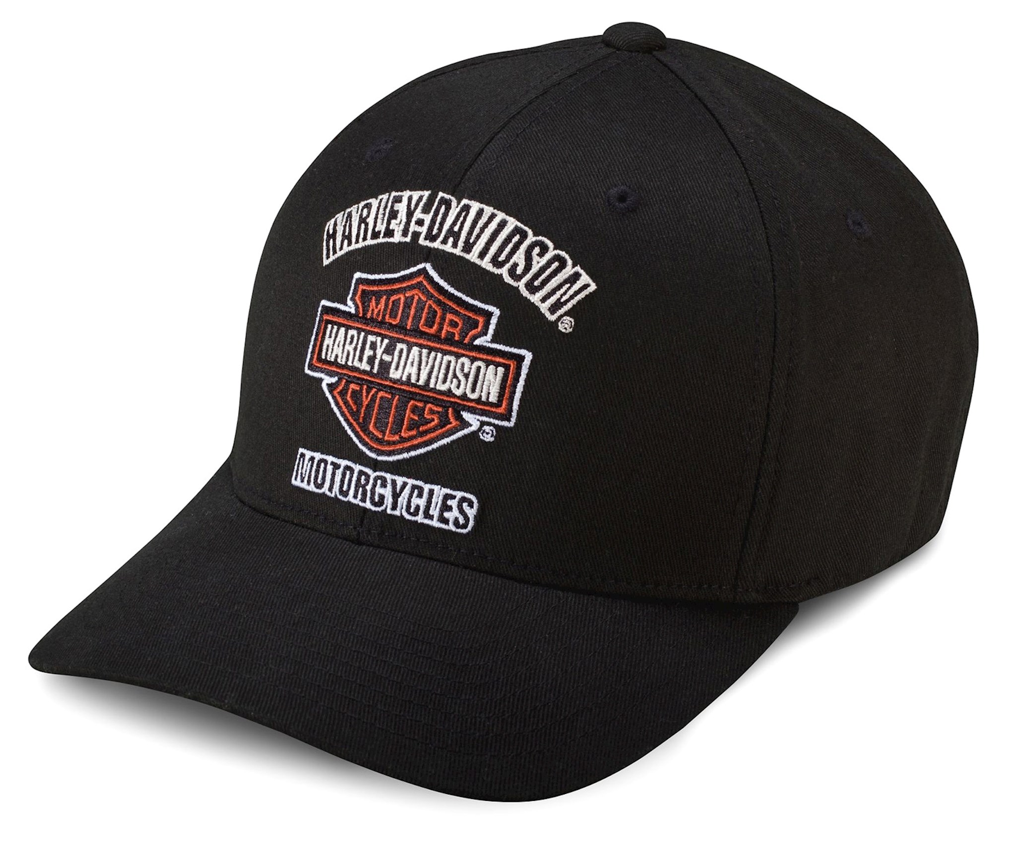 Harley-Davidson® Men's Traditional Logo Stretch Baseball Cap Hat, Black. 99408-16VM. For classic style and an excellent fit, you can't do better than the Traditional Logo Stretch Cap. Our cotton/spandex men's baseball cap offers superb comfort thanks to the Flexfit interior comfort stretch band. 97% cotton, 3% spandex. Embroidered graphics on front and tonal embroidered graphics on back. Official Flexfit silhouette with interior comfort stretch band. Color: Black with white and orange accents.