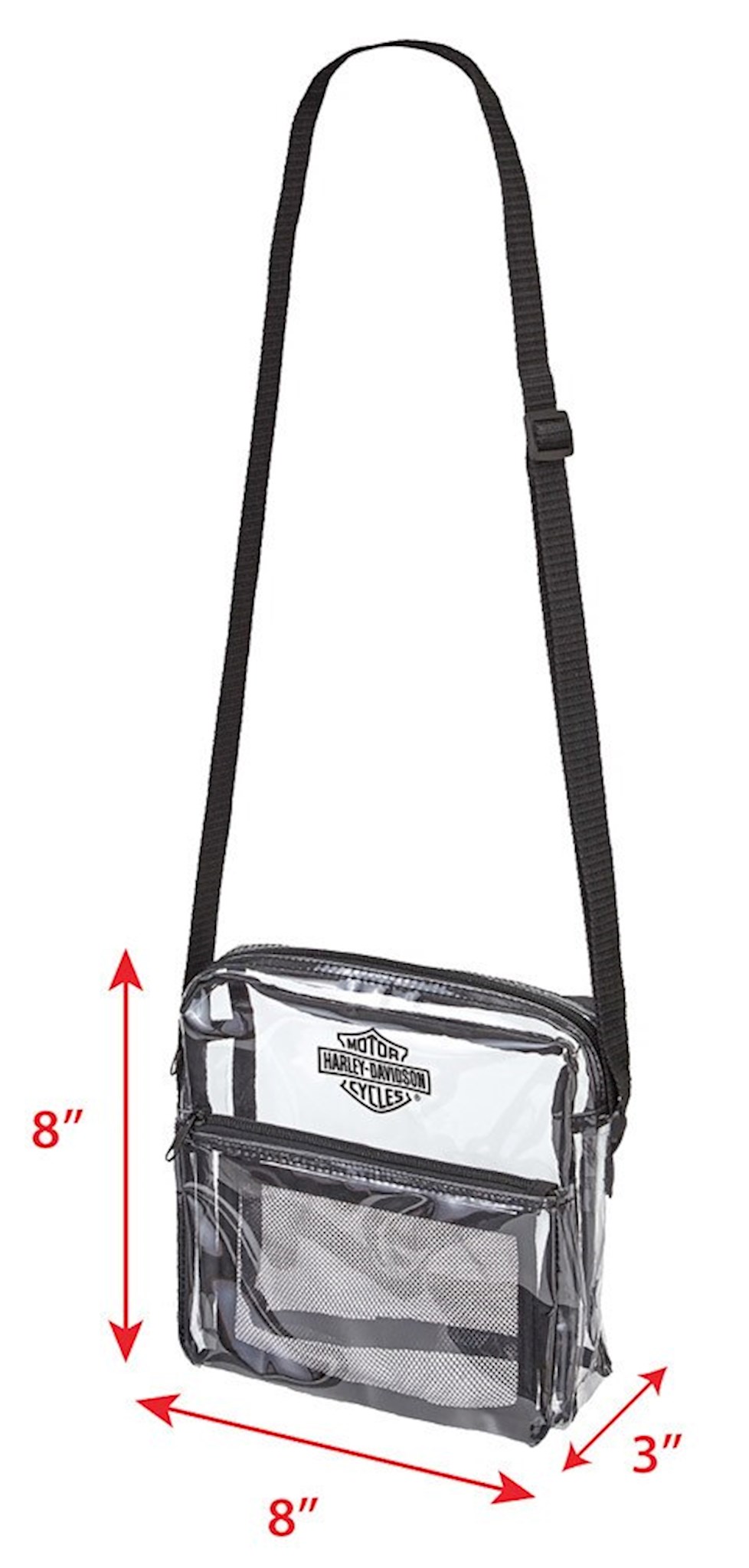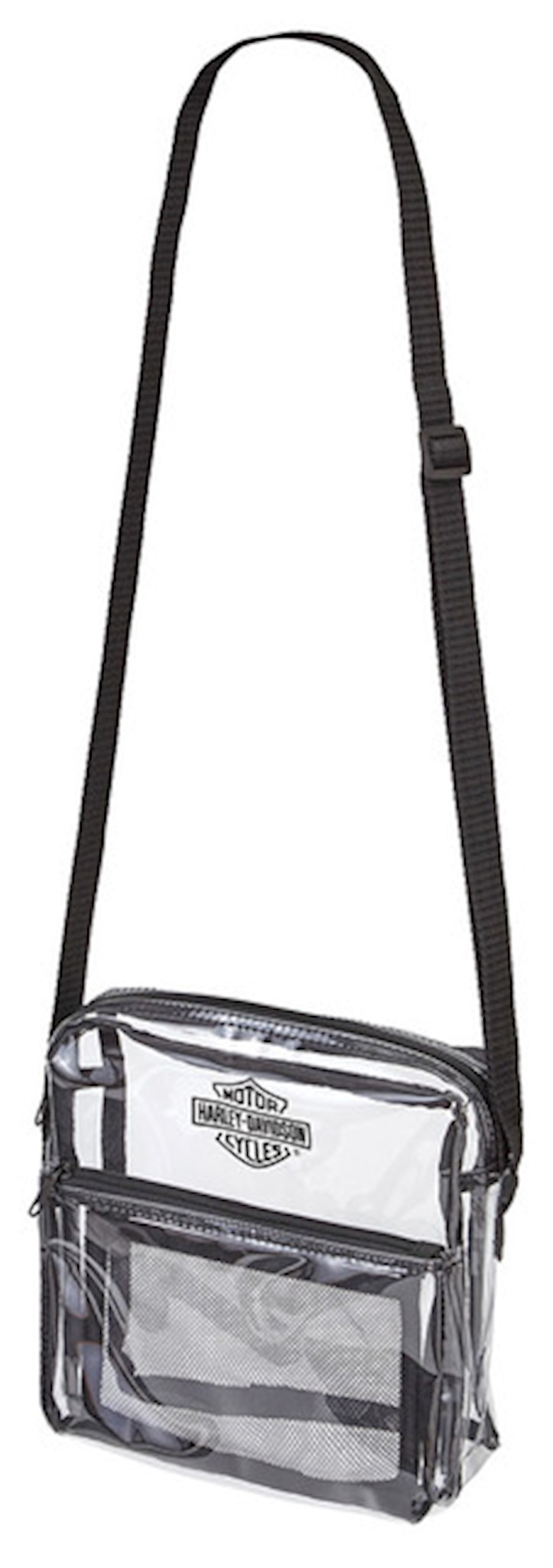 Harley-Davidson® Women's Security Messenger Bag, 99662-CLEAR. Two zippered sections and an adjustable shoulder strap. This clear messenger bag meets NFL and PGA Tournament guidelines. Approved to be used where regulations require clear bags such as NFL football games, casinos, events, parks and collage stadiums. Size: 8" x 3" x 8".