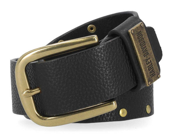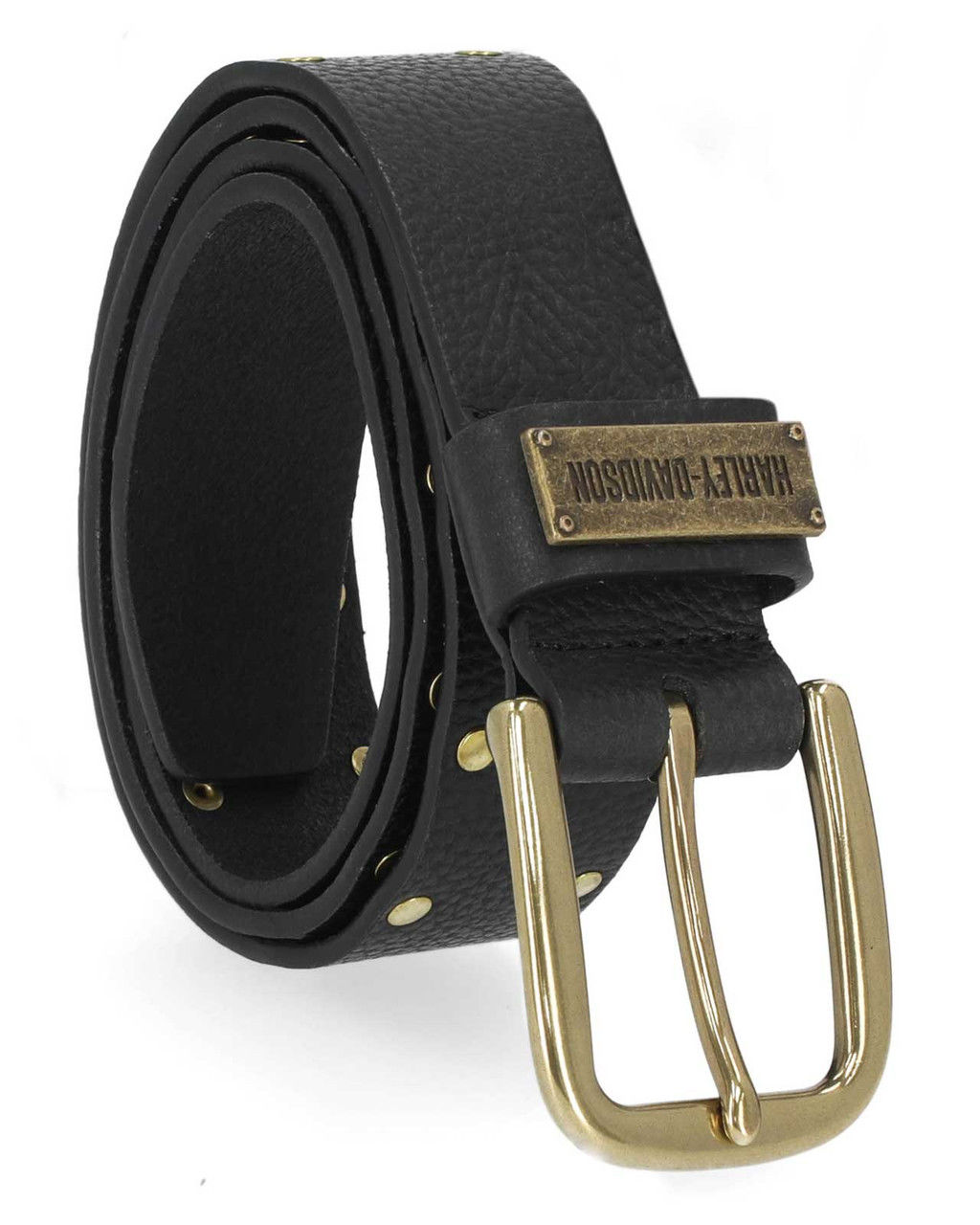 Harley-Davidson® Women's Vintage Rivet Stud Strap Genuine Leather Belt - Black, BMW004/08. Belt features antique brass finish buckle, and rivets, around a matte black belt. Harley-Davidson® name plate on buckle loop. Made from 100% smooth genuine leather. Matte gunmetal finish. 38mm wide.