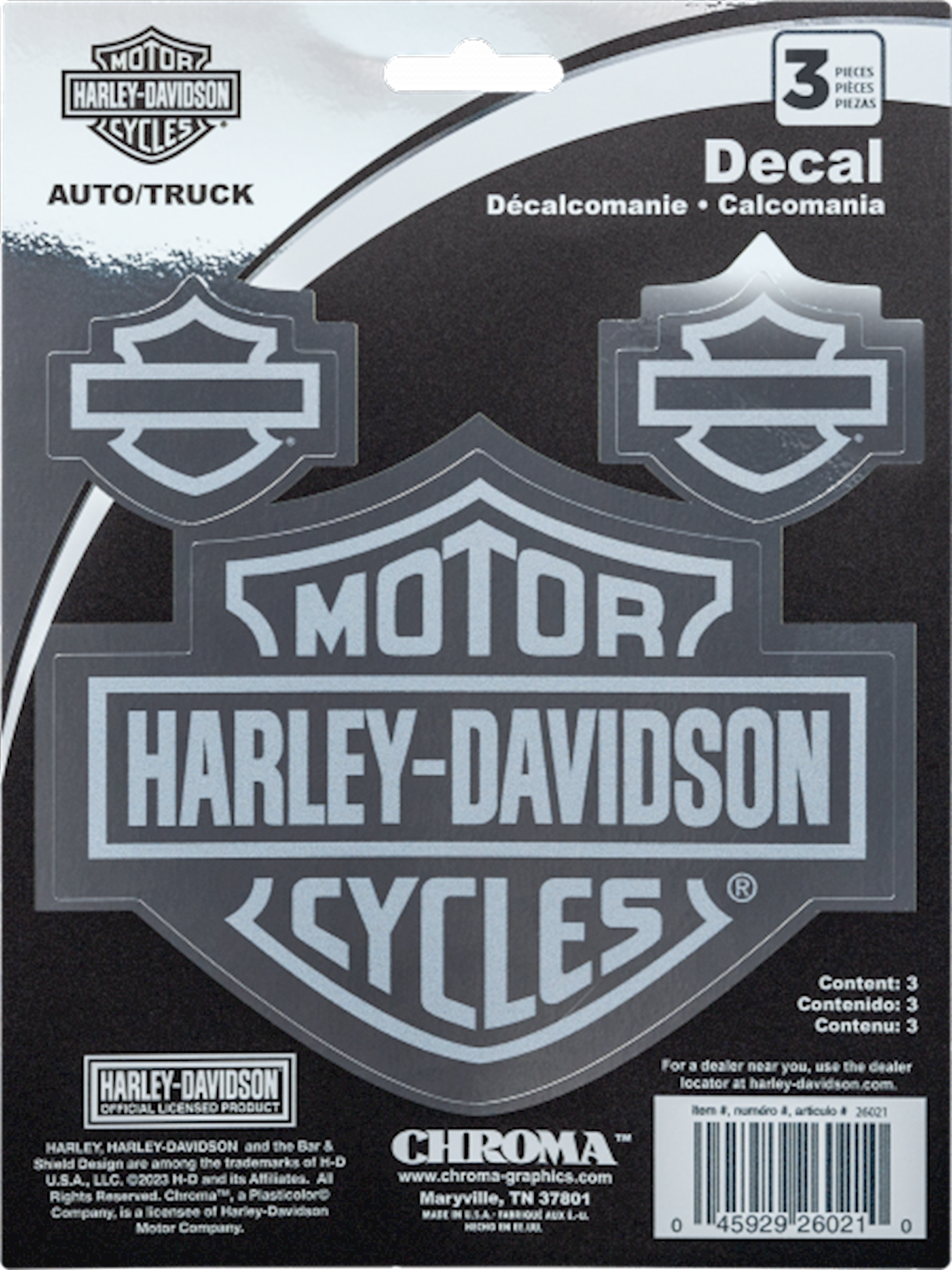 Harley-Davidson™ Etched Look Chrome Decal. Size: 15 x 20 cm.