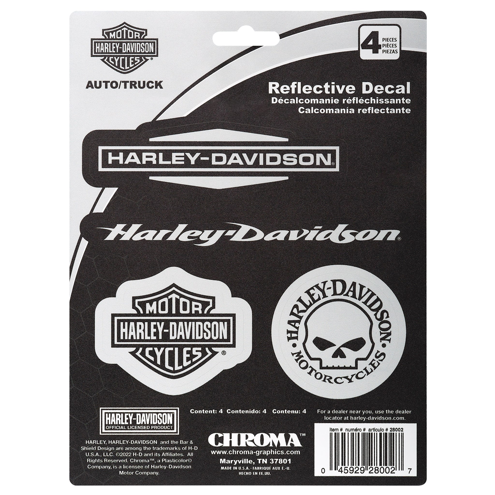 Harley-Davidson® 4-Piece Reflective Decals, CG28002. Made from high-quality vinyl. Includes 4 decals total, 2 H-D® text, Iconic Bar & Shield logo and a Willie G Skull logo. Reflective Chrome. Sheet Size: 6" x 8". Decal Sizes: Top H-D Text 4.25" x 1.5", H-D Script 5.25" x 0.5", Bar & Shield Logo 2.25" x 2" and Willie G Skull 2" round. These stickers will adhere to any smooth, flat surface. Made in the USA.