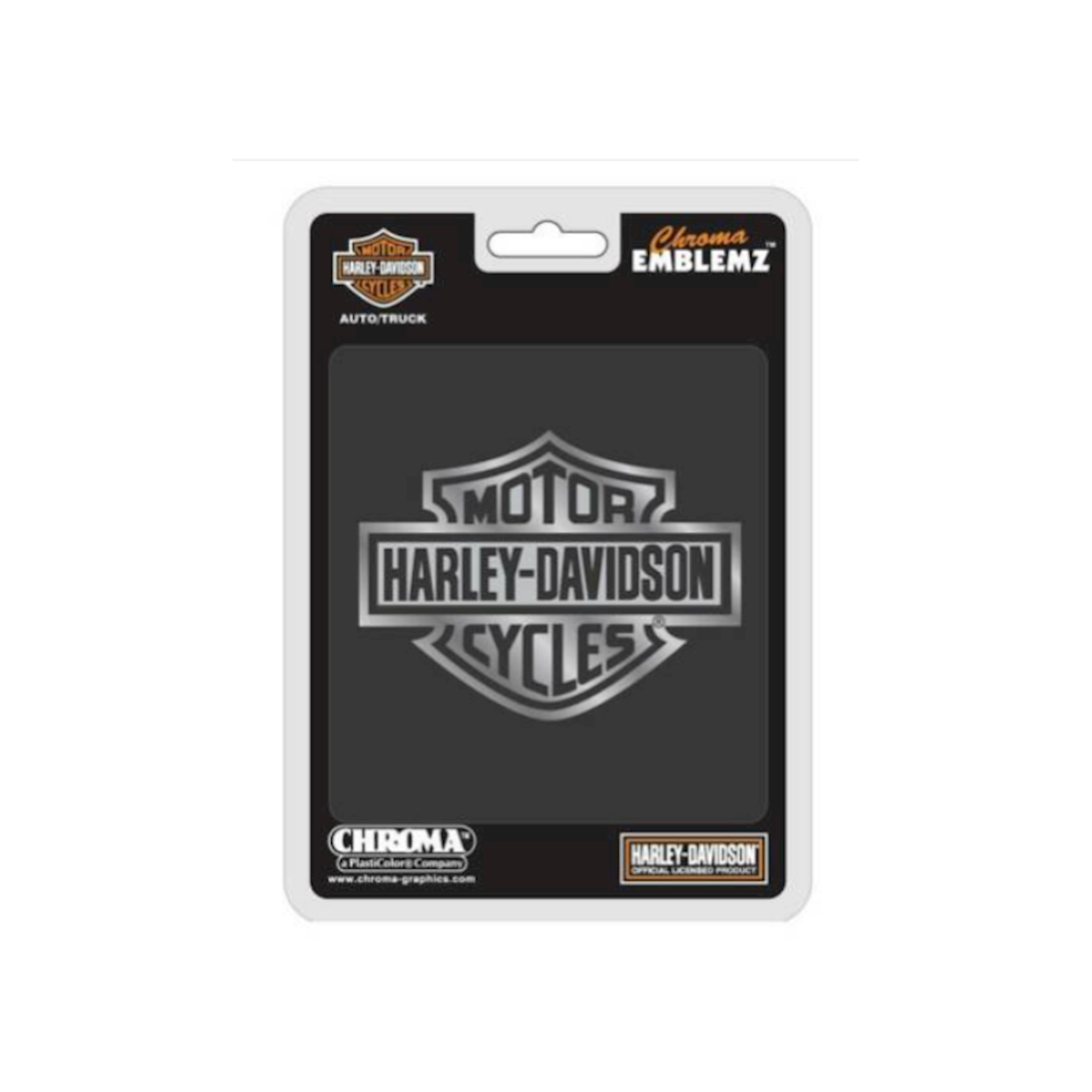 Harley-Davidson® Bar & Shield Chrome Emblem, CG9107. High-quality injection molded construction. Easy to apply self adhesive that adheres to most smooth surfaces including: glass, plastic, metal, etc. Apply to clean, dry surfaces. Great decal for your car or truck! Instillation instructions on back.