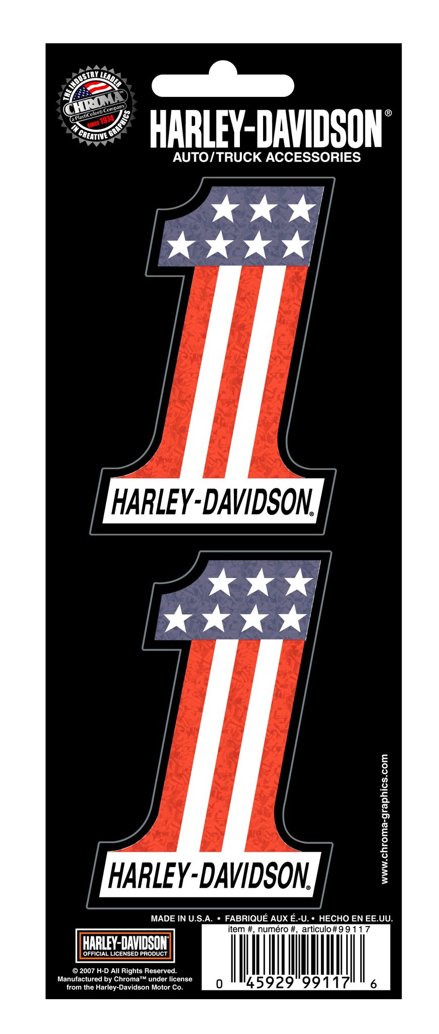Harley-Davidson® #1 Red, White & Blue Holographische Decals. Uitgevoerd met #1 logo's. Zelfklevend, hecht aan de meeste materialen. Makkelijk aan te brengen. Afmeting: 8 x 5 cm.