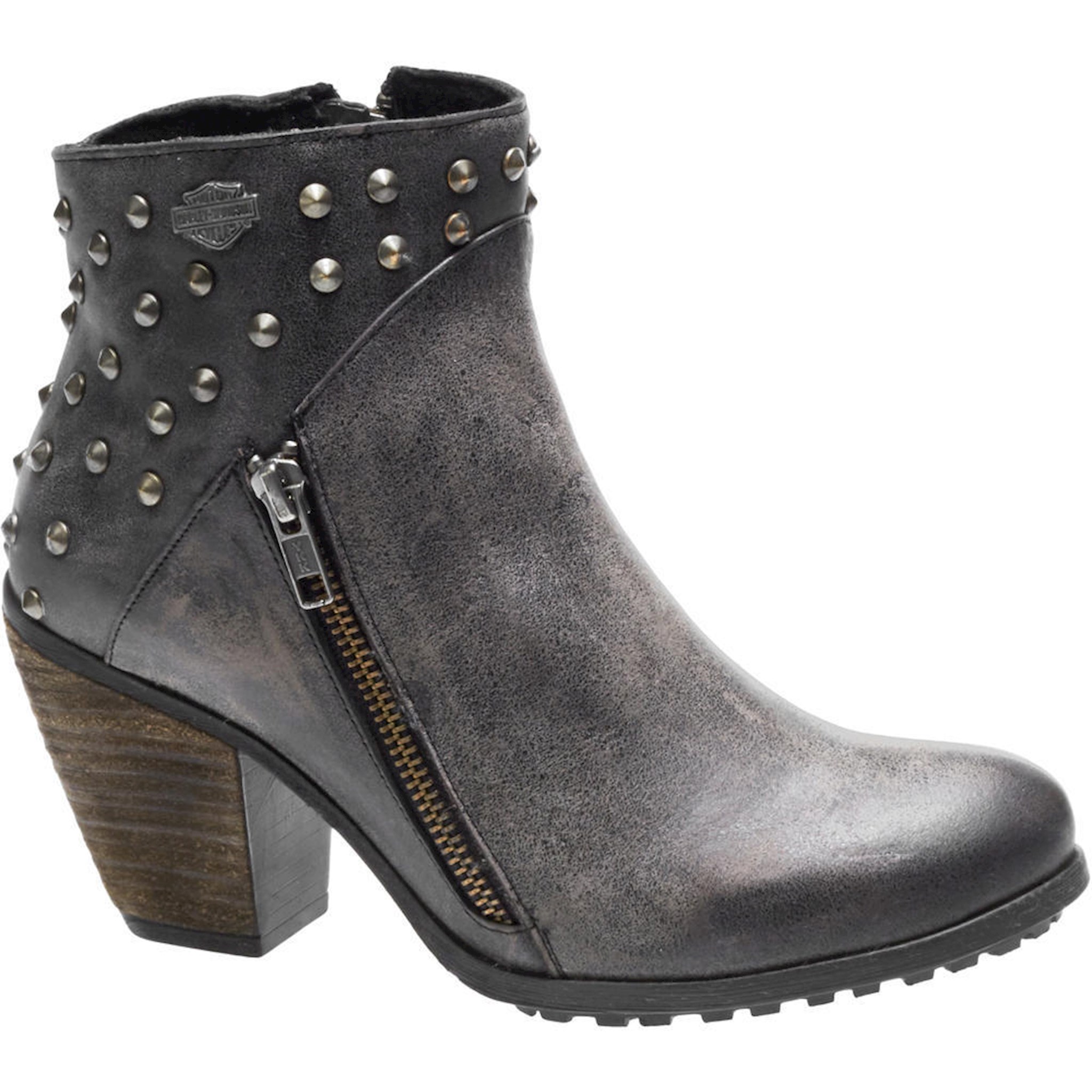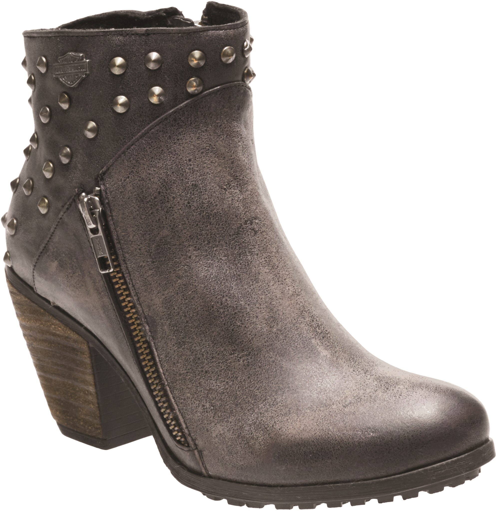 Step into freedom with this studded style. The women's Wexford bootie features distressed full grain leather and enough H-D® edge to snap necks. A sassy yet sturdy 3" heel gives you the look you've been craving for your off the bike style. • Full grain leather upper • Pig skin lining • YKK® locking inside zipper • Cement construction • Rubber outsole • *Leather distressed for unique appearance • Made in Mexico • Shaft Height: 3.75 • Heel Height: 3
