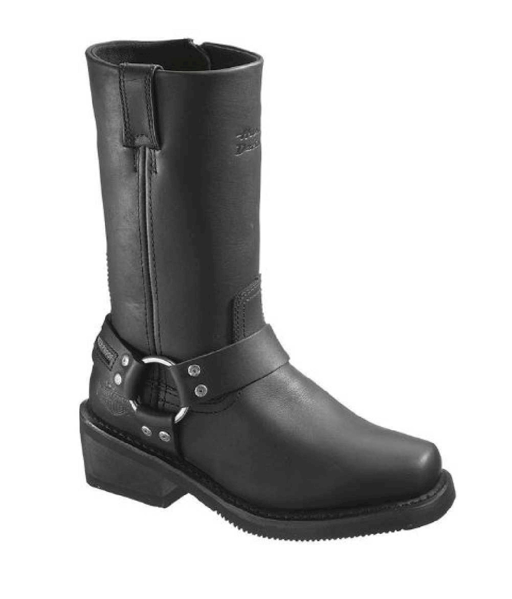 Harley-Davidson® Women's Performance, Riding Appropriate* Hustin waterproof black leather motorcycle harness boots. Made with Hydro-Guardâ„¢ waterproof membrane, an effective waterproof membrane that protects the foot from the discomfort of water soaking through the boot. Waterproof full grain leather uppers along with a full length cushion sock lining for hours of comfortable wear, standing, or walking. Front and back fashion straps attached to O-Ring on sides. Embossed Harley® Bar & Shield Logo badging on sides of heels. YKK® locking inside zippers allow for easy putting on and taking off. Total Height 12.25". Shaft height: 10.25", Heel height: 2". Finished with oil-resistant rubber outsoles for comfortable riding, standing, or walking. The boot's sole, insole and upper are bound using resoleable Goodyear® Welt construction processes, the most labor intensive and durable construction method available.