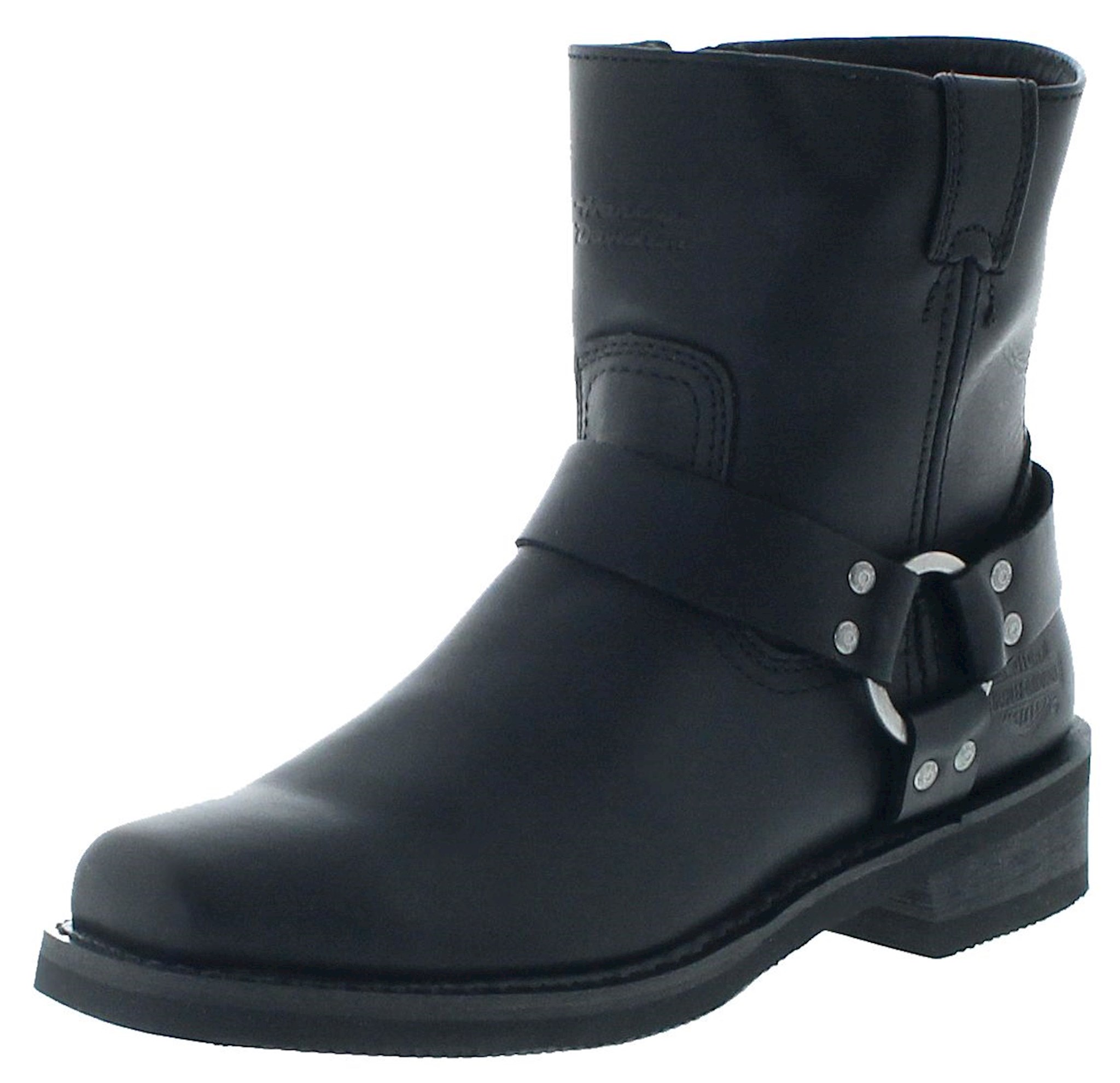 Harley-Davidson® Riding Appropriate* Men's black leather motorcycle El Paso harness boots. The classic motorcycle boot gets a mini-makeover, courtesy of Harley-Davidson. Uppers made from full grain leather with an oil-resistant rubber outsole. The boot features a comfortable full-length soft cushioned lining affording hours of fatigue-free wear. Shaft height: 7", Heel height: 1.5". They also feature inside zippers for ease of putting on and taking off. The boot's sole, insole and upper are bound using Goodyear® Welt construction processes, adding years of use with proper care. Manufacturer Part Number D94422. *Riding Appropriate-Welt construction, abrasion and oil-resistant, re-soleable footwear ideal for riding motorcycles.