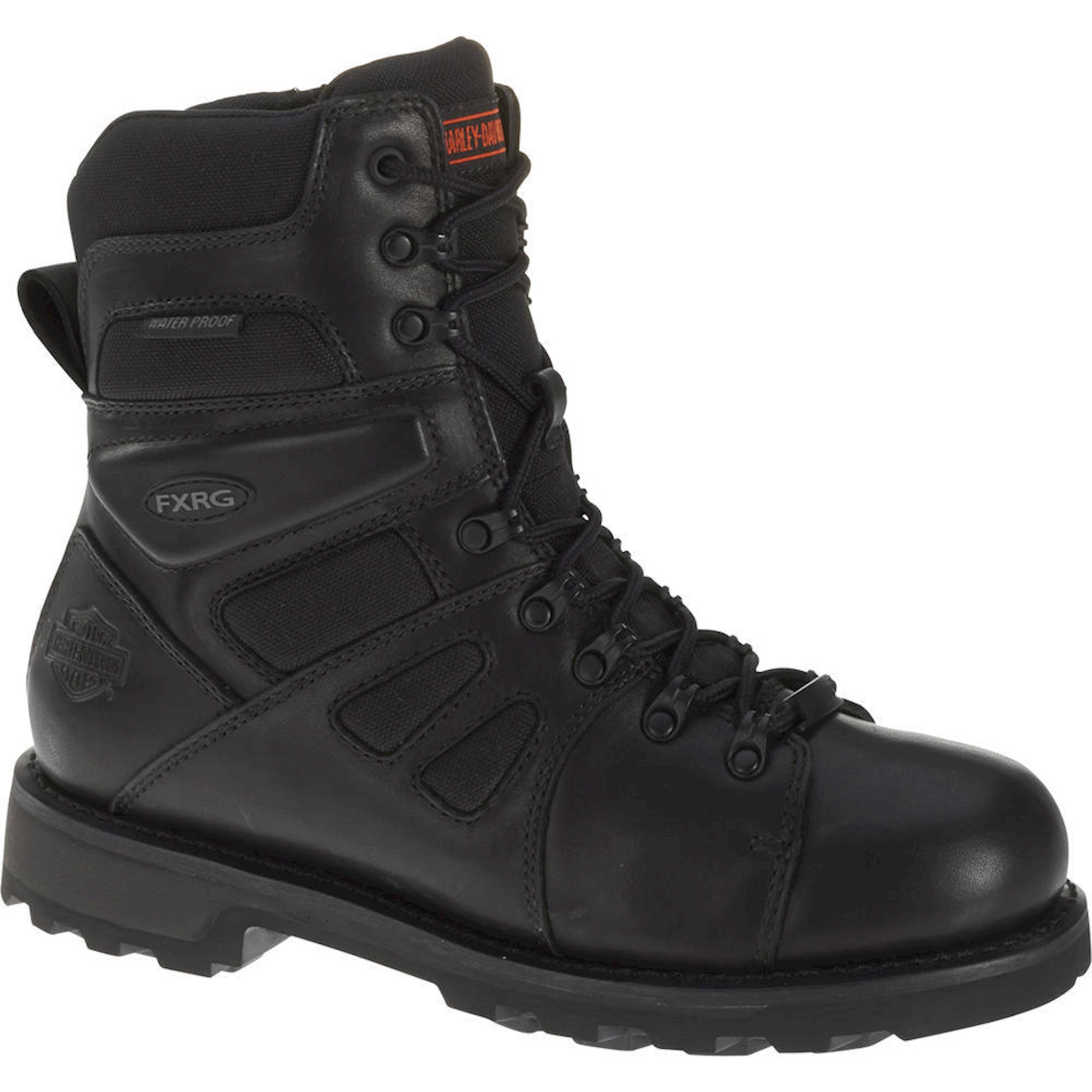 Harley-Davidson® Riding Appropriate Men's FXRG-3 black leather waterproof motorcycle boots. Full grain oiled waterproof leather upper with Cordura® breathable underlays. Patented Twin-Pad Comfort Technology cushions the foot and absorbs shock with each step for increased comfort. Highest quality waterproof and completely breathable membrane to keep your feet dry and comfortable in all weather conditions. Embossed Harley-Davidson® Bar & Shield on heels. FXRG badging on sides. Harley® Orange badging on tongue. Shaft height: 7", Heel height: 1.5". Features industry's best YKK® locking inside zippers for ease of putting on and taking off. Lightweight, flexible polyurethane midsole with rubber on the street side means hours of walking, standing and riding comfort. The boot's sole, insole and upper are bound using resoleable Goodyear® Welt construction processes, the most labor intensive and durable construction method available.