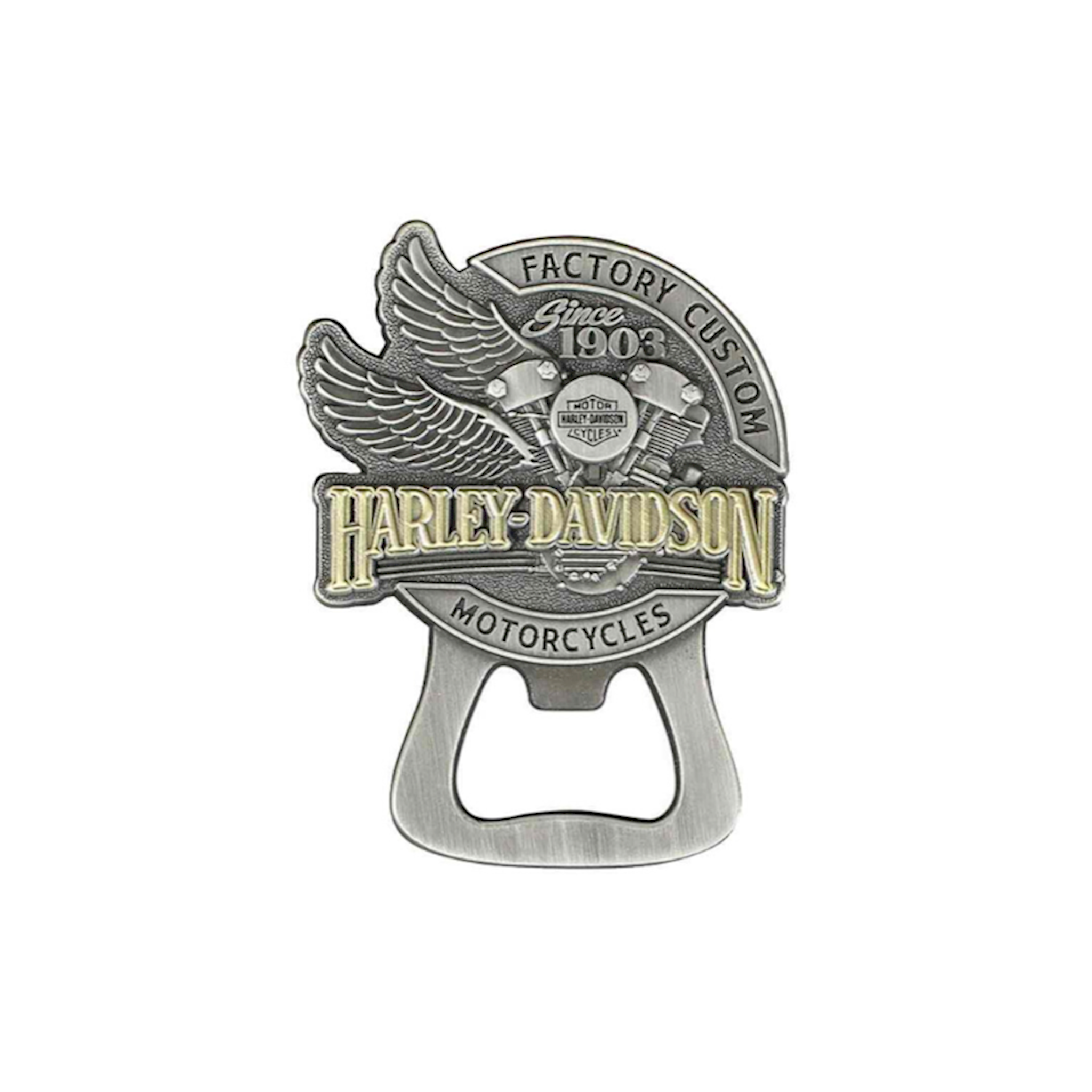Antique silver and gold finish. 3D Die Cast. Heavy relief with bottle opener. Features an awesome winged V-Twin engine graphic. Size: 2.25" W x 2.75" H.