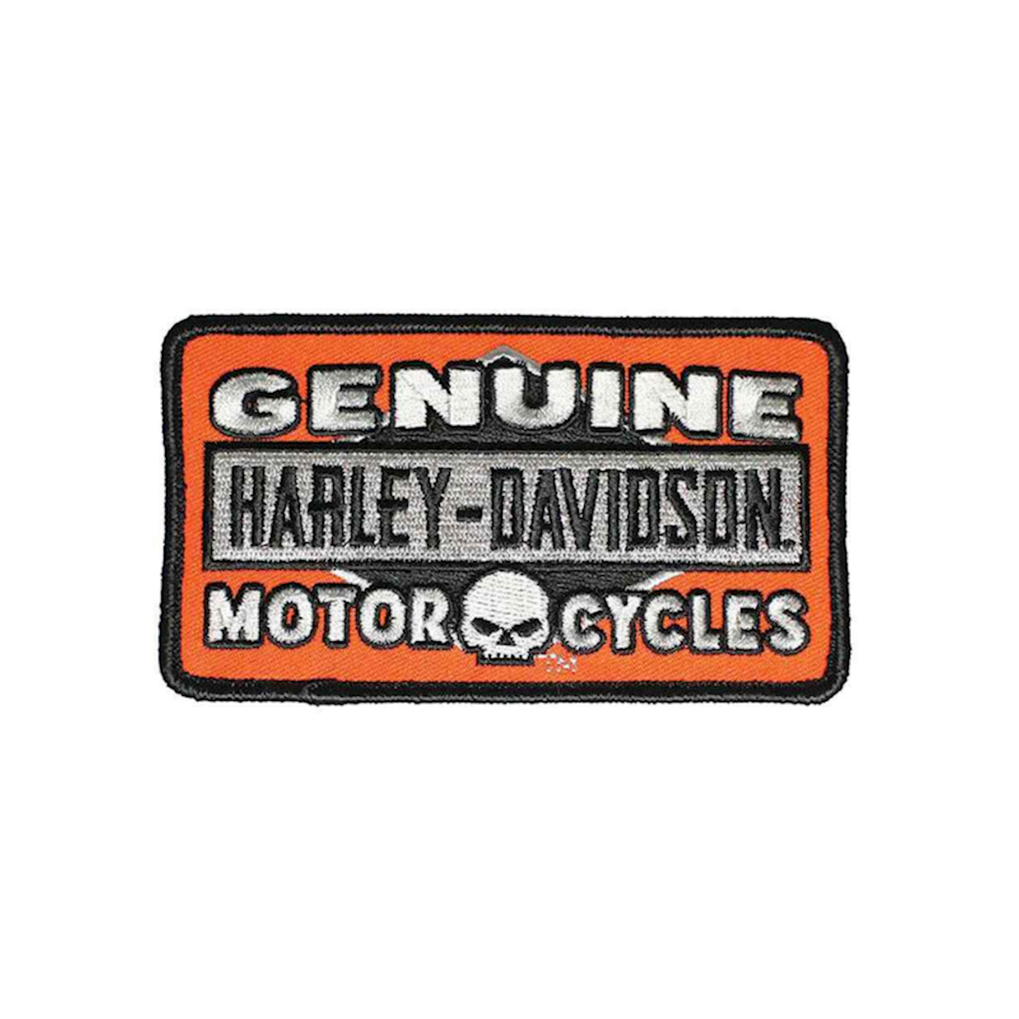 Harley-Davidson® Genuine Skull Emblem. Small size patch. Features awesome standout embroidered Genuine Harley-Davidson® script with a classic Willie G Skull logo. Black, Silver & Orange.