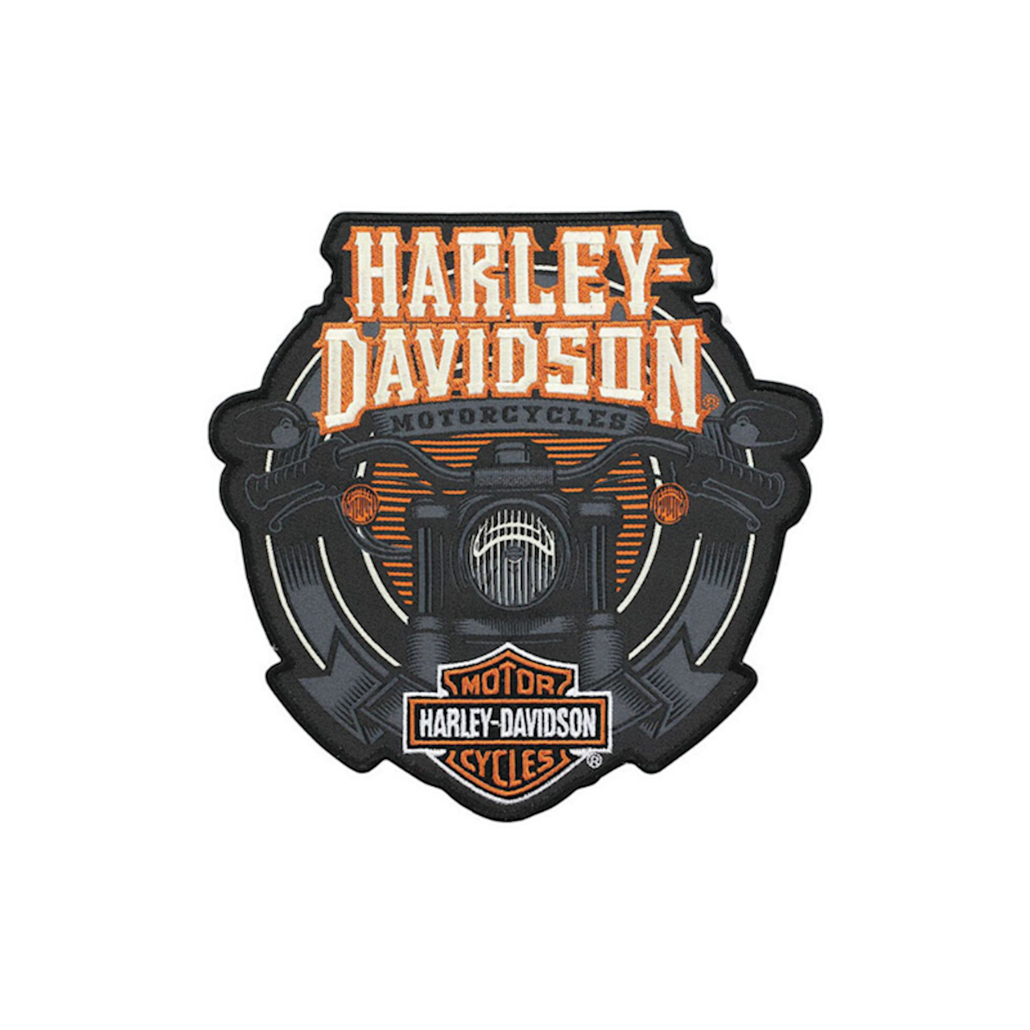 Harley-Davidson® Embroidered Handlebars with Bar&Shield Emblem Patch. Medium size patch. Awesome embroidered famous Bar & Shield logo in black with orange sign. Size: 6.7" W x 6,7" H. Black.