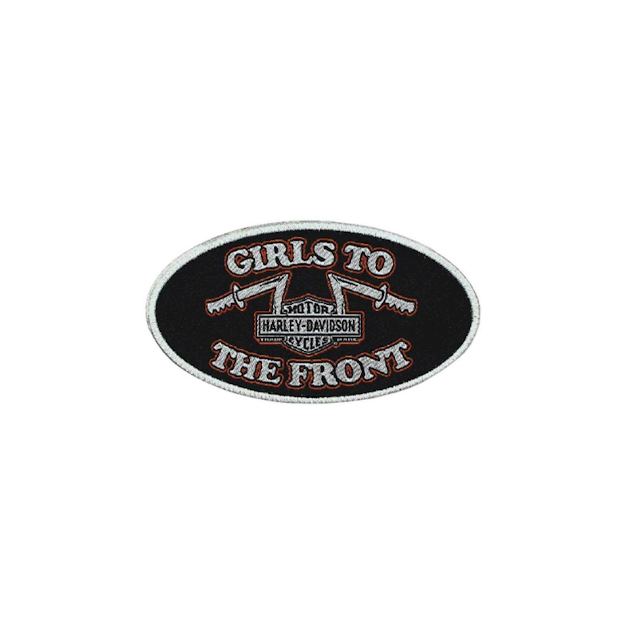 Harley-Davidson® Embroidered Girls To The Front Emblem, EM281662. Features a famous, embroidered Bar & Shield logo. Small size patch. Size: 4.125'' W x 2.25'' H. Great looking patch to be sewn on the back of your vest or jacket.