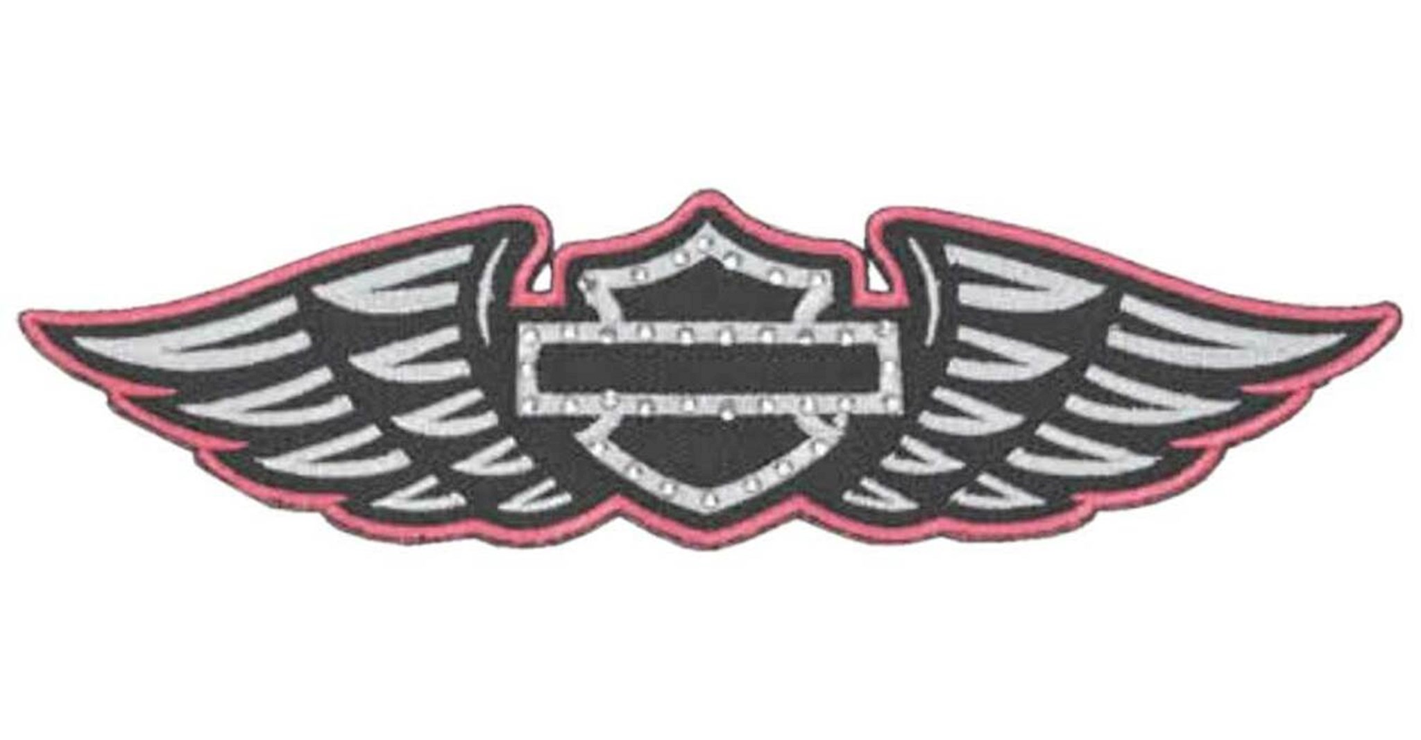 Harley-Davidson® Winged B&S Emblem Patch, EM348633. Adorable winged Bar & Shield logo woven patch accented with rhinestone embellishment. Gray with contrasting pink trim. Medium size patch. Size: 6'' W x 1.625'' H. Great looking patch to be sewn on the back of your vest or jacket.
