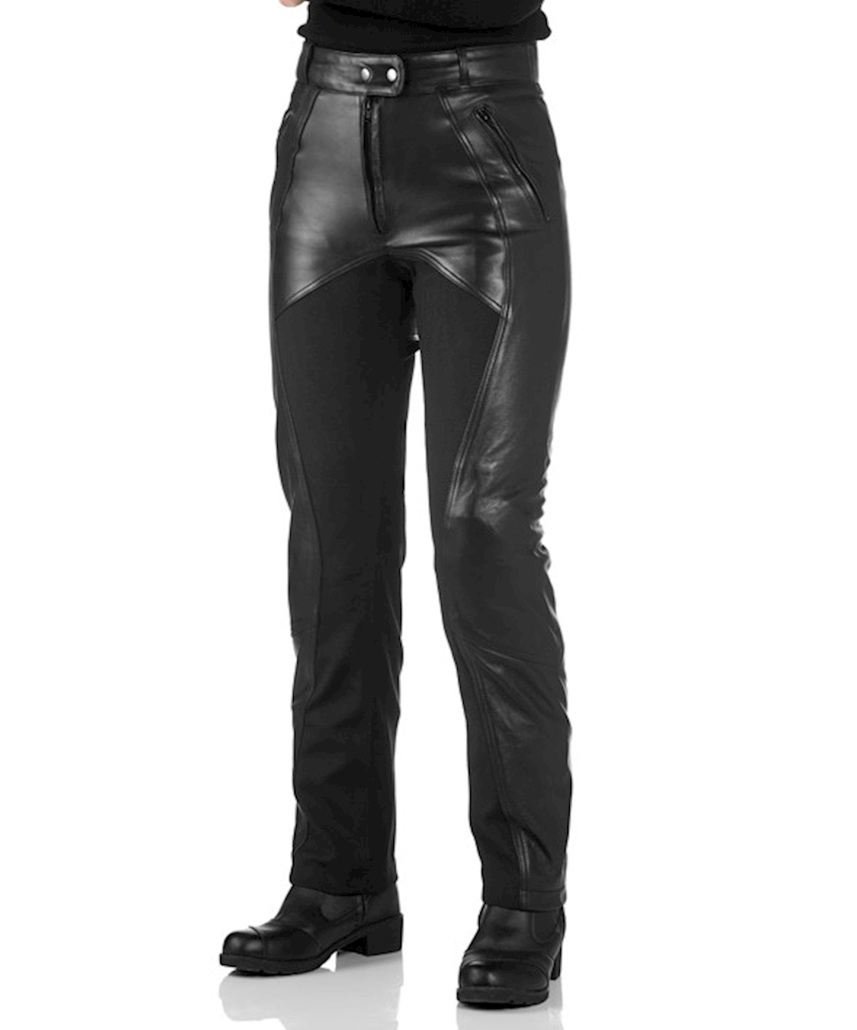 Protection: Knees: tested according to standard: EN1621-1: 2012, Level 1. Product features: Ladies trousers in leather with textile comfort zones. Height-adjustable knee protection. High waist.