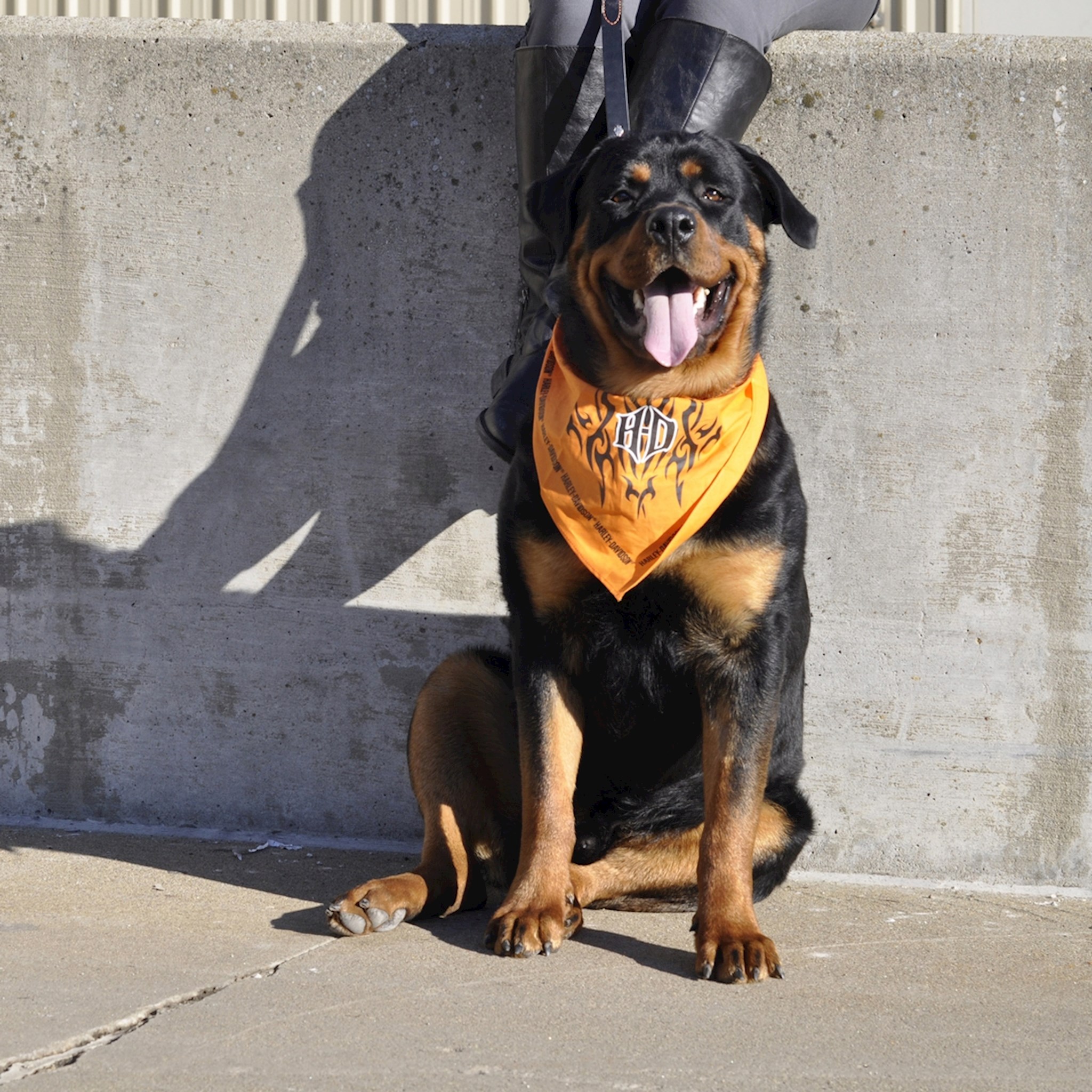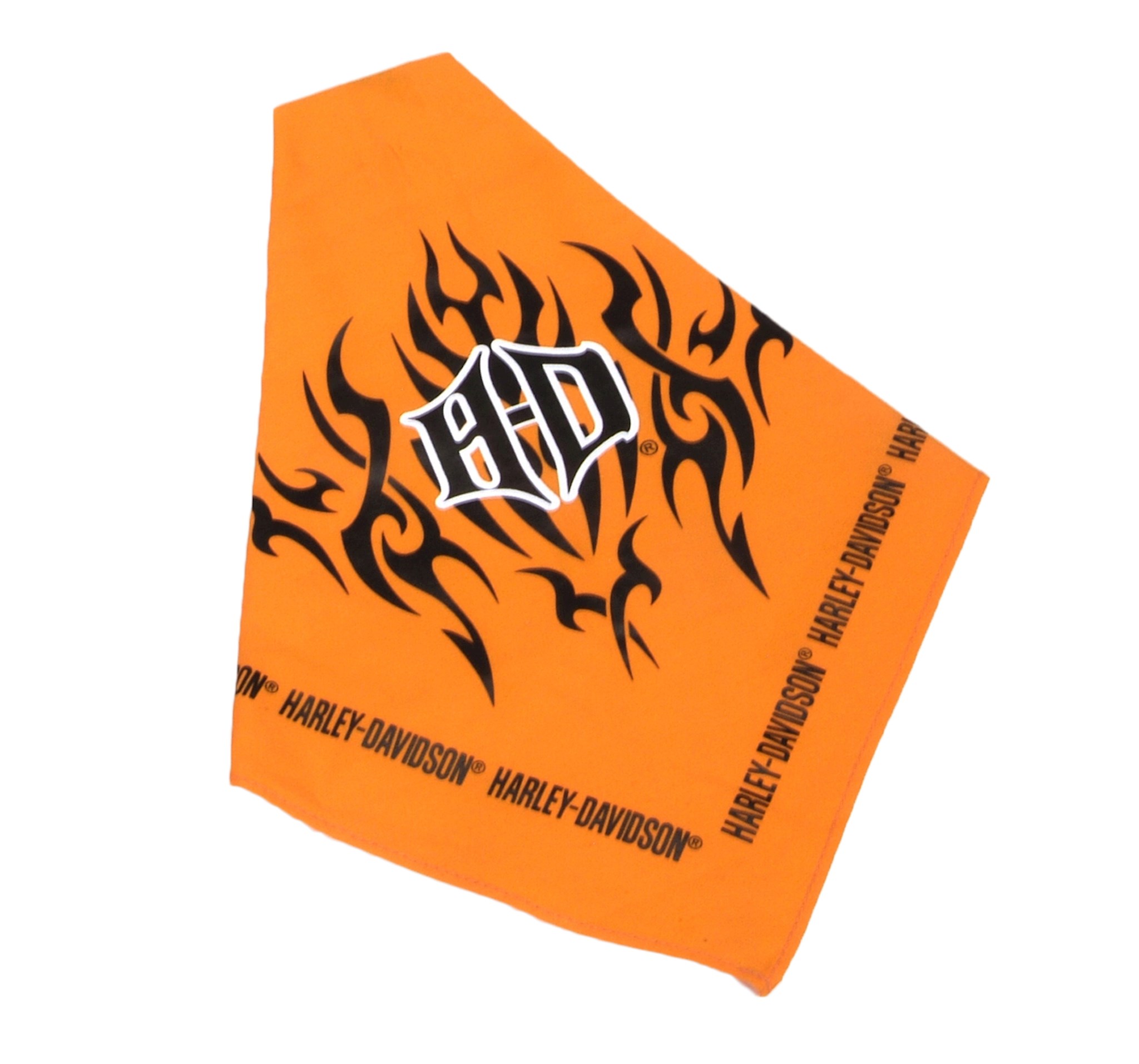 Harley-Davidson® tribal flames pet bandana Made of orange cotton blend. Features tribal flame design. Finished rolled edges sewn for extra durability.