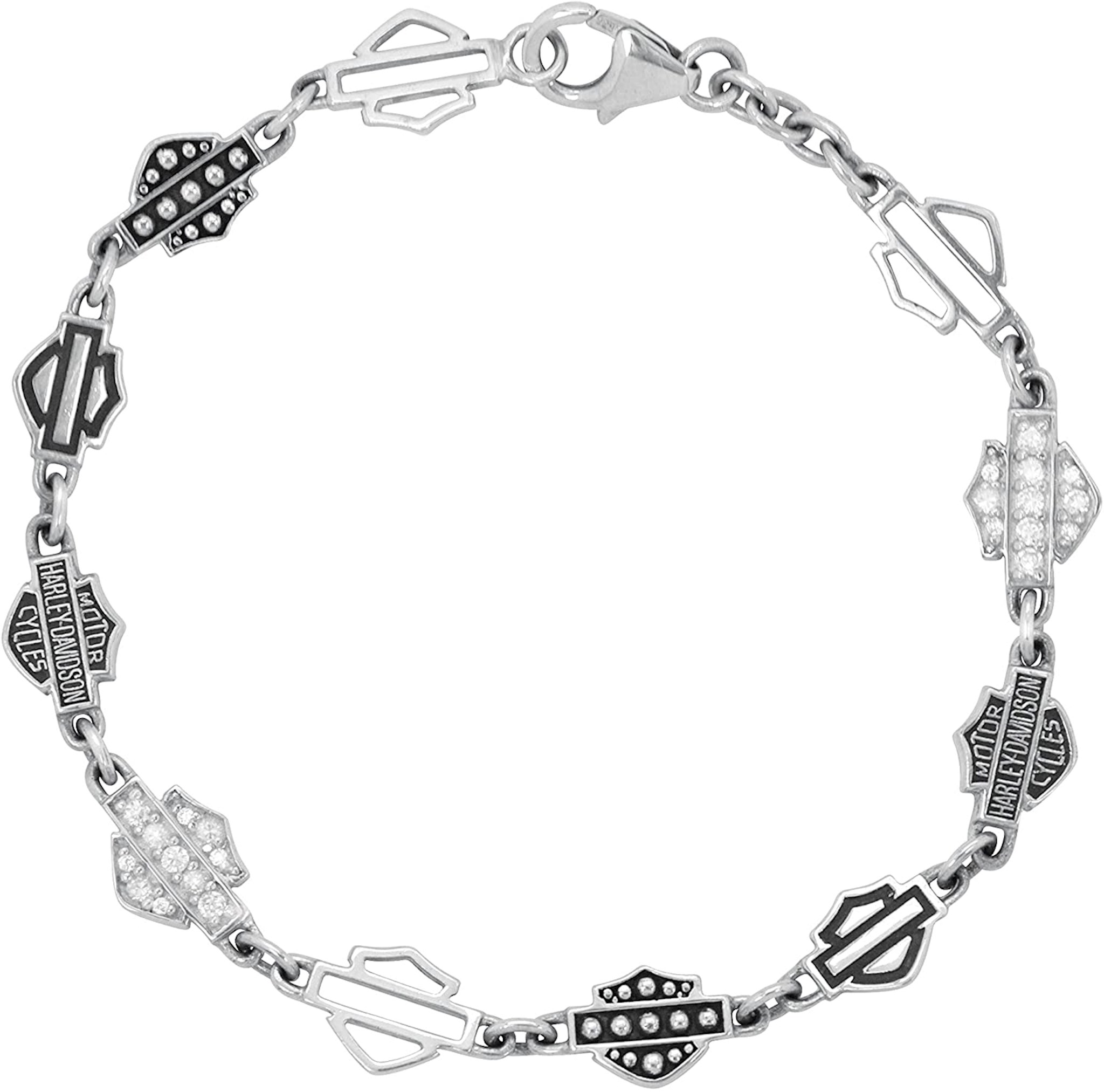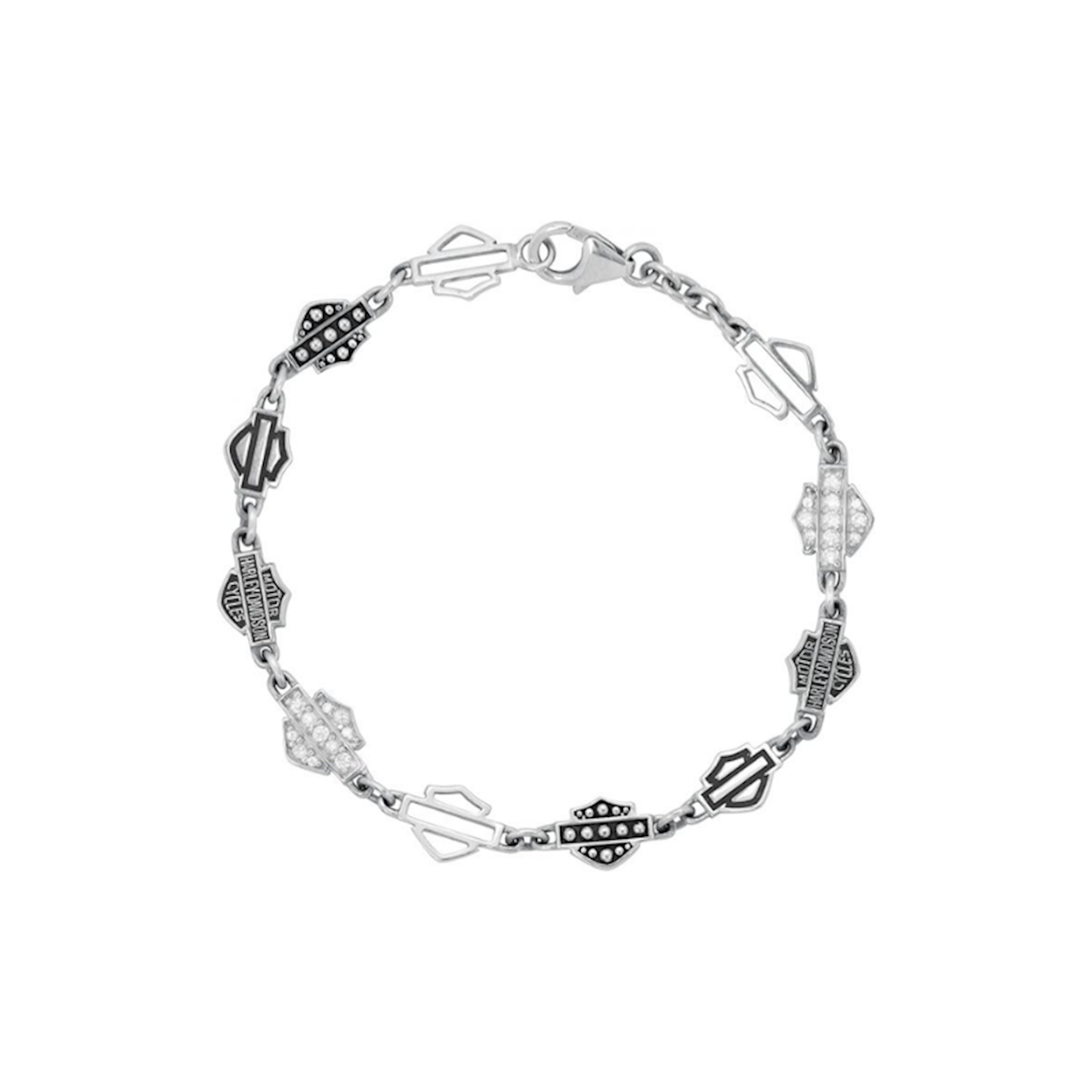 Harley-Davidson® Women's Multi Bar & Shield Chain Bracelet, HDB0235. Features beautiful repeated Bar & Shield logos in different designs. Made of Sterling Silver. Mod Jewelry is hand crafted with the highest attention to detail and quality, utilizing the finest materials