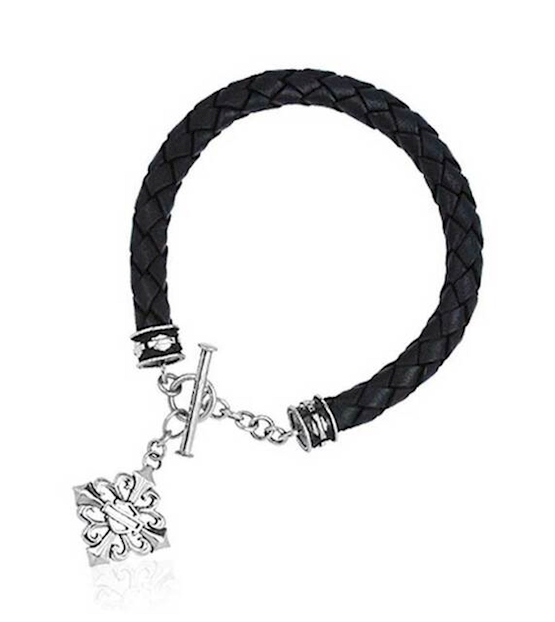 Harley-Davidson® Women's Ornamental Cross Leather Braided Bracelet. Features Bar & Shield cross outline logo dangle charm. Size: 7'' bracelet.