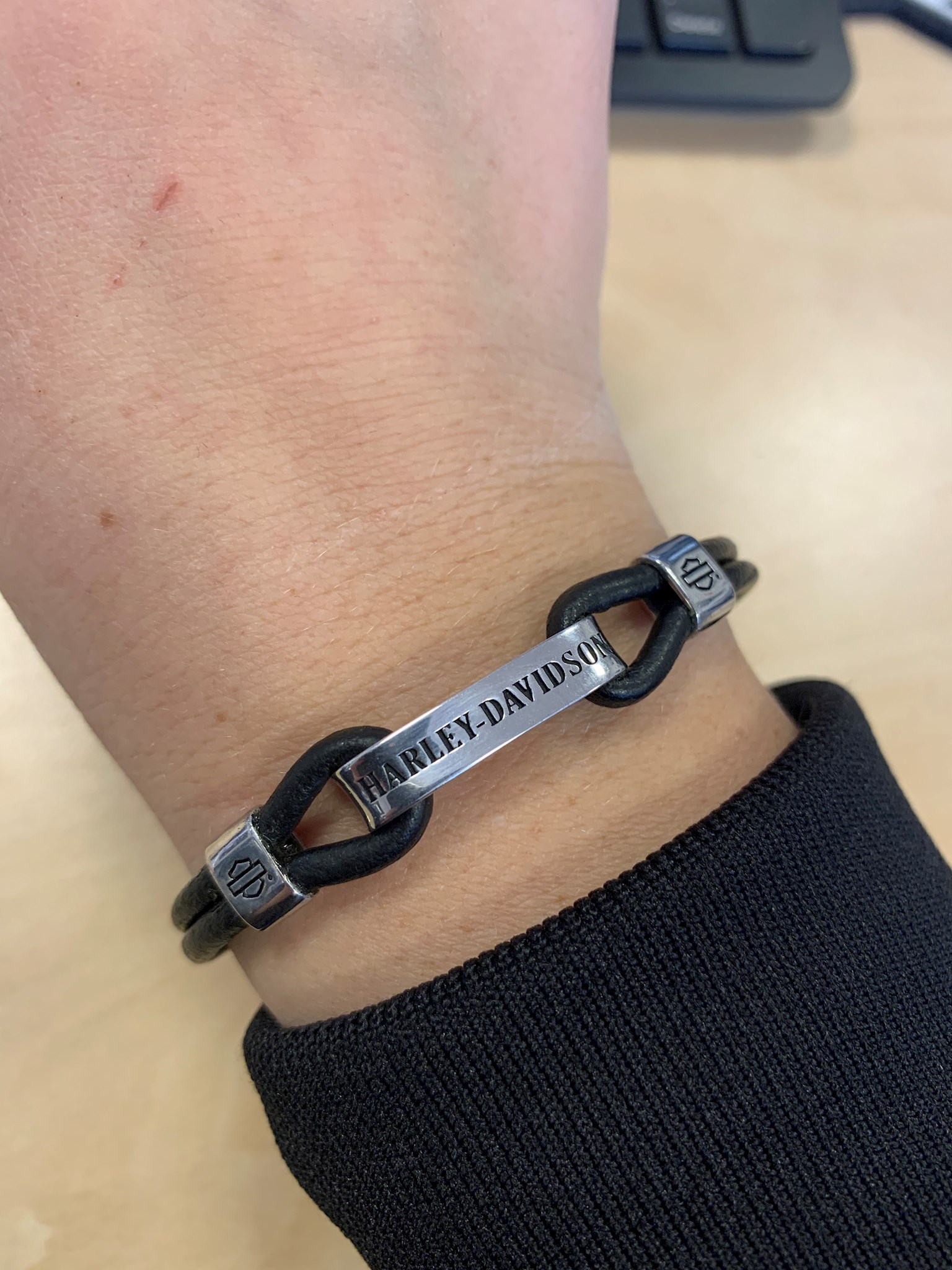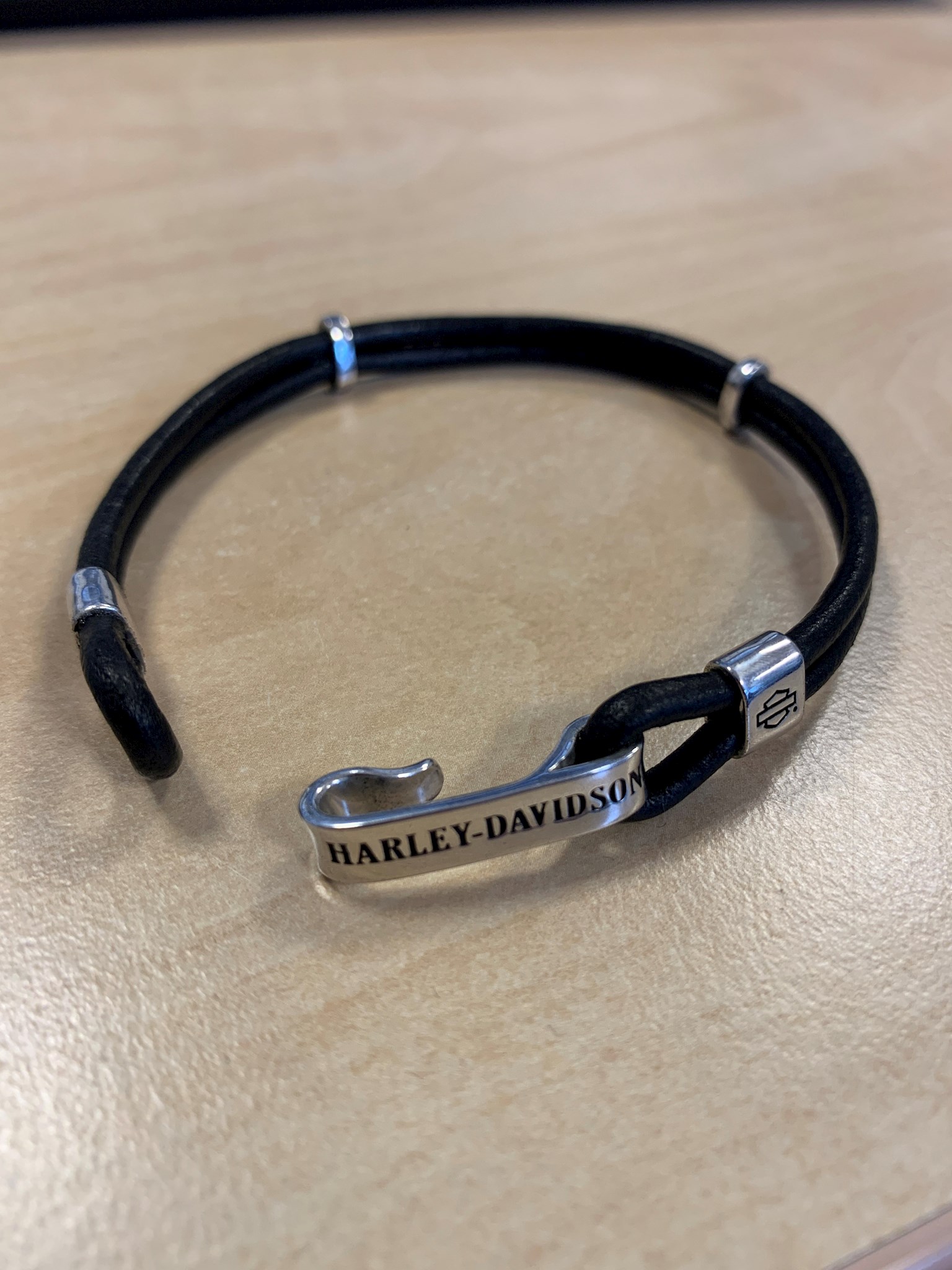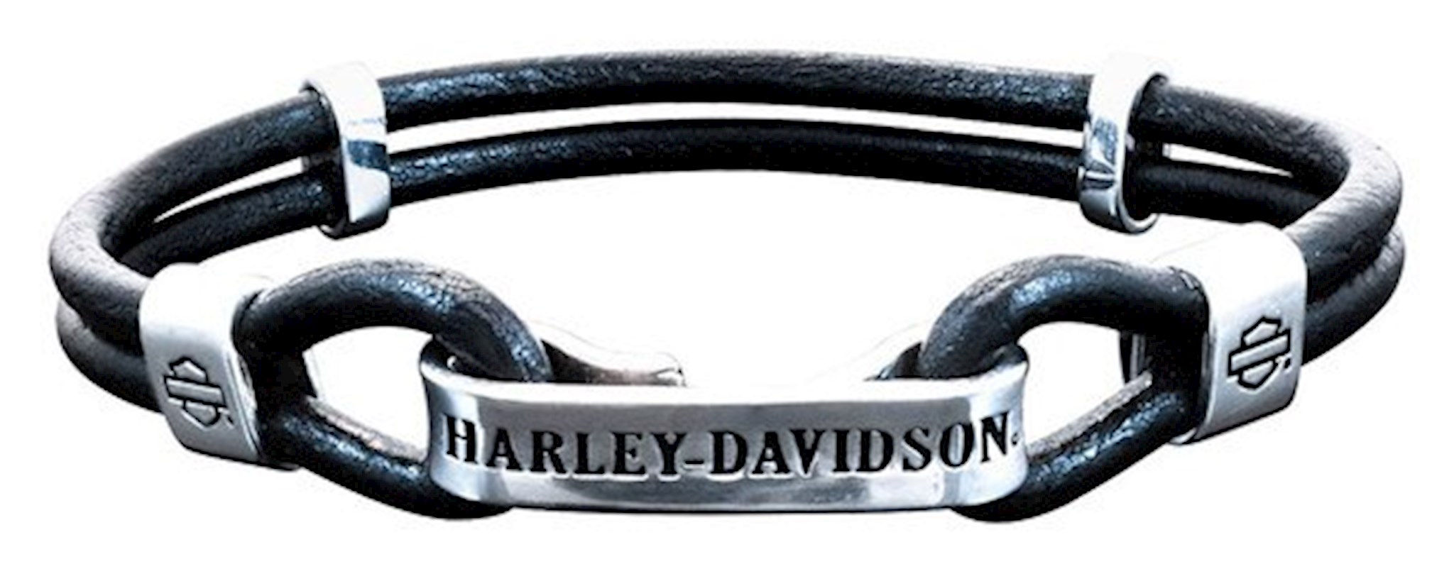 Harley-Davidson® Women's Black Leather Double Hook Plate Bracelet, HDB0348. Double leather band bracelet detailed with Sterling Silver rings supporting a classic Bar & Shield logo. Constructed from genuine leather, and Sterling Silver. This bracelet will hold up ride after ride. Hand crafted with the highest attention to detail and quality.