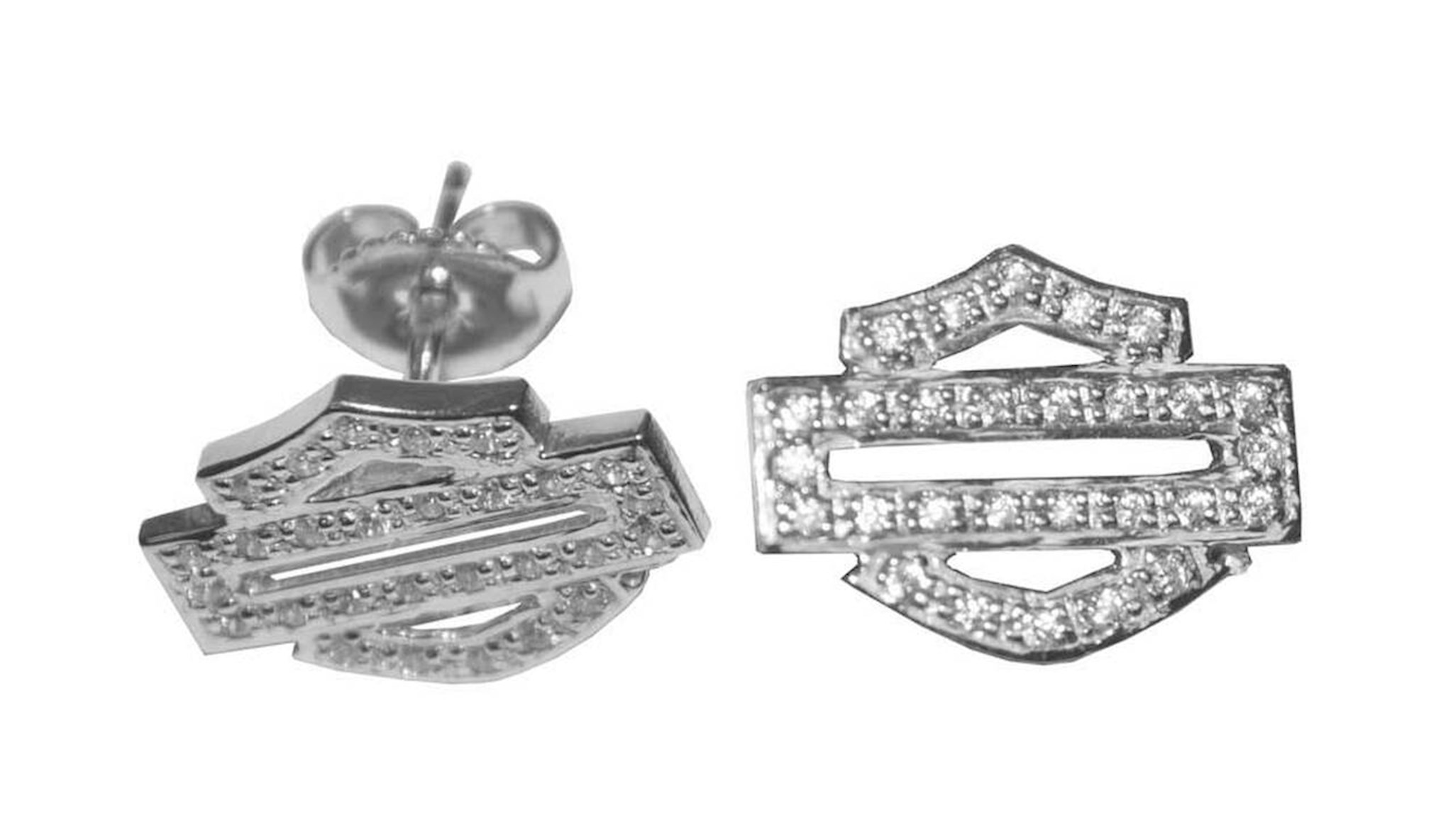 Harley-Davidson® Women's Bling Bar & Shield Outline Post Earrings, HDE0384. These earrings are hand-crafted with the highest attention to detail and quality, utilizing the finest materials. Features silver bling Bar & Shield logos. Sterling sliver earrings.
