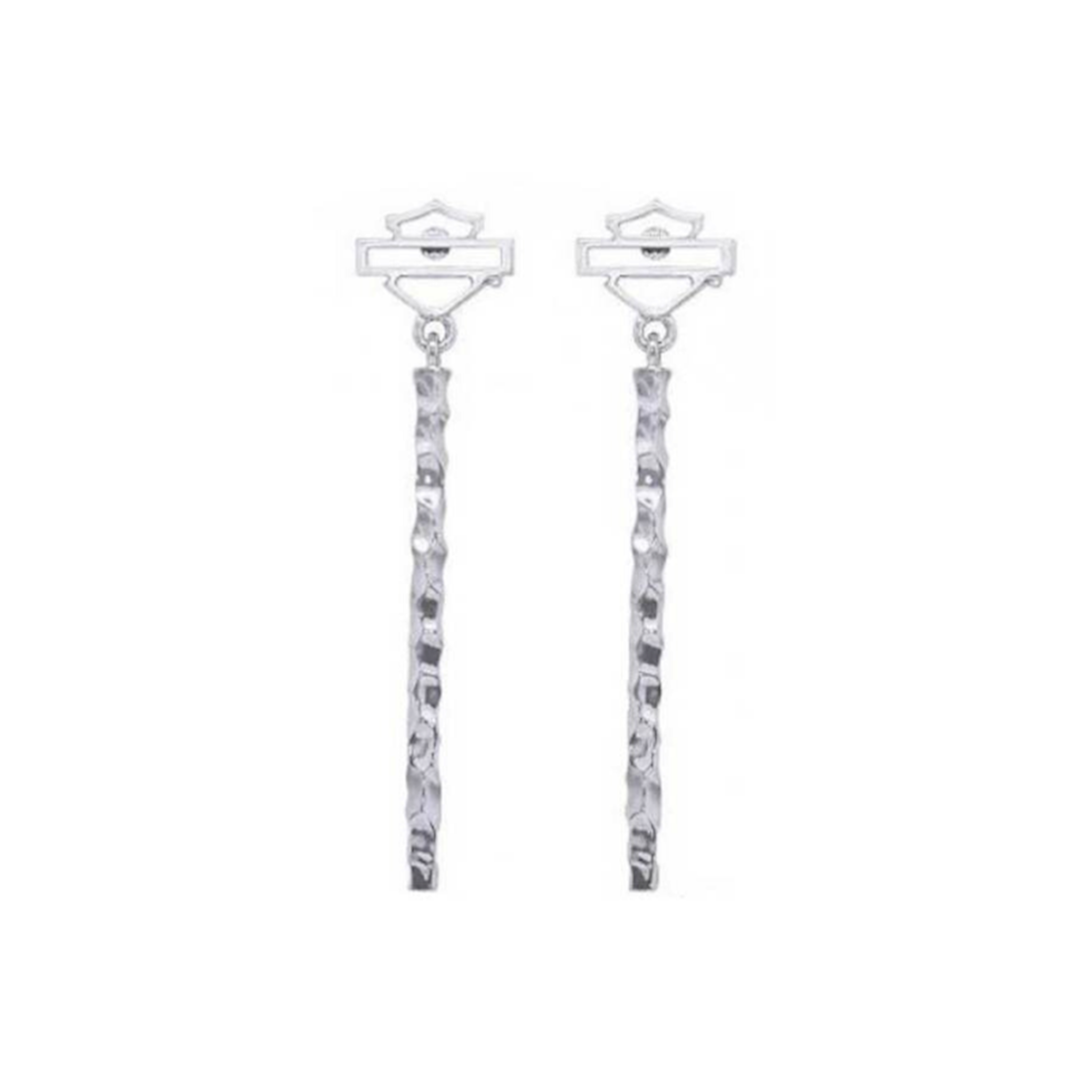 Harley-Davidson® Women's Hammered B&S Drop Earrings. Constructed from high-quality shiny Sterling Silver. Stunning time-less Bar & Shield logo and dangling hammered accents. These earrings are hand-crafted with the highest attention to detail and quality, utilizing the finest materials. Wear these earrings for instant shine.