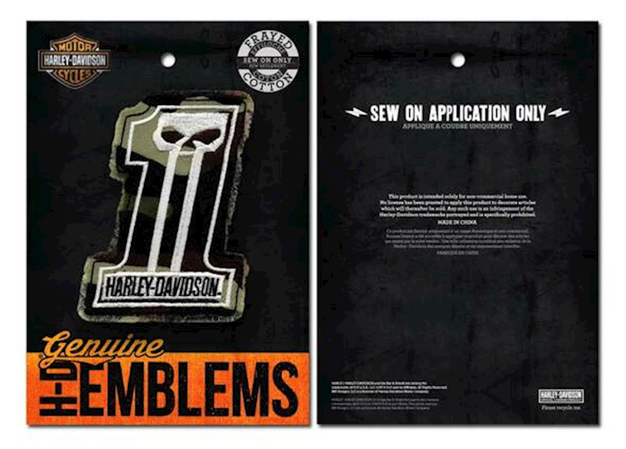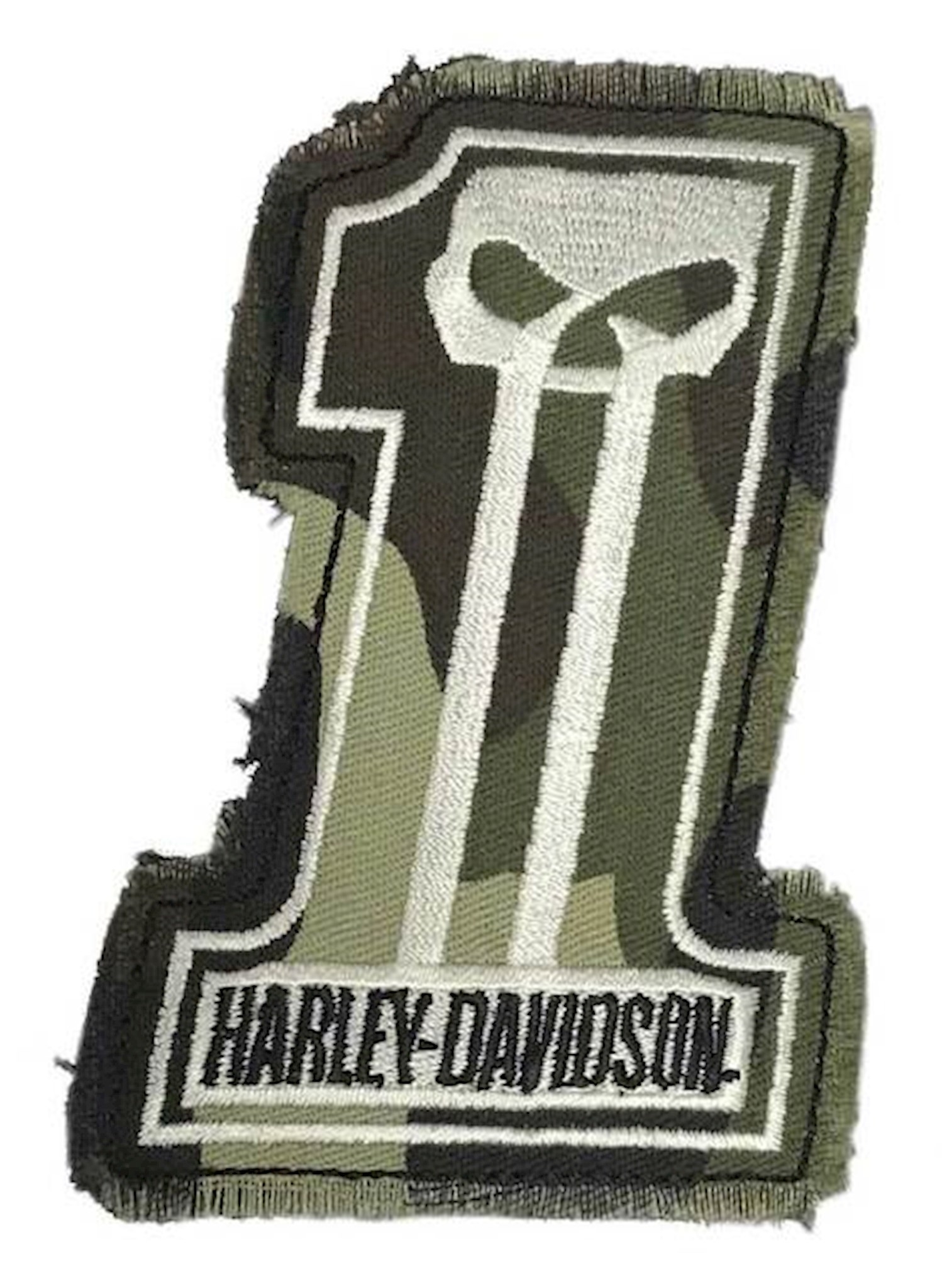 Harley-Davidson® Embroidered Dark Custom Camo #1 Skull Frayed Emblem Patch, HDEMF1021. Awesome embroidered dark custom #1 skull logo with camouflage pattern and frayed edges. Great looking cotton patch to be sewn on the back of your vest or jacket. The perfect size, 4" x 3".