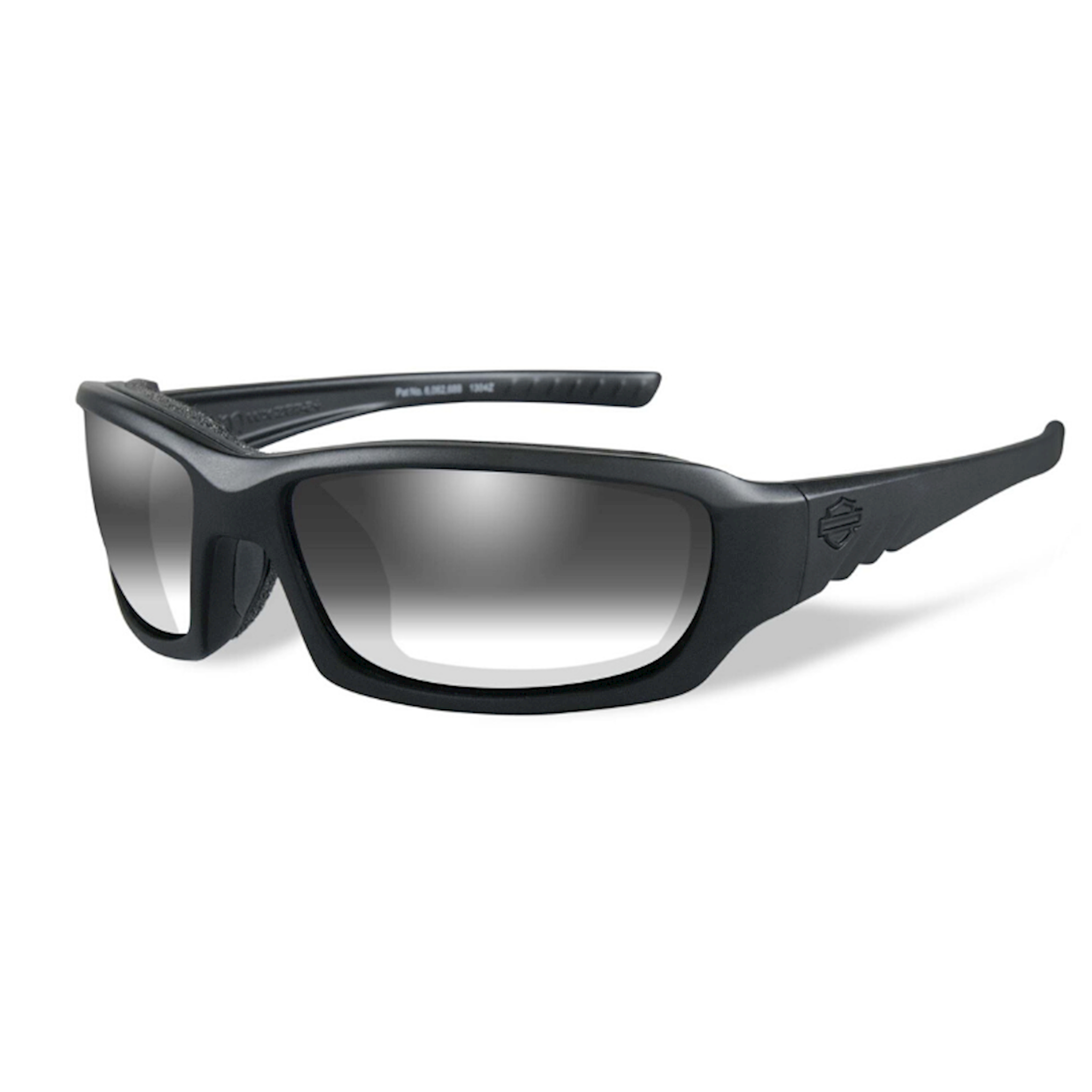Harley-Davidson® Men's Gem LA® Light Adjusting Sunglasses, HDGEM03. Part of the Climate Control Series. LA Light Adjusting smoke gray lenses with a matte black frame. Features a sculpted silhouette Bar & Shield® logo black medallion on both temples. Eyewear meets ANSI Z87 high velocity impact and high mass impact requirements. This means they are able to withstand 20 .25 caliber steel projectiles fired at 150 FPS and a 1.1 lb. projectile dropped from 50". No other eyewear offers riders this level of certified protection. Removable soft foam Facial Cavity Seal, seal blocks out wind, dust, debris and cold to keep your eyes well protected and tear free. As a global leader in eyewear performance technology, we understand that for eyewear to perform at a high level, it must first and foremost fit comfortably and securely. Fits head sizes medium and large. LA Light Adjusting Smoke Gray Lenses: The most convenient lens darkens bases on the amount of UV radiation present. As the sun becomes lower on the horizon (early morning, late afternoon or dusk) the atmosphere filters the UV radiation and lenses transmit more light to the eye. Because of the optical clarity, these lenses are ideal for riding from dusk into the night. Many riders chose the convenience of having a single glass with LA Light Adjusting lenses for both day and night riding. Eyewear includes: Semi-hard zippered case, leash cord and cleaning cloth. Size: 63-19-114. Wiley X® is a licensed Harley-Davidson® manufacturer. Wiley X® sunglasses have been standard issue for the FBI, DEA, and Special Forces troops. If you want the best, trust the Harley-Davidson® and Wiley X® team. Manufacturer Part Number, HDGEM03.