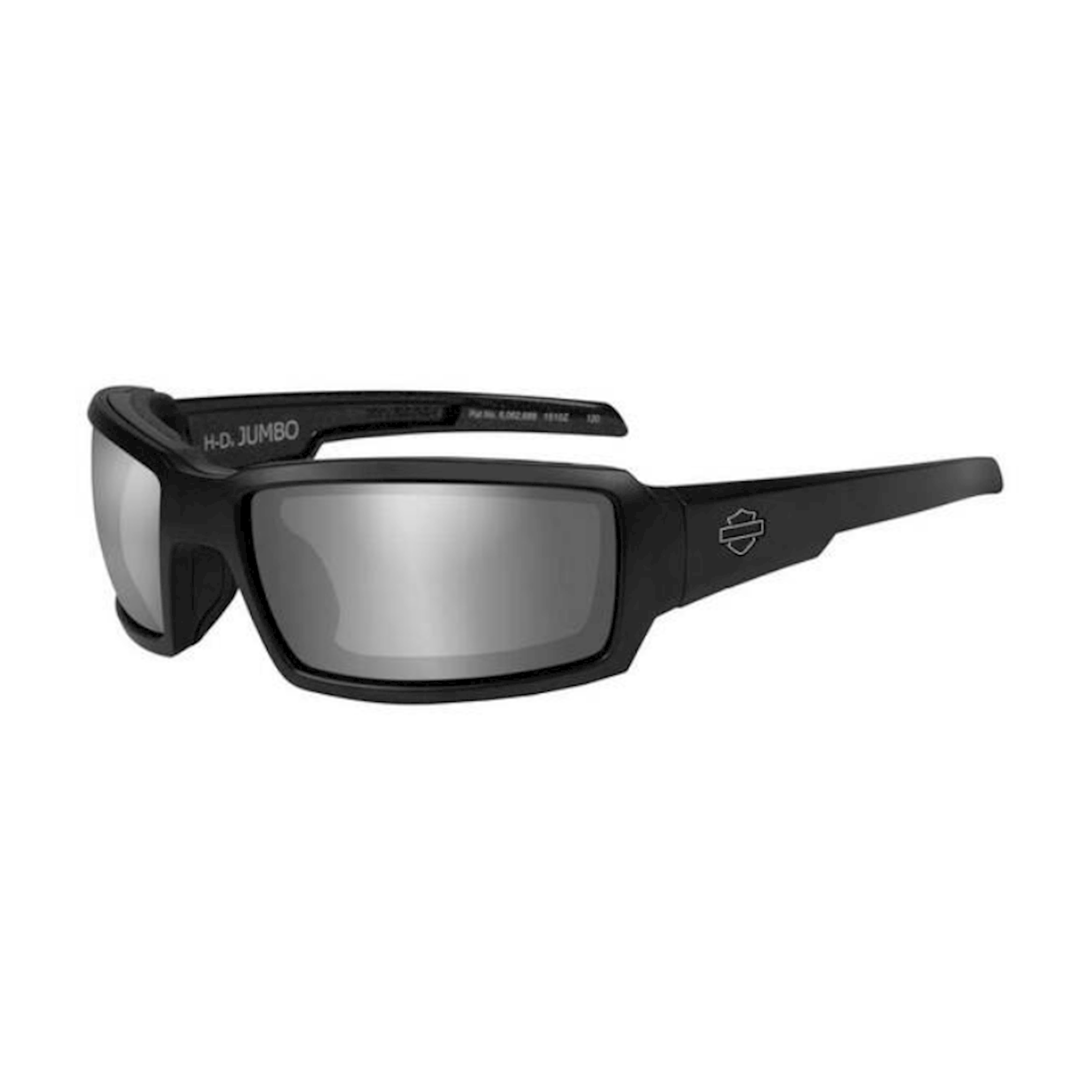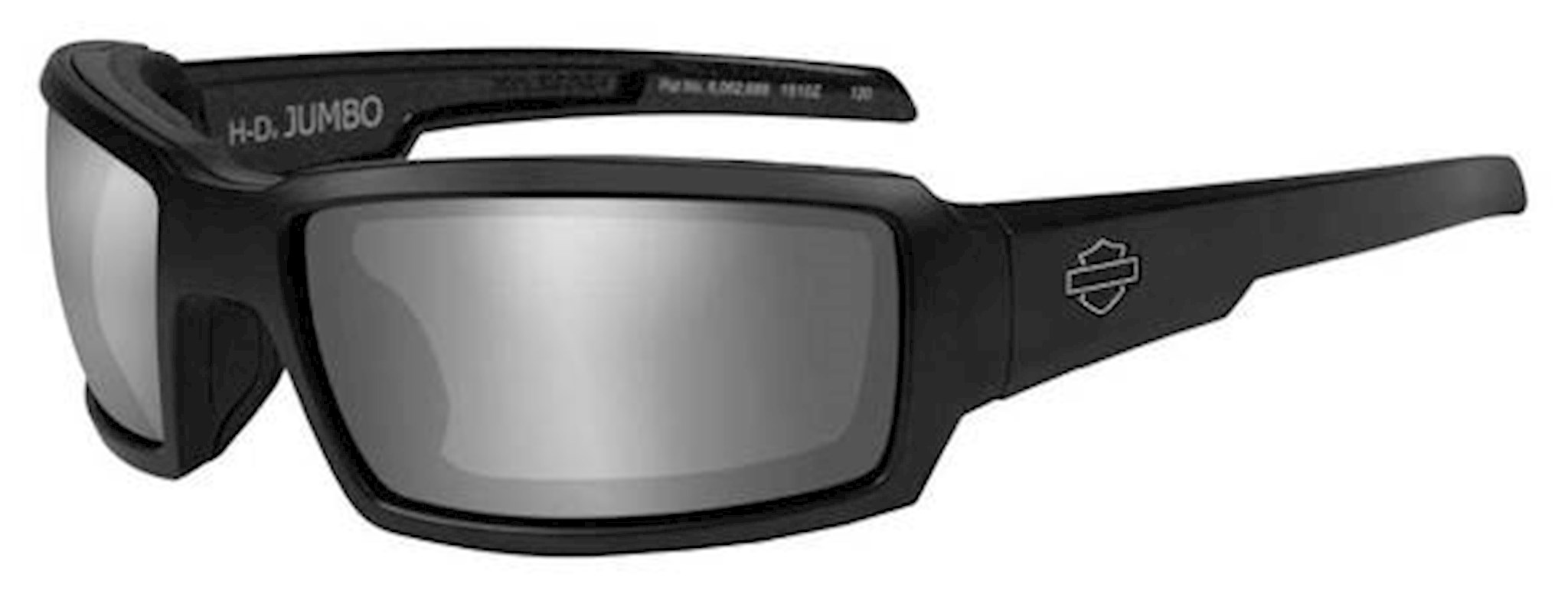 Harley-Davidson® Men's Jumbo Sunglasses, HDJUM04. Part of the Climate Control Series. Features a classic Bar & Shield emblem on both temples. PPZ Silver Flash smoke gray lenses with matte black magic frames. Removable soft foam Facial Cavity seals out wind, dust, debris and cold. Keeps your eyes well protected and tear free. Eyewear meets ANSI Z87 high velocity impact and high mass impact requirements. This means they are able to withstand 20 .25 caliber steel projectiles fired at 150 FPS and a 1.1 lb. projectile dropped from 50". No other eyewear offers riders this level of certified protection. Fits head sizes large, XXL. No other eyewear offers riders this level of certified protection. Specially designed Top Down Ventilation lets air flow through vents in the top of our Facial Cavity Seals and out the bottom. So when things heat up, the road ahead remains clear. Eyewear includes: Semi-Hard black zippered case, leash cord and cleaning cloth. PPZ Silver Flash smoke gray lenses, the ultimate day riding lens. PPZ is revolutionary technology and unique to the Harley-Davidson® brand. PPZ lenses deliver the benefits of traditional polarized lenses without obscuring road dangers including potholes, oil, ice and water. PPZ lenses eliminate the visual distortion patterns caused by traditional polarized lenses allowing the rider to read GPS devices, mobile phones and all gas pumps. Furthermore, PPZ lenses eliminate the rainbow effect behind a full-face shield or windscreen. The multi0layer silver flash coating buffers light transitions from light to dark and vice versa. Neutral gray in color, these lenses let you see the world without distorting color perception.