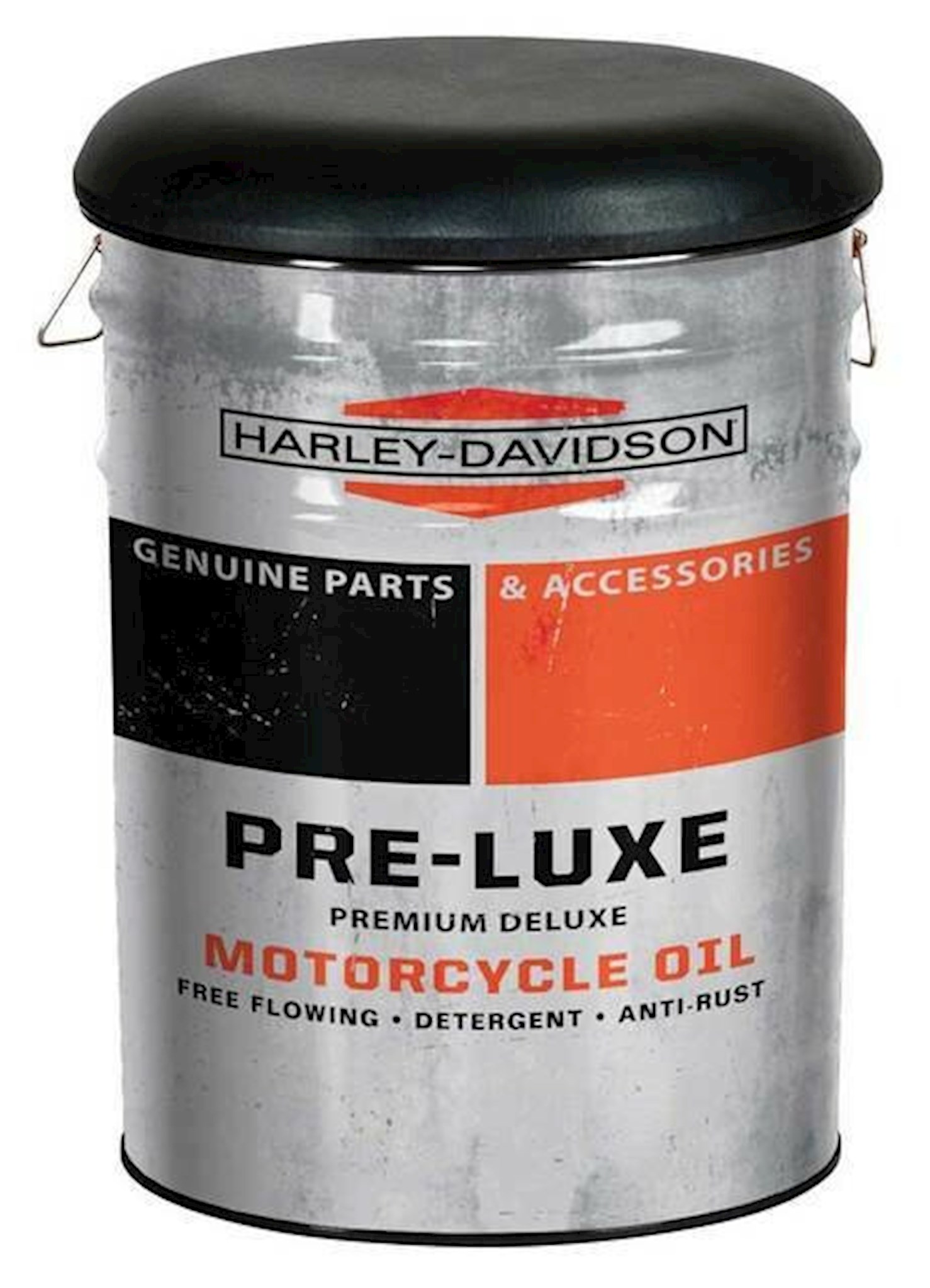 Harley-Davidson® Pre-Luxe Bucket Stool Steel barrel construction Distressed motor oil graphic Removable padded seat for extra storage space Size: 21.5" H x 15" Diameter