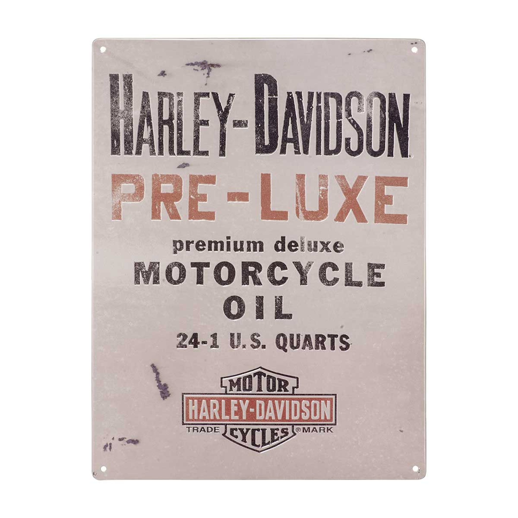 Pre-luxe Motorcycle Oil graphic reproduced as a tin sign. Embossed accents and vibrant colors add depth and dimension. Smooth edges for safe handling. Includes holes for easy hanging. Dimensions: 12" W x 15.75" H / 30 x 40 cm.