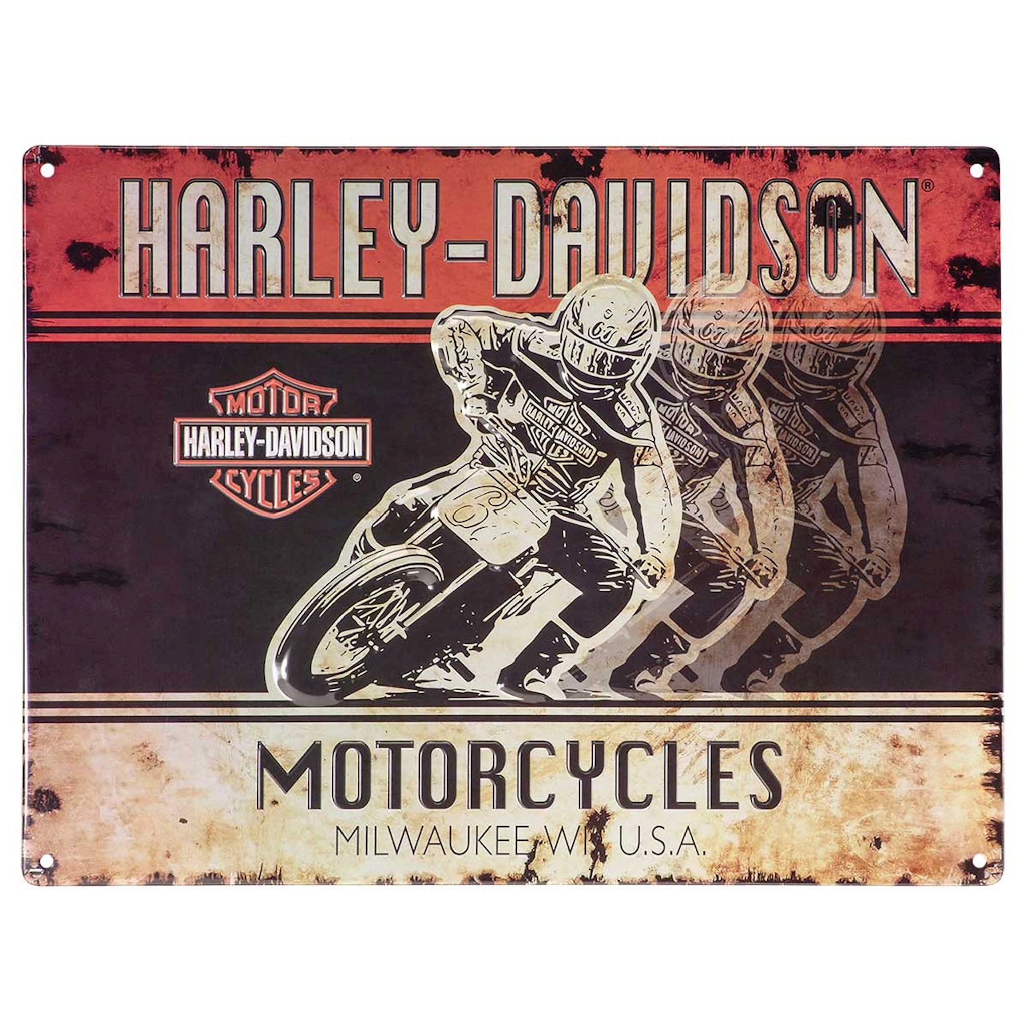 H-D Racers Tin Sign. Embossed accents and vibrant colors add depth and dimension. Smooth edges for safe handling. Includes holes for easy hanging. Dimensions: 15.75" W x 12" H / 40 x 30 cm.
