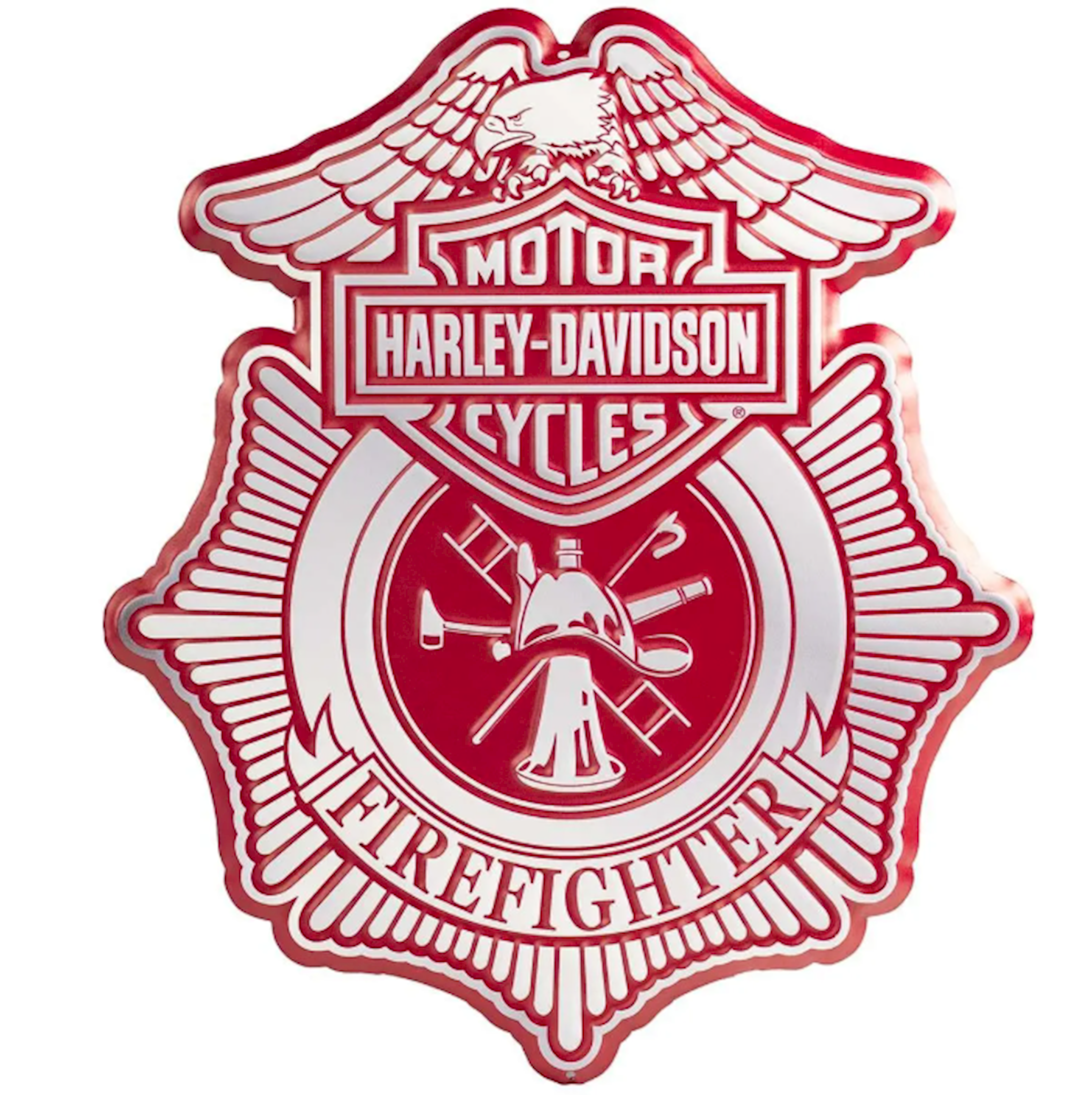 Custom shaped, embossed metal sign with H-D Firefighter Shield logo. Includes holes for hanging. Dimensions: 35 x 40 cm.